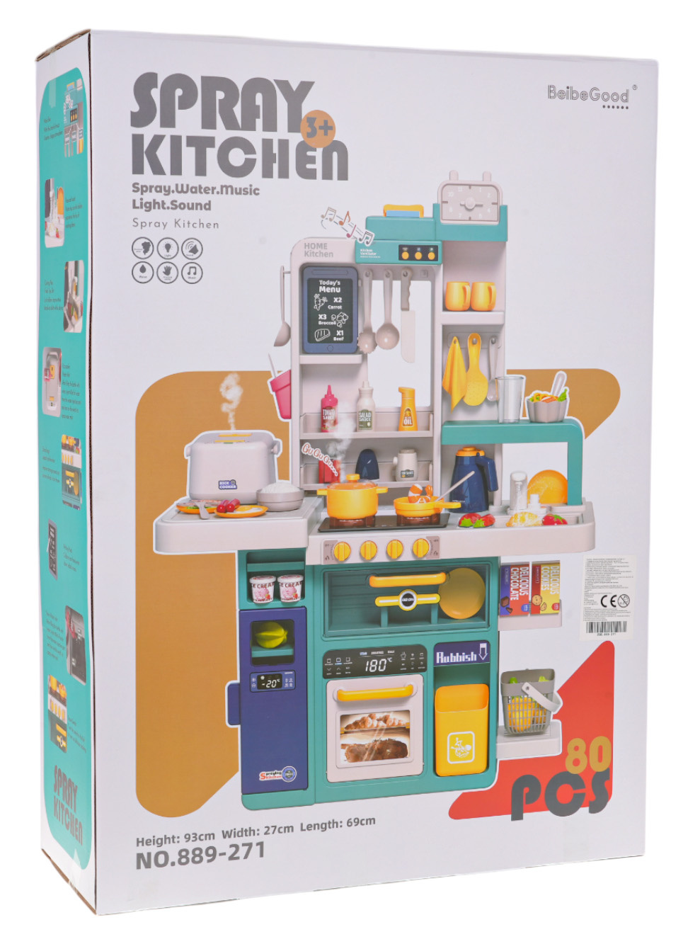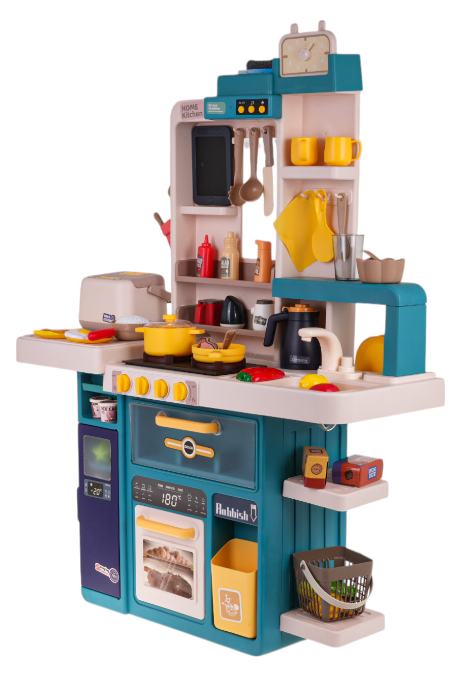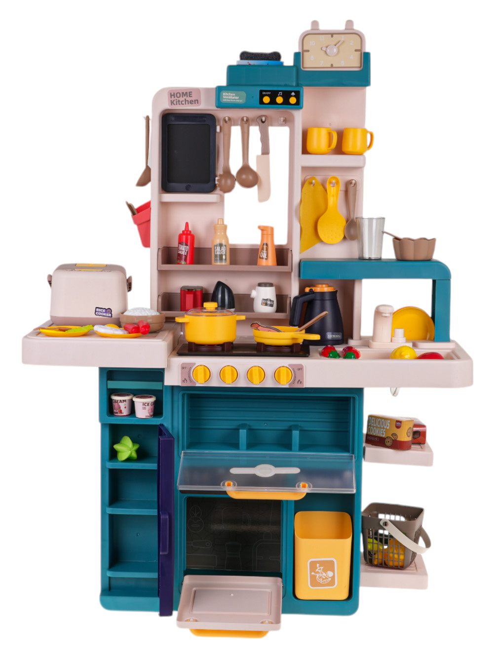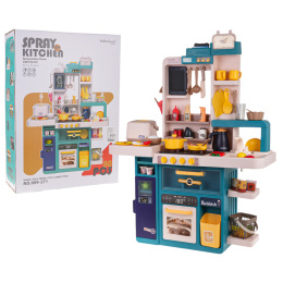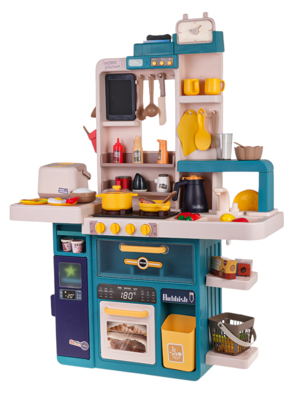 Interaktivní kuchyně s funkcí světla, vodní páry, zvuku a kohoutkem, ze kterého teče voda, a také s množstvím příslušenství, pro děti od 3 let. Kuchyně byla skvěle provedena, z nejlepší kvality plastu a je v živých barvách, které dítě povzbuzují ke hře. Na kuchyňské desce se nachází interaktivní deska s hořáky. Po otočení jednoho z knoflíků je slyšet zvuky vaření a druhého, zvuky smažení. Zvukům vaření a smažení doprovází podsvícení hořáků. Navíc z pánve nebo hrnce uniká vodní pára. Z kohoutku skutečně teče voda, jako ve skutečném dřezu, dítě bude moci umýt hračkové nádobí. Do sady je také přiložena křídová tabule, na které lze připravit např. recept nebo seznam na nákup. V sadě máme také maketu lednice s otevíracími dvířky, otevírací troubu a spoustu poliček, na které můžeme umístit makety produktů. Na horní části kuchyňské sestavy se nachází panel s tlačítky, které spouštějí různé melodie a zvuky vydávané digestoří. V sadě můžeme také najít nádobu na vaření rýže, ze které uniká bezpečná pára a je slyšet různé zvuky vaření. Celá sada vypadá skvěle. Celá sada je napájena bateriemi typu 9 x AA 1,5 V (nejsou součástí balení).