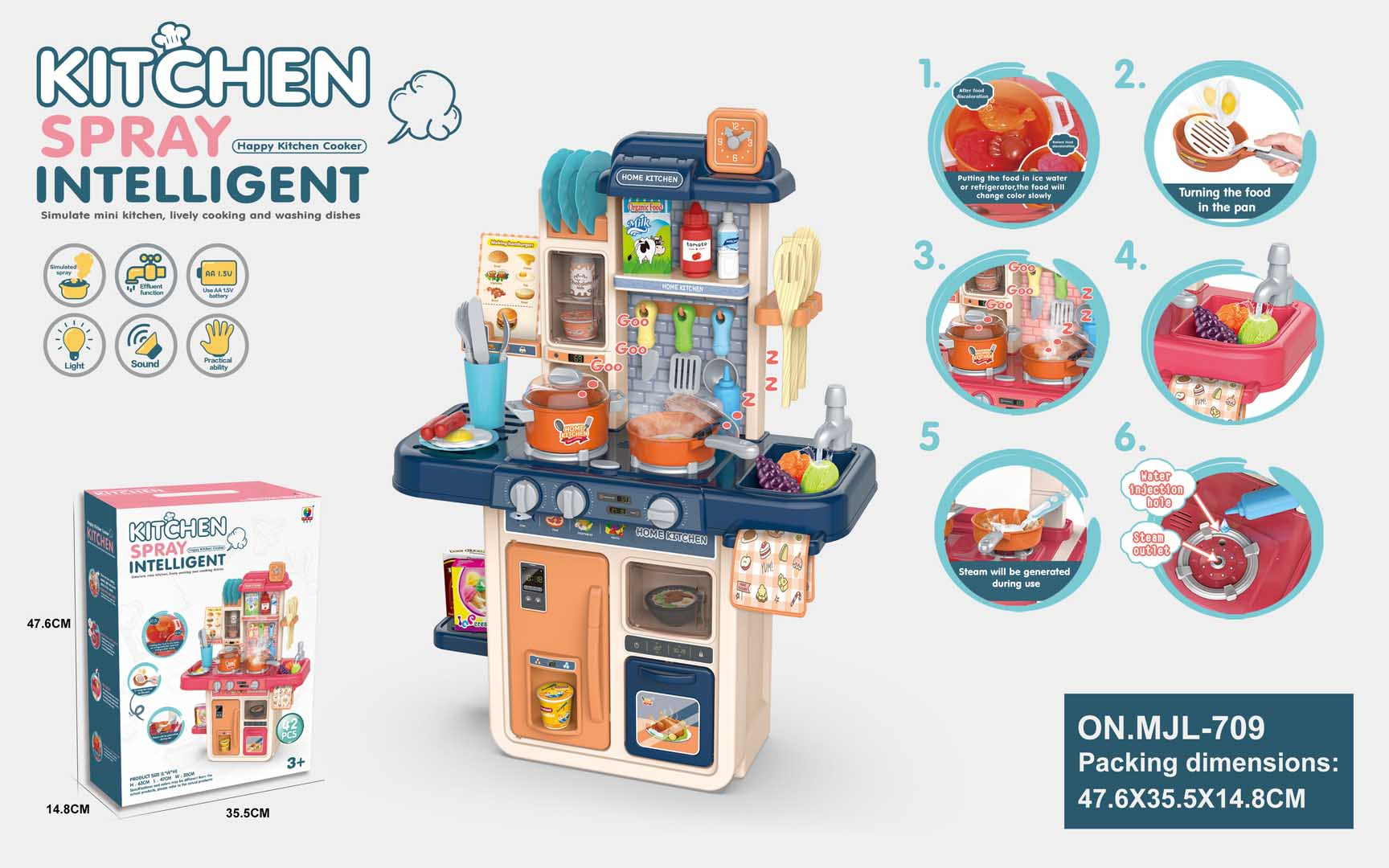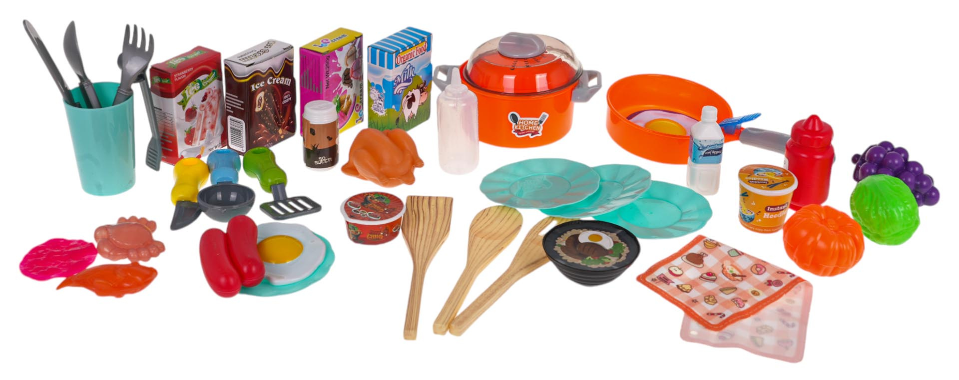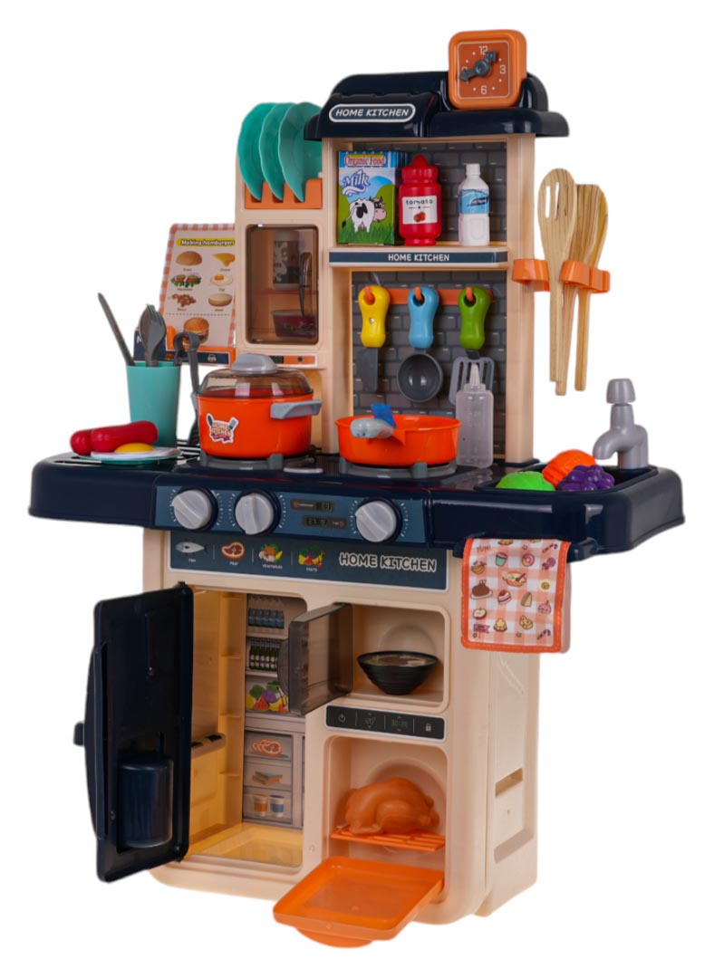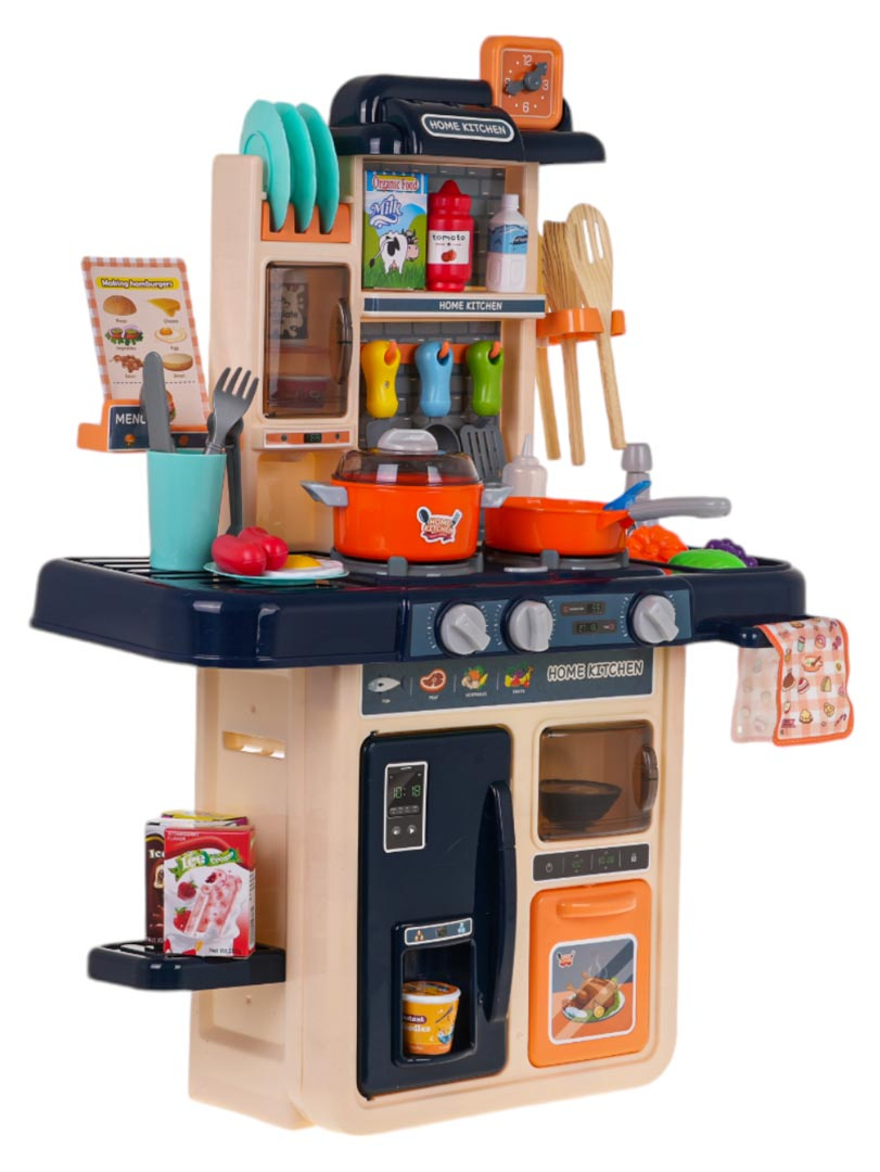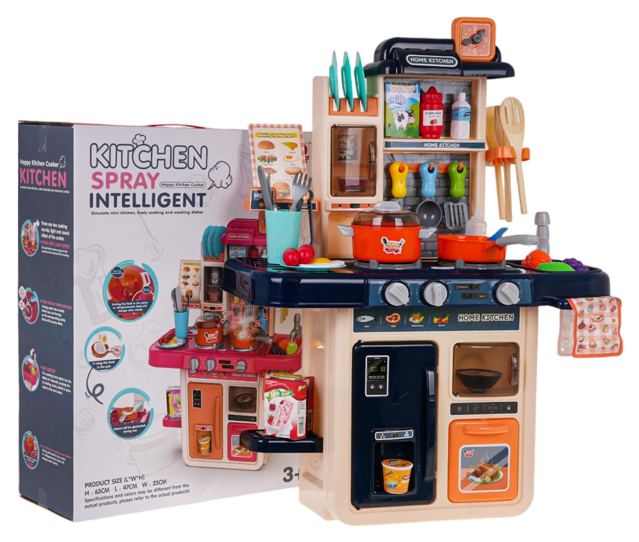 Multifunkční kuchyně s funkcí světla, zvuku, vody a páry pro děti od 3 let. Kuchyně byla vyrobena z plastu nejvyšší kvality v živých barvách. Sada se skládá ze 42 prvků, je bohatě vybavena kuchyňskými doplňky a atrapy potravin. Kuchyně má funkční kohoutek, ze kterého teče voda, podsvícené hořáky vydávají zvuky smažení a vaření, jsou zde také zvuky padajících kostek ledu, z hořáku stoupá pára. Ve vybavení kuchyně je také lednice, trouba a mikrovlnná trouba. Skříňky a police pojmou všechny doplňky. Hračka je napájena bateriemi typu 3 x AA 1,5 V (nejsou součástí balení).