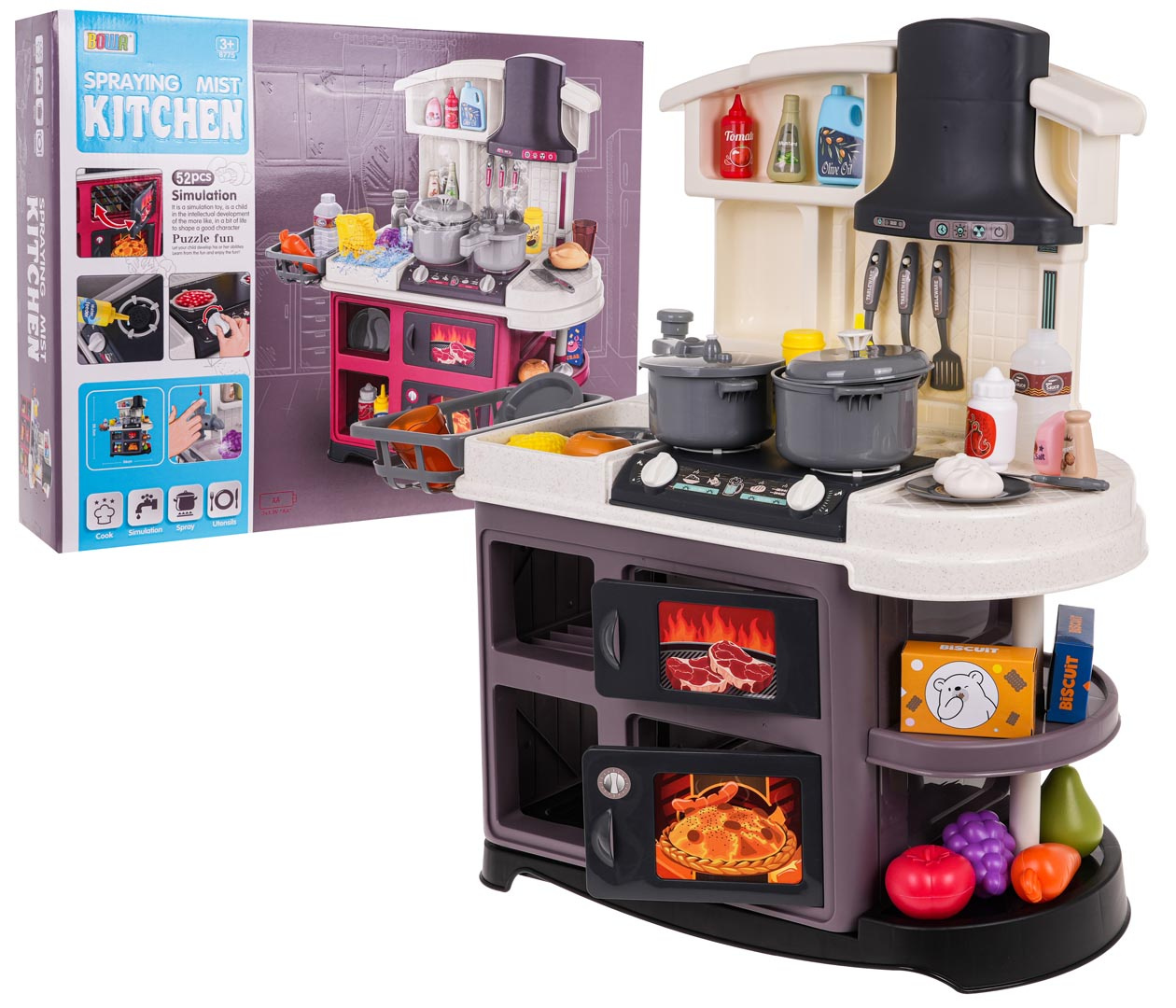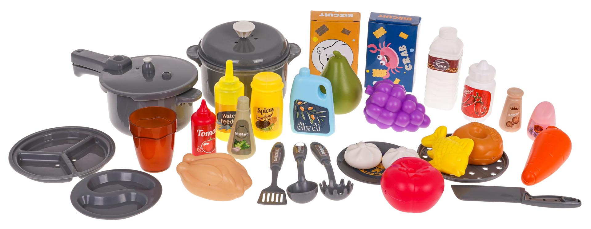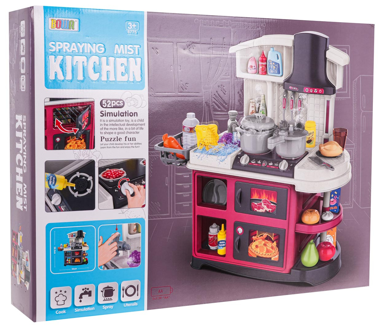 Interaktivní kuchyně s funkcí světla, zvuku a kohoutkem, ze kterého teče voda, a také s množstvím doplňků, pro děti od 3 let. Kuchyně byla skvěle provedena, z nejlepší kvality plastu a je v živých barvách, které dítě povzbuzují ke hře. Na kuchyňské desce se nachází interaktivní deska s hořáky. Po otočení jednoho z knoflíků je slyšet zvuky vaření, a druhého, zvuk smažení, který je doprovázen podsvícením hořáků. Po přidání několika kapek vody na hořák se z něj uvolňuje studená vodní pára. Z kohoutku skutečně teče voda, jako ve skutečném dřezu, dítě bude moci umýt hračkové nádobí. V sadě máme také atrapu trouby s otevíracími dvířky a atrapu grilu s otevíracími dvířky a spoustu poliček, na které můžeme umístit atrapy produktů. Celá sada vypadá skvěle. Hračka je napájena bateriemi typu 3 x AA 1,5 V (nejsou součástí balení).