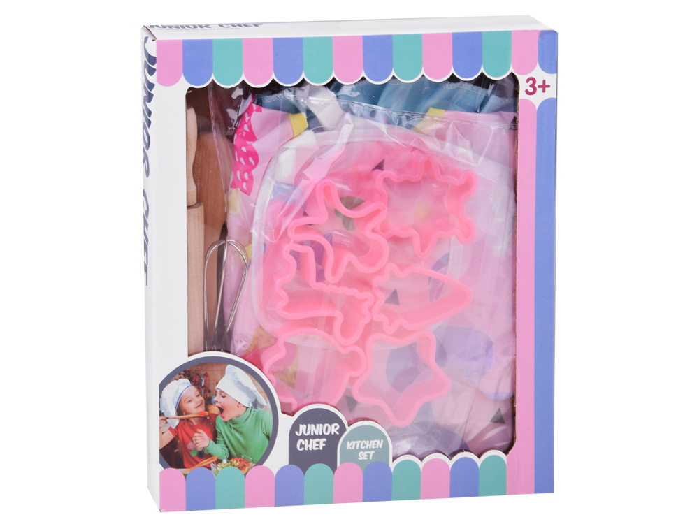 - kuchyňskou zástěru, - kuchařskou čepici,- rukavice , - látkovou podložku,- dřevěnou lžíci ,- dřevěný váleček,- kovovou metlu , - 6 plastových forem.