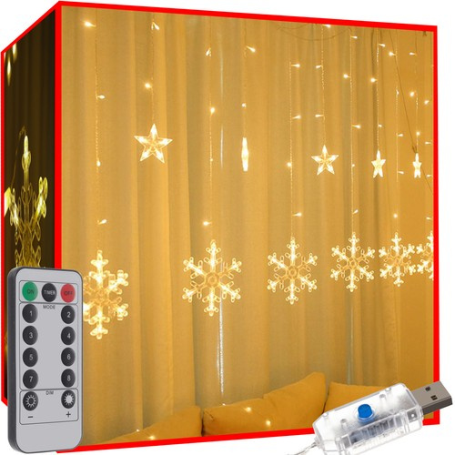 Světelný závěs vločky, hvězdy 138 LED, USB, dálkové ovládání, teplá bílá ISO 19746