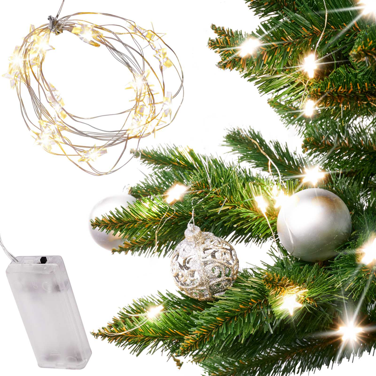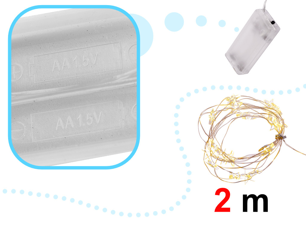 Světýlka jsou ideální pro osvětlení každého vánočního stromku. Protože je drát tenký, snadno ho schováte do jehličí.Ohebný drát s hvězdičkami LED je skvělým základem pro nejrůznější kutilské projekty. Hvězdičky na jemném drátku jsou samy o sobě dokonalou dekorací! Mohou sloužit například pro výzdobu vánočního stolu. Světla můžete použít kdekoli chcete! Nejste omezeni zásuvkami a kabely.