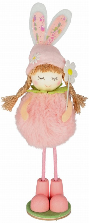 Výška 18 cm z něj činí ideální velikost pro umístění na stůl, polici, komodu nebo na jiná místa v domě. Holčička vyrobená z materiálu, oblečená v pastelovém, jarním oblečku, s charakteristickými prvky odkazujícími na Velikonoce, jako jsou motivy zajíčka nebo květin. Tato dekorace vnese do interiéru teplo a radost, ideálně se hodí k dalším velikonočním ozdobám. Dokonalá volba pro vytvoření útulné, sváteční atmosféry ve vašem domově.