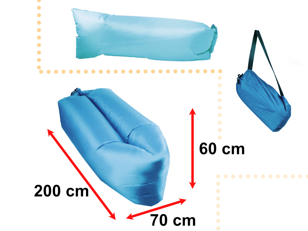 Skvělá nafukovací pohovka z líného pytle. Nezbytná pomůcka pro každého turistu. Rozložení trvá několik sekund a ve složeném stavu zabírá velmi málo místa. Součástí dodávky je: pohovka, taška. Materiál: 190t polyester. Maximální hmotnost: 120 kg. Rozměry. v rozloženém stavu: 200x70 cm.Celý popis