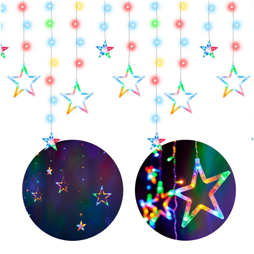 Vneste do svého prostoru kouzlo! Krásný světelný závěs s velkými hvězdami různých velikostí rozzáří každý interiér. Barevné světla, vnesou do vašeho pokoje vánoční kouzlo. Světelný závěs se skvěle hodí jako jedinečná vánoční dekorace, ale světýlka ve tvaru hvězdiček lze použít i v jiných ročních obdobích, zejména jako originální dekorace nebo jako osvětlení pro dětský pokoj ve večerních hodinách. Světla jsou namontována na robustní a silný kabel, který zaručuje dlouhou životnost. Závěs lze zavěsit na záclonovou tyč, takže se z obyčejných záclon stane slavnostní dekorace nebo dokonce nahradí záclony!Jediným kliknutím můžete výrazně změnit atmosféru v místnosti. Díky různým režimům osvětlení, můžete rychle přejít z útulného interiéru zaměřeného na odpočinek do veselého karnevalového večírku. Světla jsou napájena ze sítě a díky technologii LED nespotřebovávají světla mnoho energie. K osvětlení většího prostoru nepotřebujete více elektrických zásuvek .Dva závěsy můžete snadno spojit pomocí konektoru a můžete také propojit různé sady světel, pokud mají ploché zástrčky.