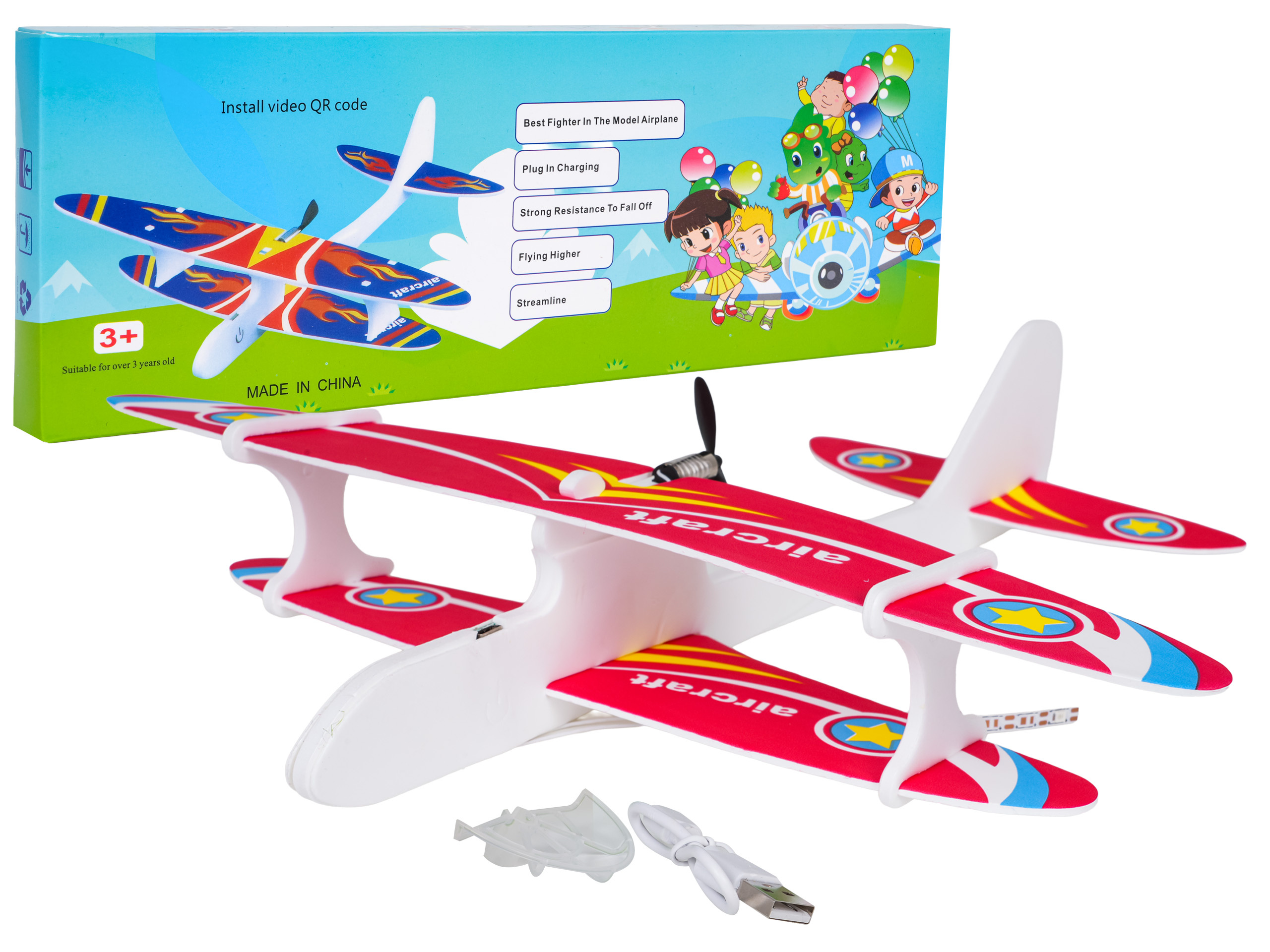 Barevné polystyrenové letadlo vybavené elektrickým motorem pro děti od tří let. Materiál, ze kterého je letadlo vyrobeno, je odolný a lehký, což umožňuje letadlu plynulé a stabilní lety a poskytuje ochranu před poškozením. Lze si s ním hrát jak uvnitř, tak venku. Instrukce k použití letadla je velmi jednoduchá, stačí vypustit letadlo z rukou a ono začne stabilně létat dokola. Po 15 sekundách se motor automaticky vypne. Letadlo je napájeno akumulátorem typu 3,7 V (v balení) a nabíjeno kabelem USB.
