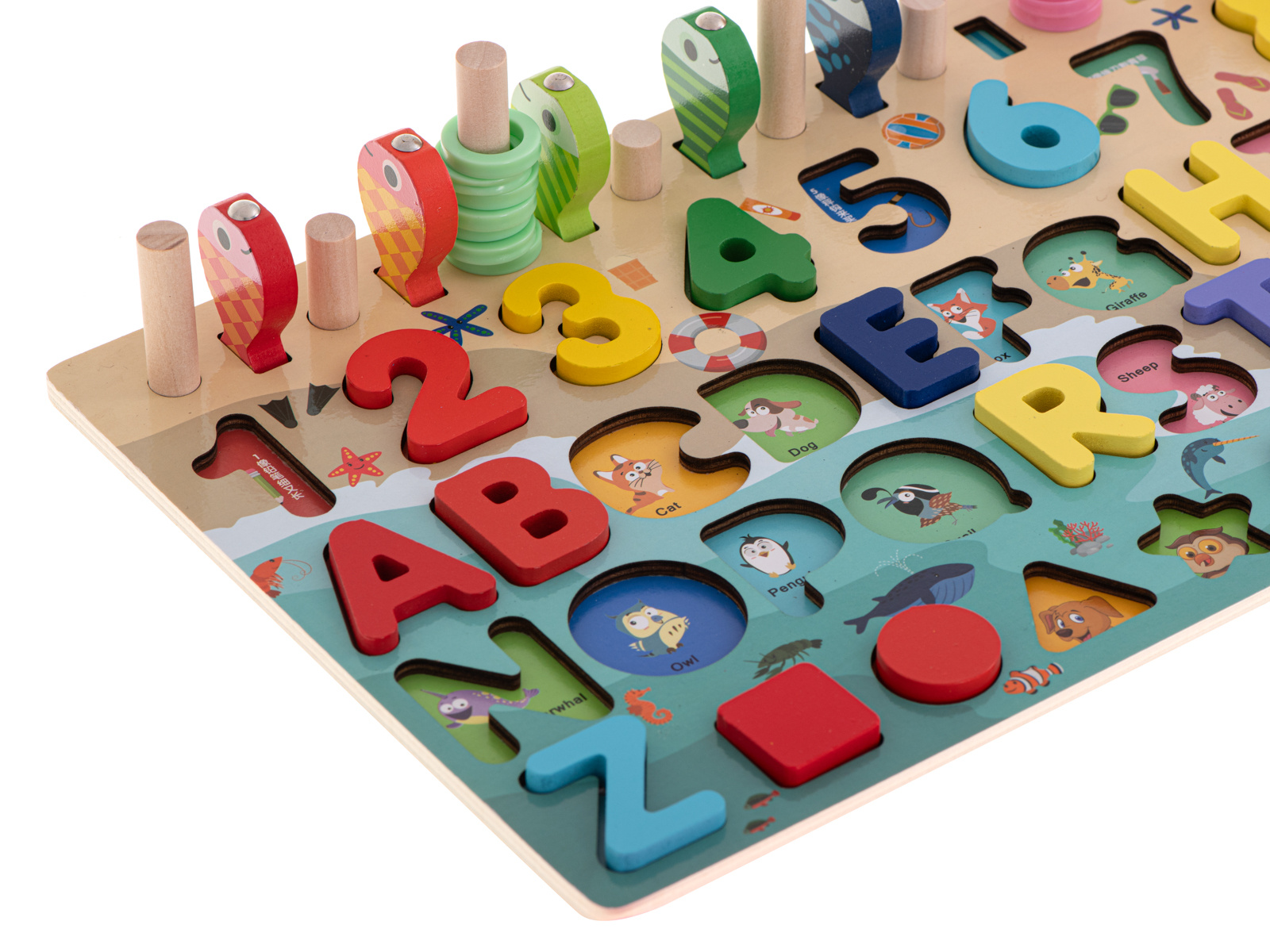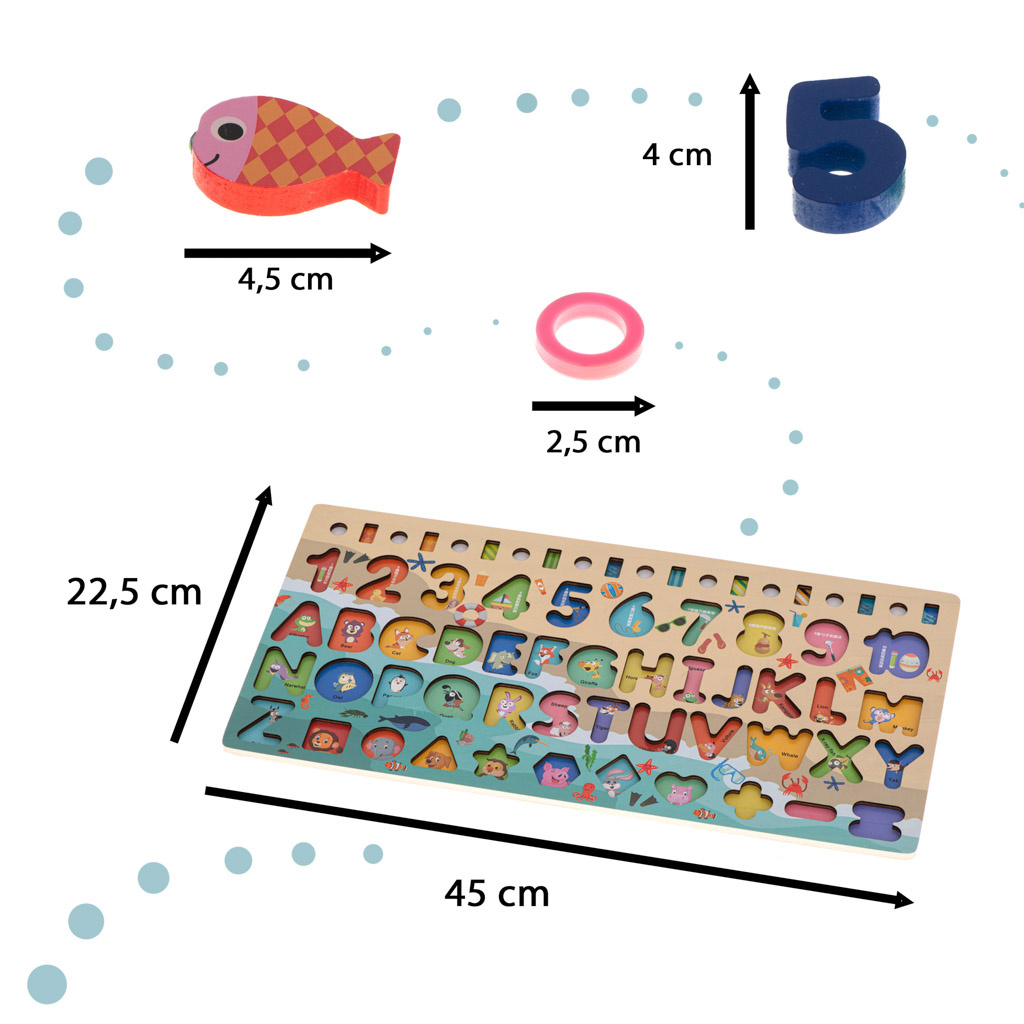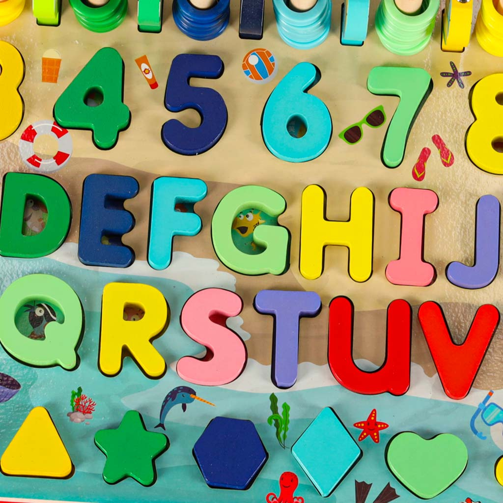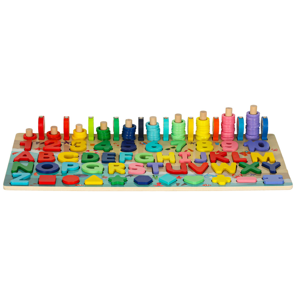 Součástí sady jsou barevné geometrické obrazce a čísla, která je třeba vložit do příslušných otvorů. Hra naučí vaše dítě rozpoznávat tvary a navíc mu pomůže naučit se čísla a písmena.