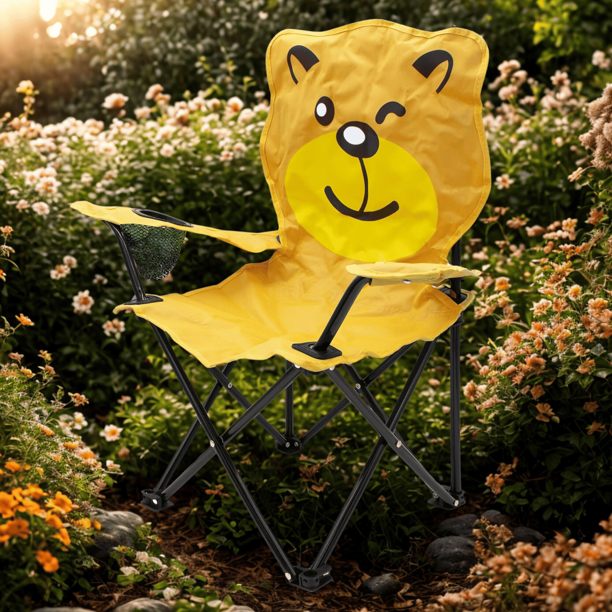 Skládací křesílko s dětským motivem si vaše děti zamilují. Je vyrobené z kovové rozkládací konstrukce s polyesterovým potahem ve tvaru zvířátka.