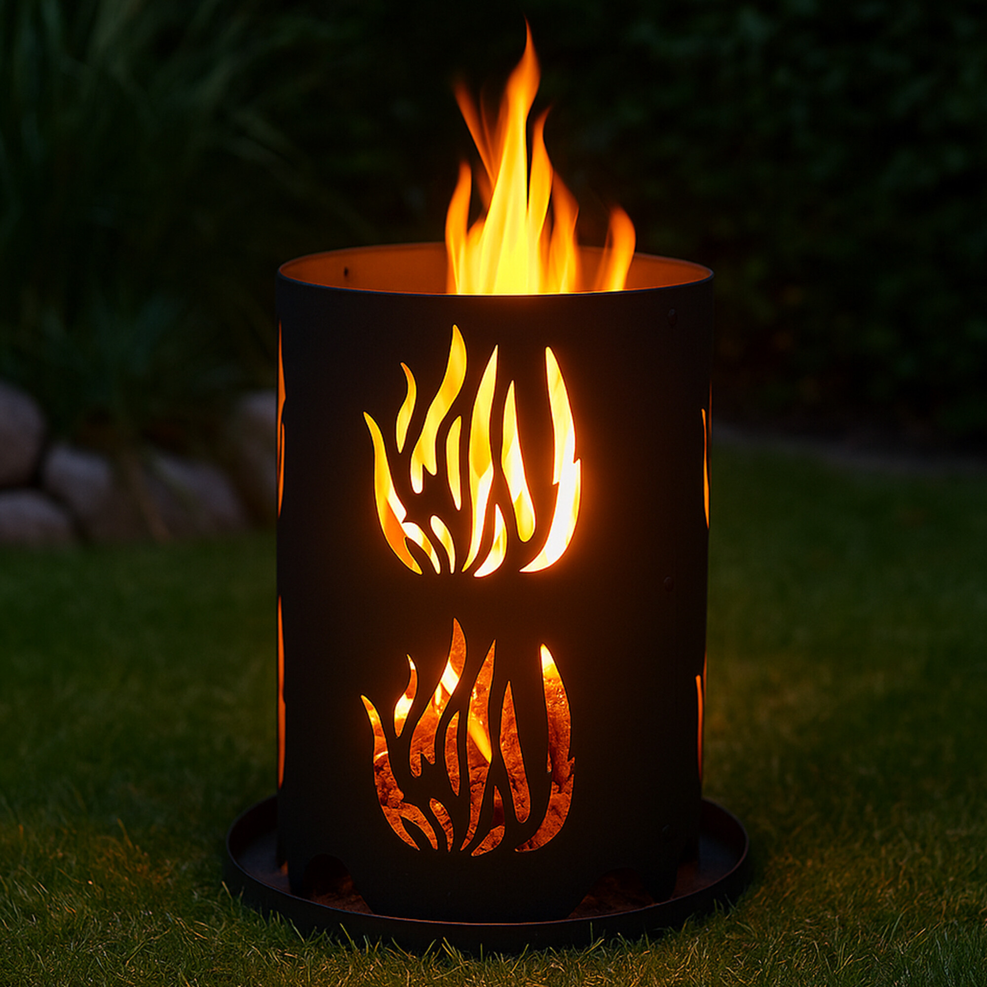 Stylové zahradní ohniště s dekorativními výřezy ve tvaru plamenů je ideální volbou pro letní večery na zahradě.
