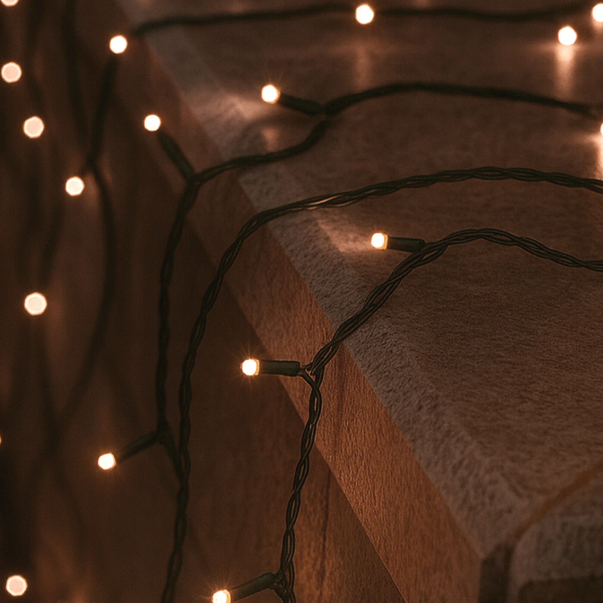 Vysoce kvalitní vánoční LED řetěz svítí v teple bílé barvě.