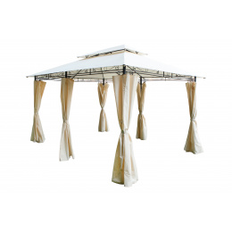Zahradní altán s pevnou a stabilní konstrukci, v obdélníkovém provedení, se stahovatelnými závěsy.