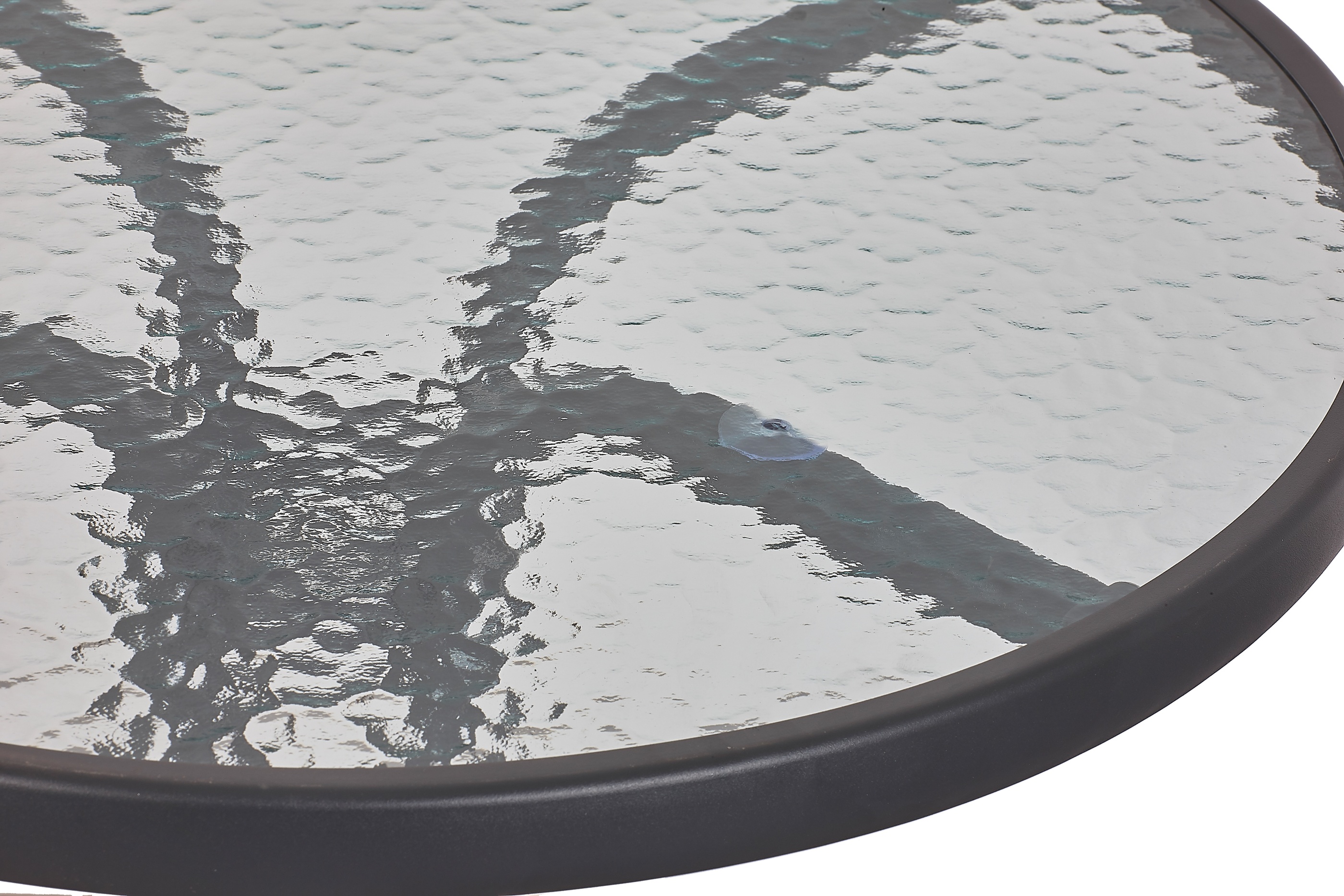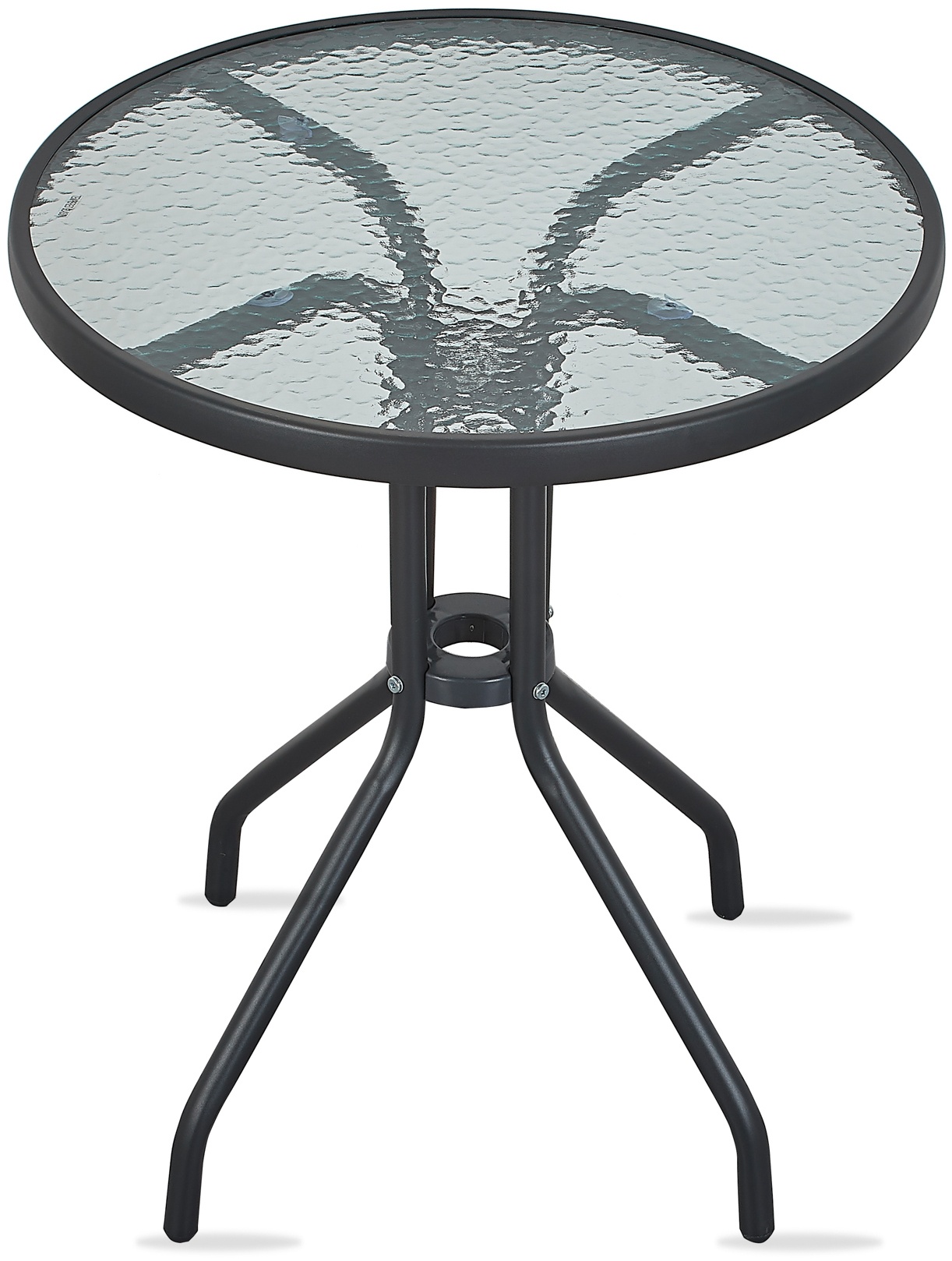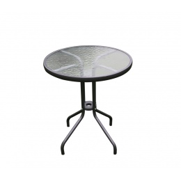 Zahradní stůl s pevným kovovým rámem a vroubkovanou skleněnou deskou v moderním designu, vhodný pro zahrady, terasy, kavárny, altánky, balkóny či pláže.
