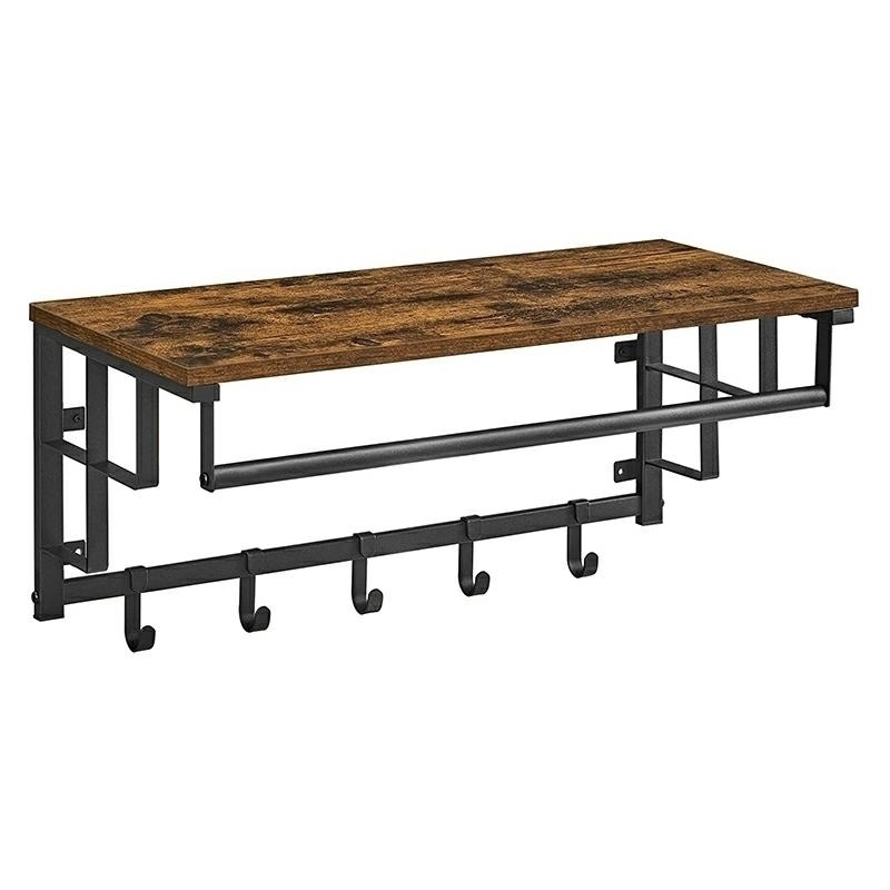 Praktická a stylová police v rustikálním stylu s věšáky na oblečení. Ideální k instalaci v chodbě - umožňuje pověsit 5 svrchních oděvů díky kovovým háčkům, další tyč umožňuje použití tradičních ramínek na oblečení. Specifikace: deska vyrobená z dřevotřísky, rám a háky jsou vyrobeny z oceli, police pro ukládání klobouků, deštníků atd. 5 pohyblivých háků rozměry: šíř.:66 cm, hl.:30 cm, výš.:28 cm (s ramínky 32 cm) rozměry balení: 69x9,5x34,5 cm Počet kusů. na paletě: 60