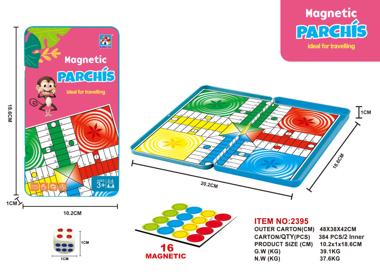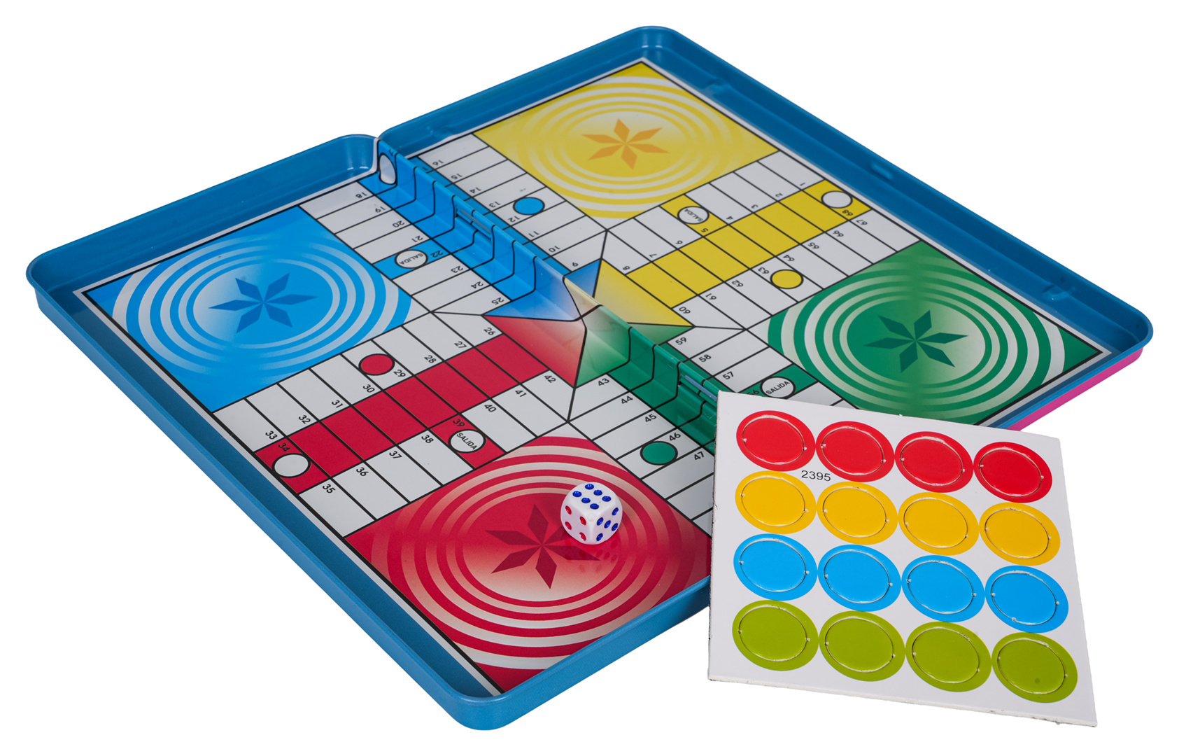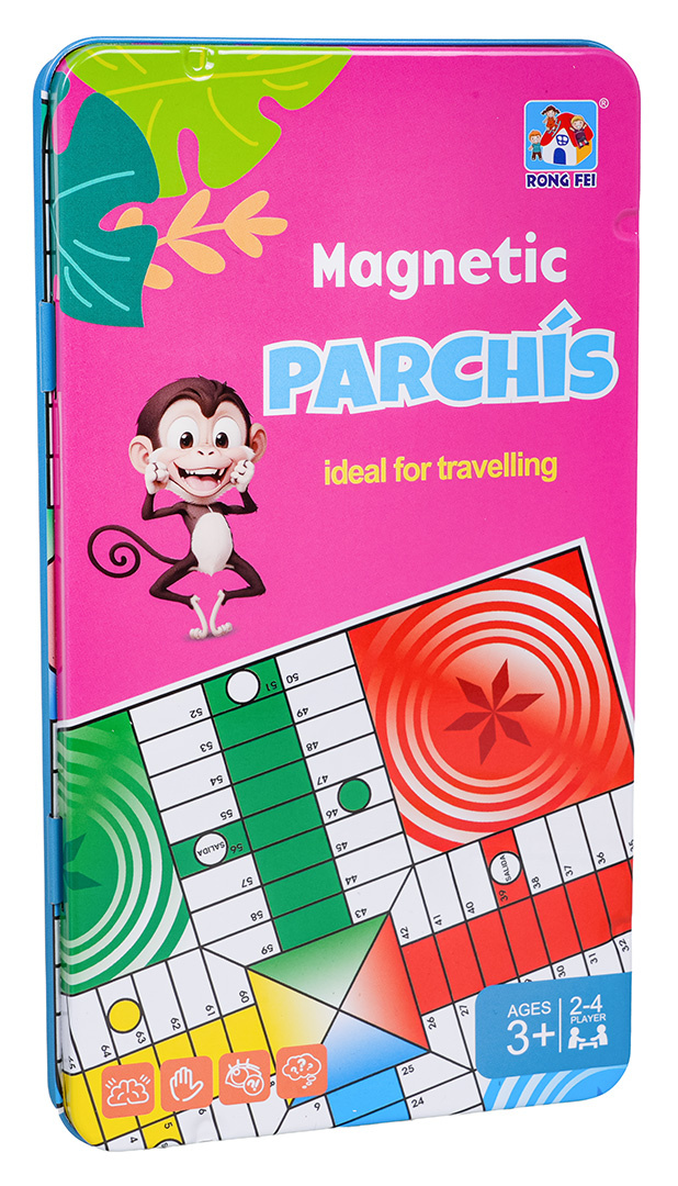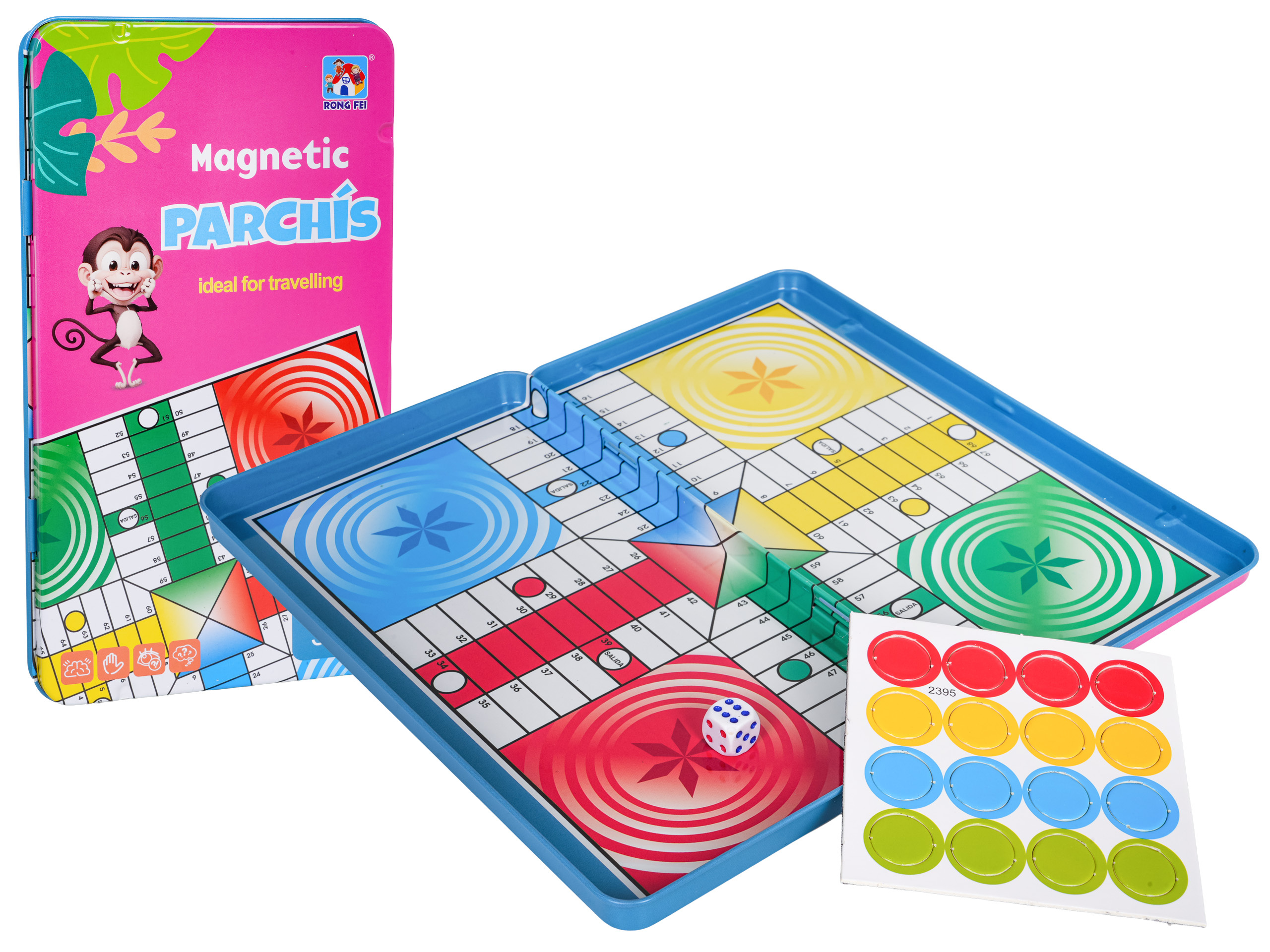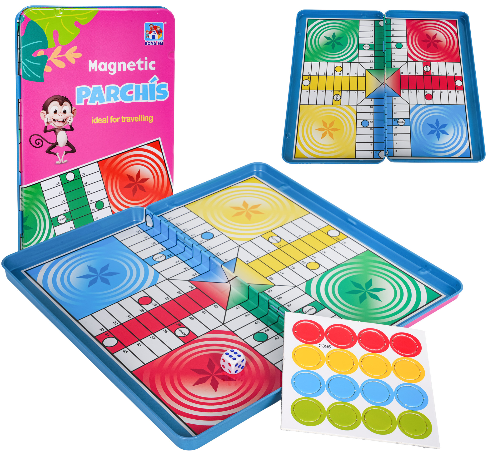 Magnetická hra Člověče, nezlob se pro děti od tří let. Hra je malých rozměrů, takže ji můžete vzít všude s sebou, figurky jsou magnetické a dobře drží na desce. V této sadě nám kovová krabička hry slouží jako herní deska, díky čemuž jsou rozměry hry omezeny na minimum.