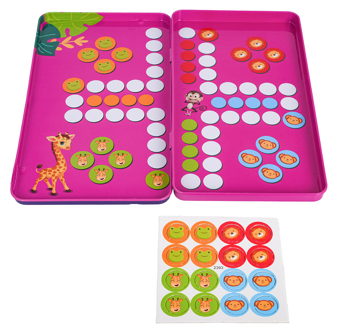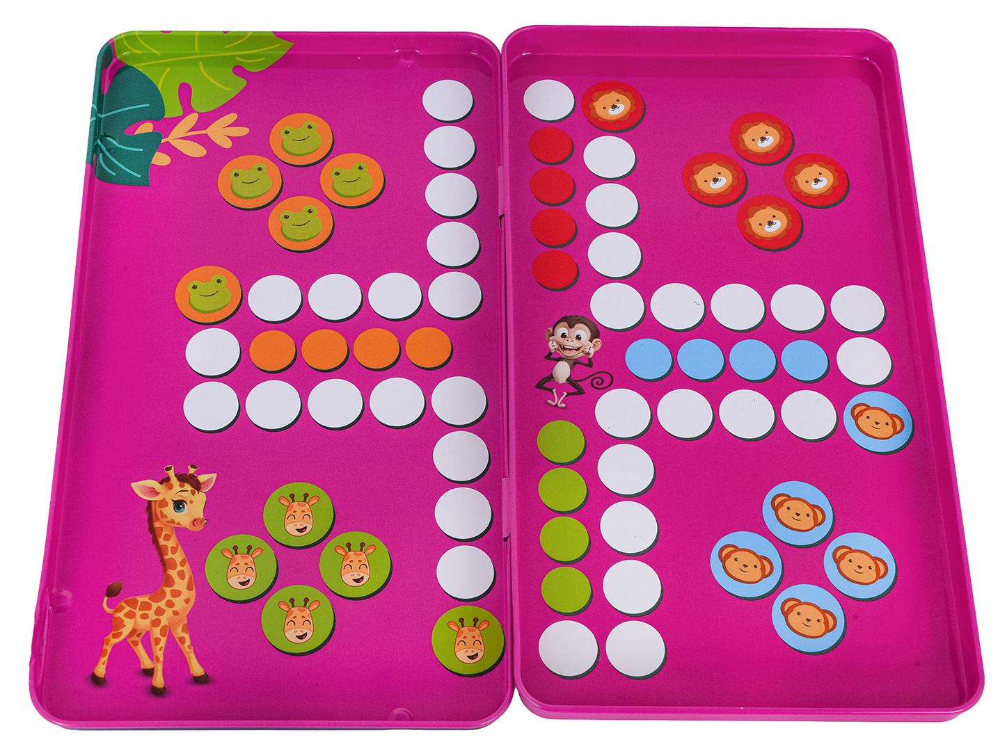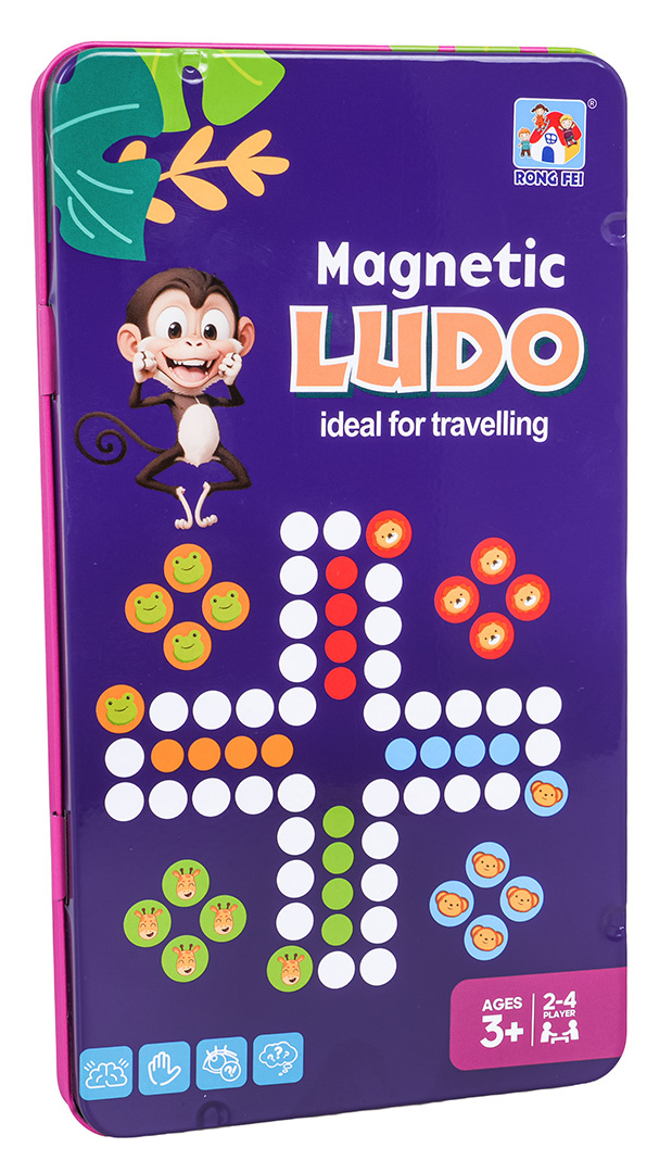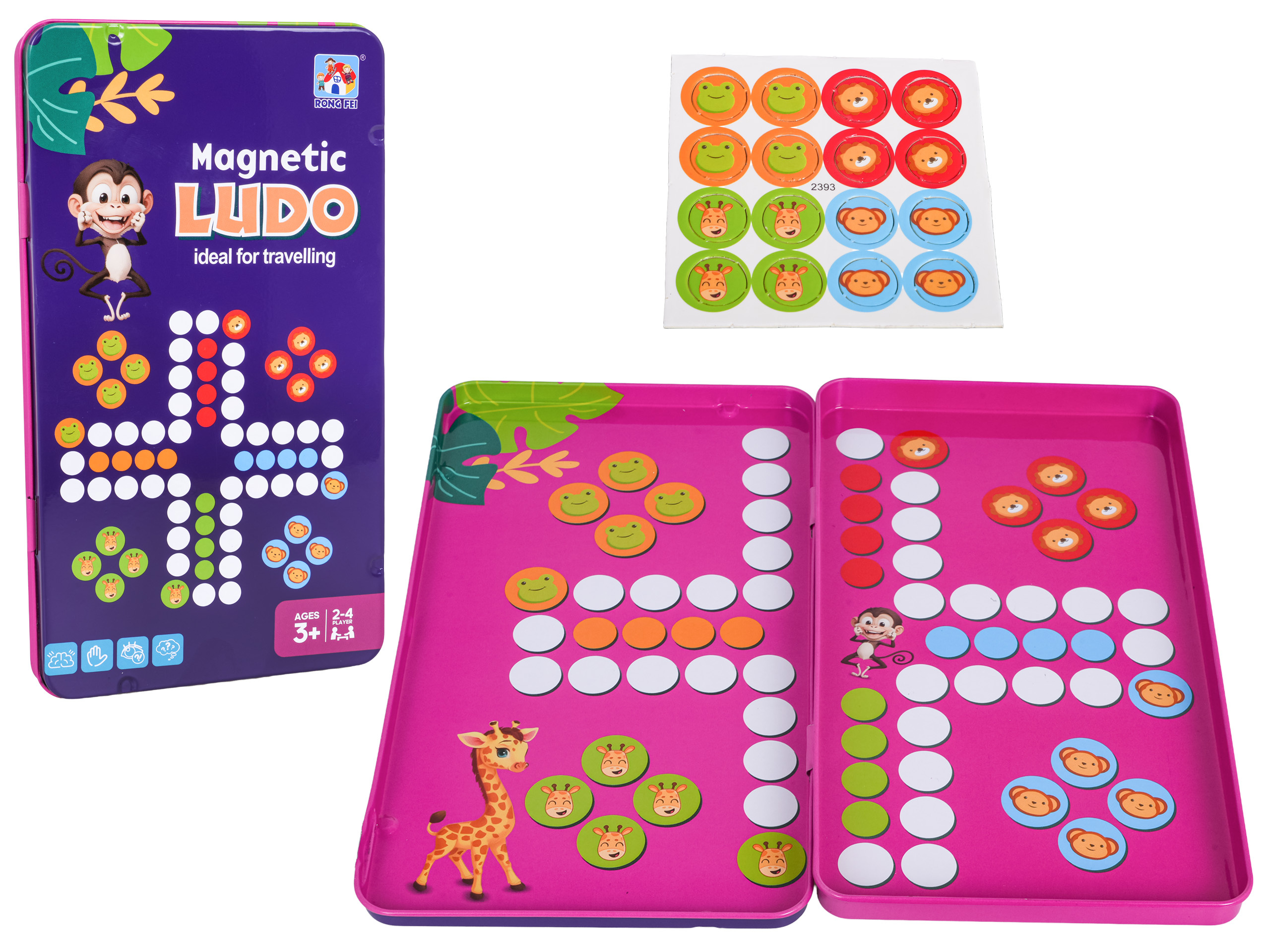 Magnetická hra Ludo pro děti od tří let. Hra je malých rozměrů, takže ji můžete vzít všude s sebou, figurky jsou magnetické a dobře drží na desce. V této sadě nám kovová krabička hry slouží jako herní deska, díky čemuž jsou rozměry hry omezeny na minimum.
