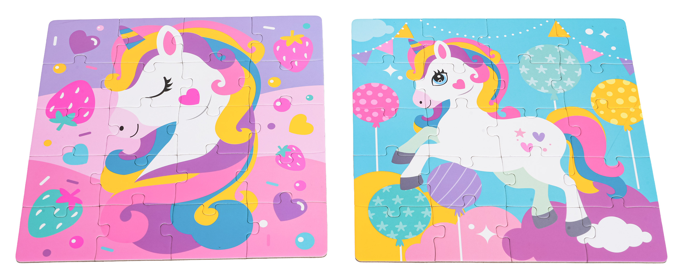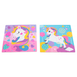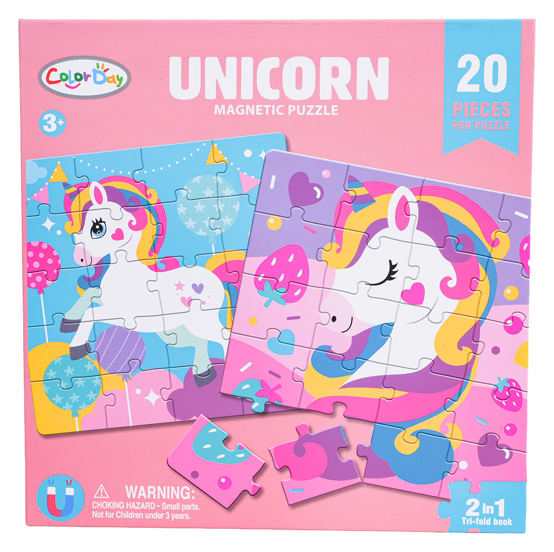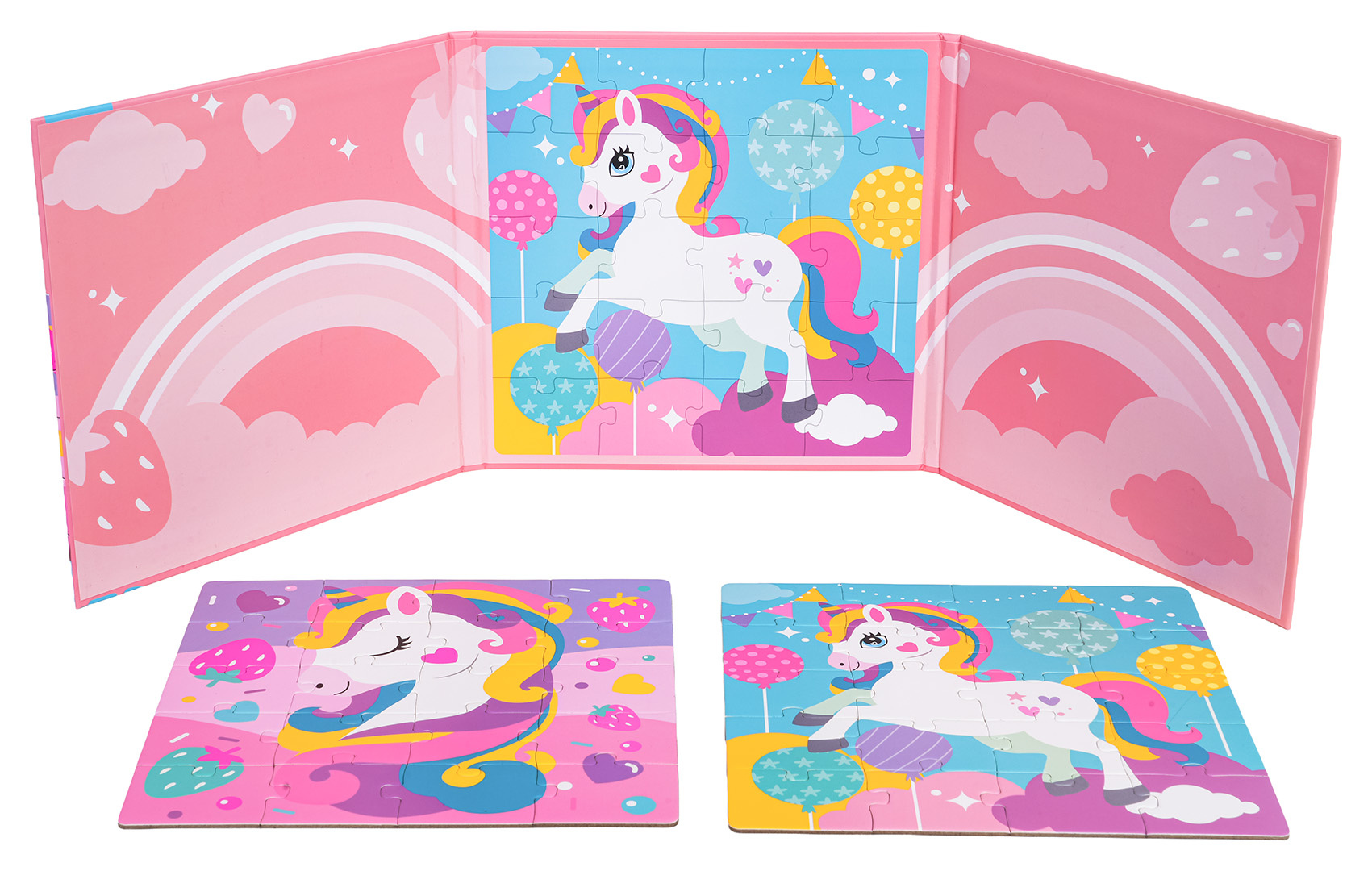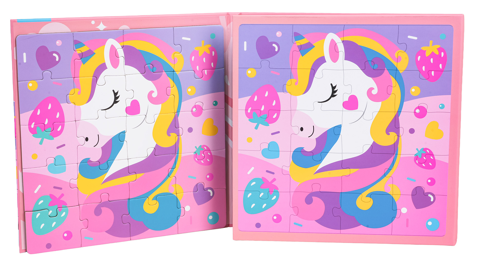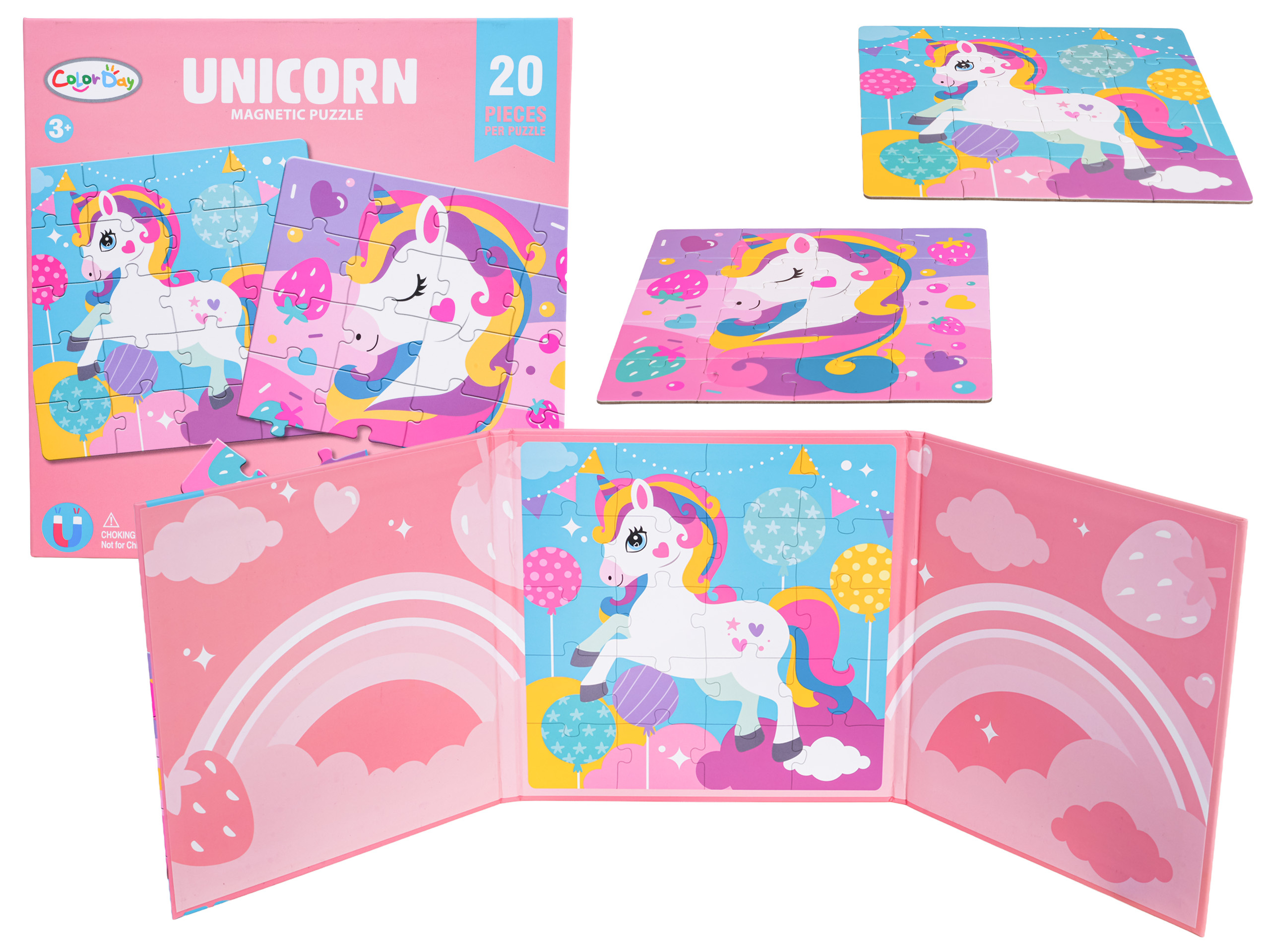 Barevná knížka s magnetickými puzzly představujícími jednorožce pro děti starší tří let. Knížka se skládá ze 2 magnetických a 2 nemagnetických stran, na magnetických stranách lze sestavit 20dílný obrázek s jednorožcem. Strany nemagnetické mají namalovaný obrázek puzzle. Puzzle dobře drží a neodpadávají. Lze je skládat i v kočárku nebo autě. Sada je vyrobena v živých barvách, které dítě povzbuzují k skládání.