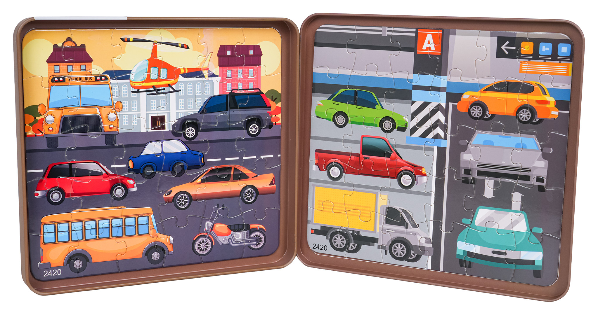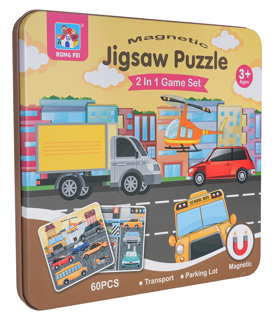 Magnetická sada, puzzle s vozidly pro děti od tří let. Sada se skládá z magnetické krabičky a magnetických puzzlí. Na vnitřní části krabice, horní a dolní, lze umístit 2 desky. Na každé desce máme 30 puzzlí a na nich různá vozidla. Sada byla vyrobena s důrazem na detaily, díky magnetické funkci si s touto sadou můžete hrát v autě nebo venku, aniž byste se museli obávat, že se něco rozsype. Magnety drží velmi dobře.