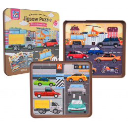 - 60 puzzlí k sestavení dvou desek: vozidla na parkovišti a dopravní vozidla.