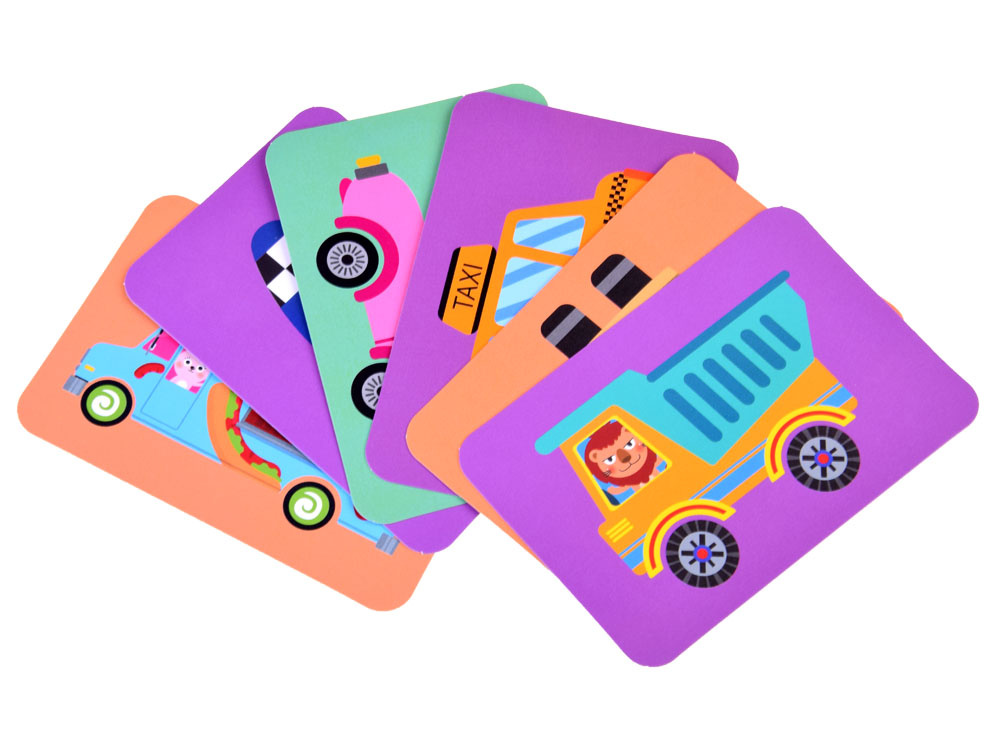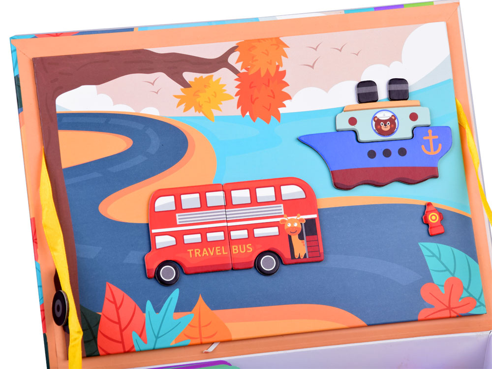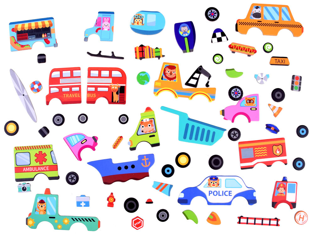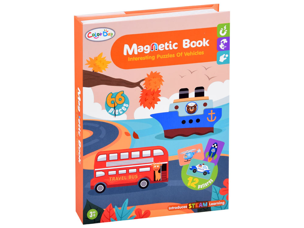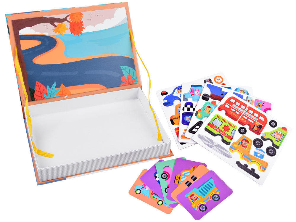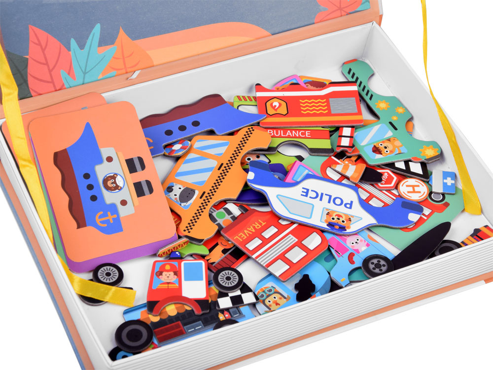 Magnetická vozidla jsou skládačka s 66 dílky, která dětem umožňuje vytvořit si z kartiček vybraná vozidla nebo navrhnout vlastní jedinečné vozidlo. Je známo, že dětská představivost je obrovská! Sada je uzavřena v tvrdé kartonové krabici imitující knihu. Uvnitř se nachází plocha se silnicí, na kterou se dají naskládat vozidla.