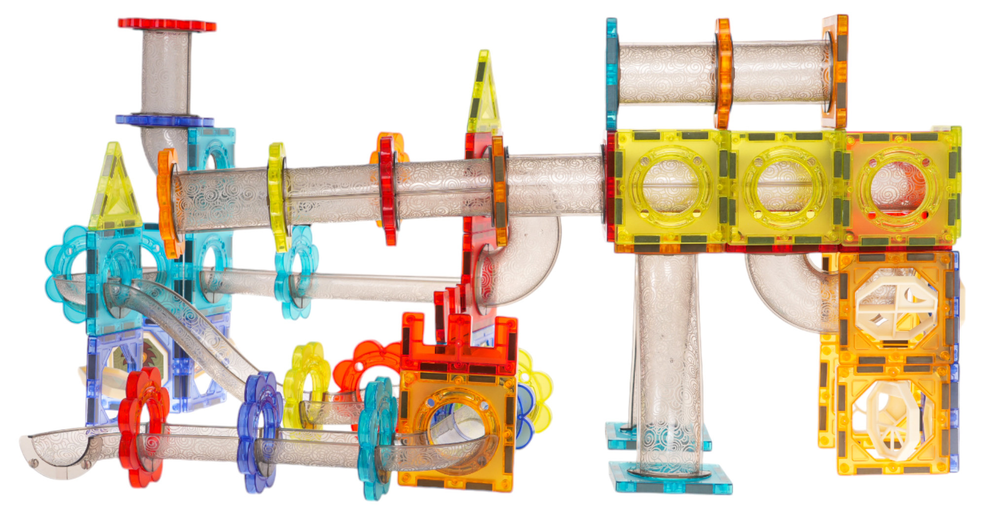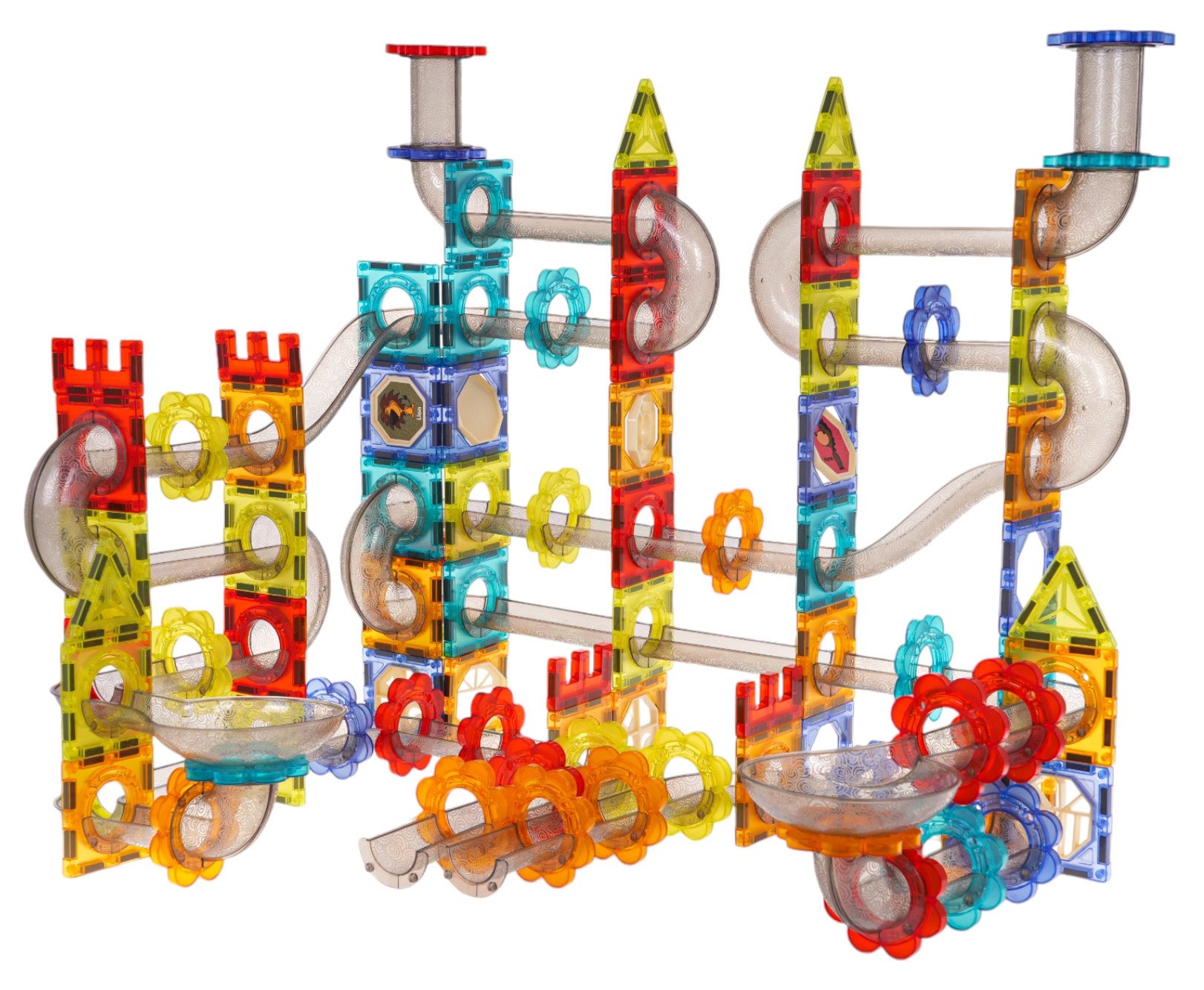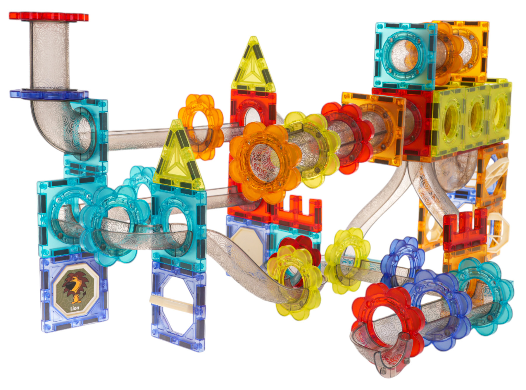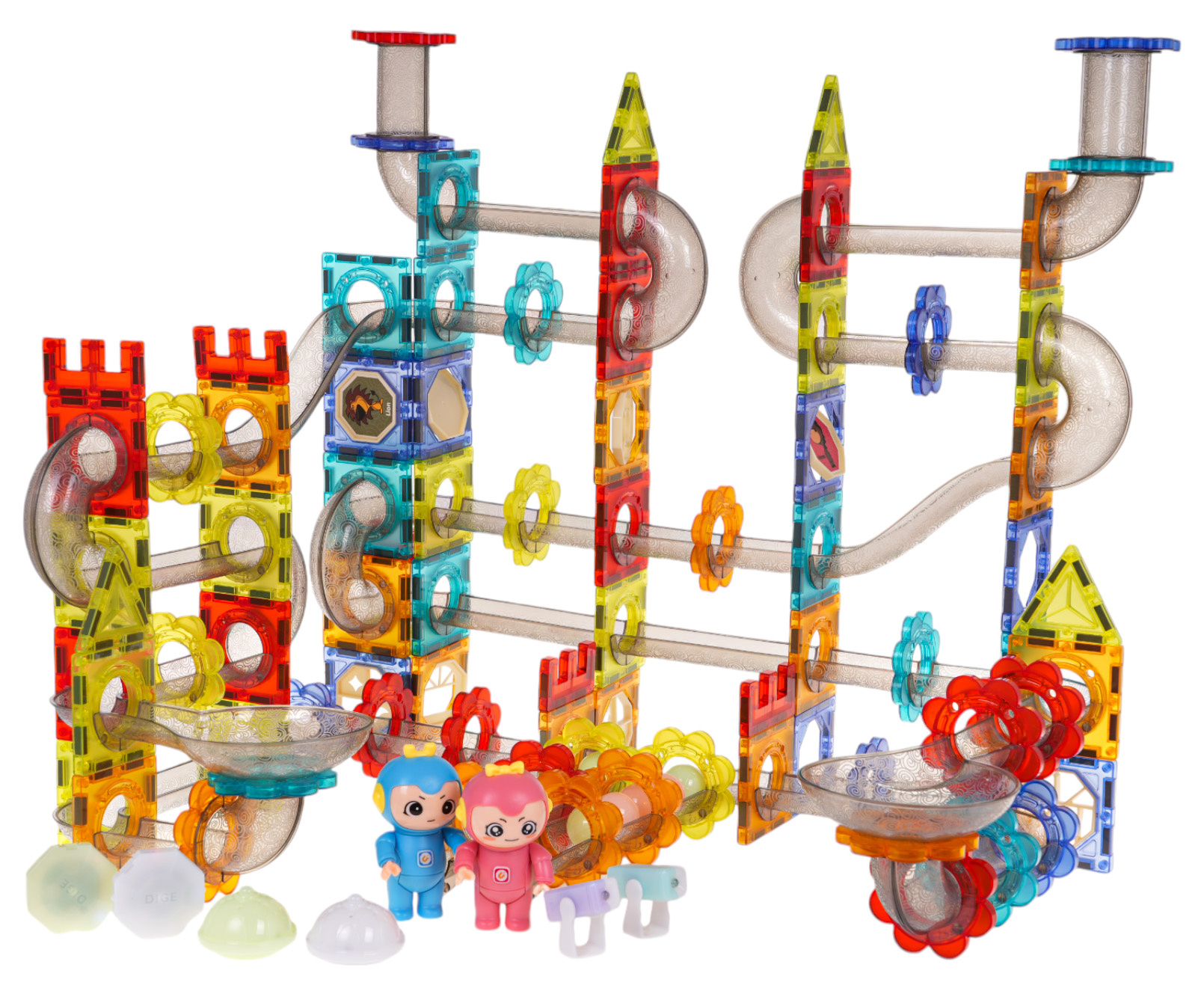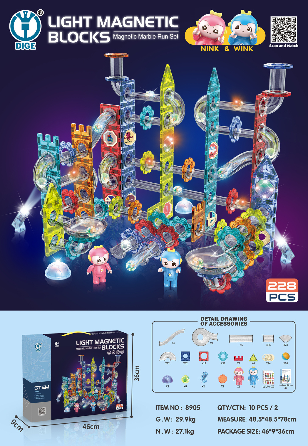 Sada barevných magnetických kostek pro děti od 3 let. Sada se skládá z 228 prvků a umožňuje postavit dráhu pro kuličky v libovolném uspořádání. Některé prvky sady jsou napájeny bateriemi a po jejich zapnutí rozsvítí dráhu pulzujícími světly, což činí hru zajímavější. Světýlka pulzují ve 3 režimech: rychlém, středně rychlém a pomalém, lze vybrat, který režim bude pro dítě vhodný. Navíc několik kuliček po zatřesení bliká světýlky. V sadě máme také několik barevných kapslí, které svítí a mění barvy, a několik LED reflektorů. Celkem je sada napájena bateriemi typu 12 x LR1130 1,5 V, 6 x LR41 1,5 V, 8 x CR1220 3 V. Všechny baterie jsou součástí balení. Kostky byly vyrobeny z nejkvalitnějšího materiálu, jsou hladké a pečlivě zpracované. Spojujeme je pomocí vestavěných magnetů. Magnety velmi dobře drží, zajišťují stabilitu konstrukce. V sadě se nachází obrázkový návod na sestavení ukázkových tratí.