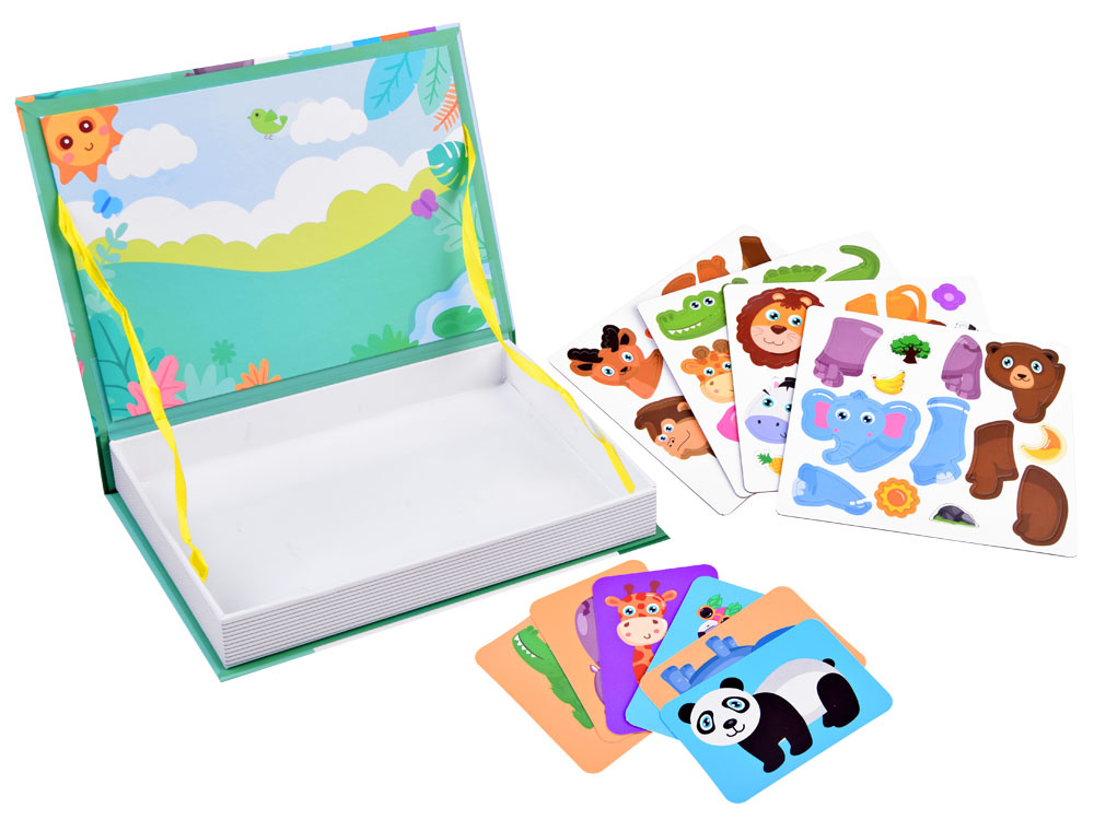 Magnetické puzzle se zvířátky ZOO umožní každému dítěti vytvořit si na desce medvídka, zebru, lva atd. podle vzoru na kartě. Dítě si ale může vytvořit i vlastní verzi zvířete, například "žirafu zebru" nebo slona s medvědíma nohama : ) Je známo, že děti mají sílu nápadů. Sada je uzavřena v pevné kartonové krabici imitující knihu, uvnitř je deska se zelenou krajinou, na kterou si dítě může uspořádat své představy o zvířatech.