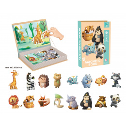 Magnetická kniha, vzdělávací skládačka pro děti starší tří let. Knížka bude ideální jako dárek. Prostřednictvím hry se dítě seznámí se zvířátky safari a procvičí si ručičky. Po otevření knížky může dítě v horní části připínat puzzle se zvířátky. Tvoří tak svým způsobem vlastní příběh, pokaždé jiný. Sada se skládá z 49 magnetických prvků a 16 karet.