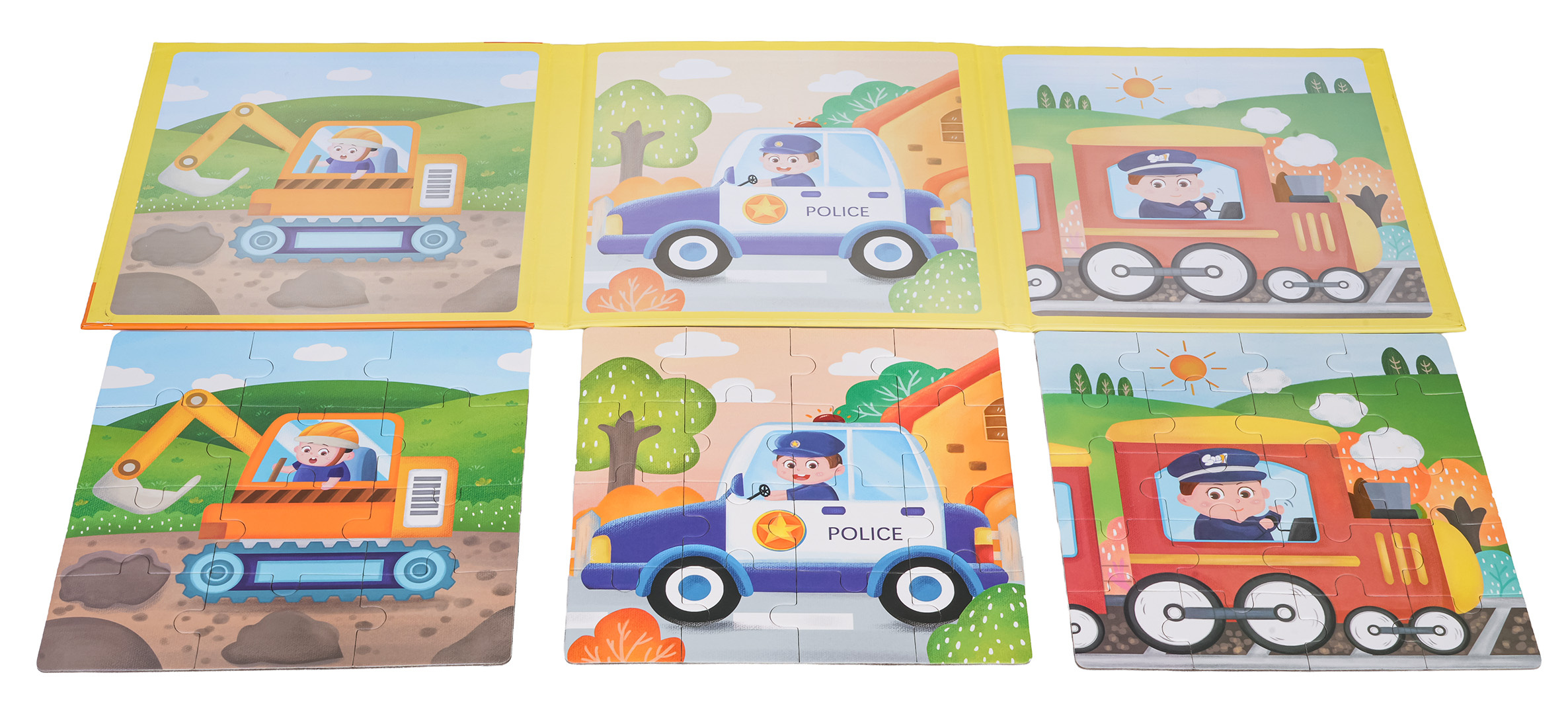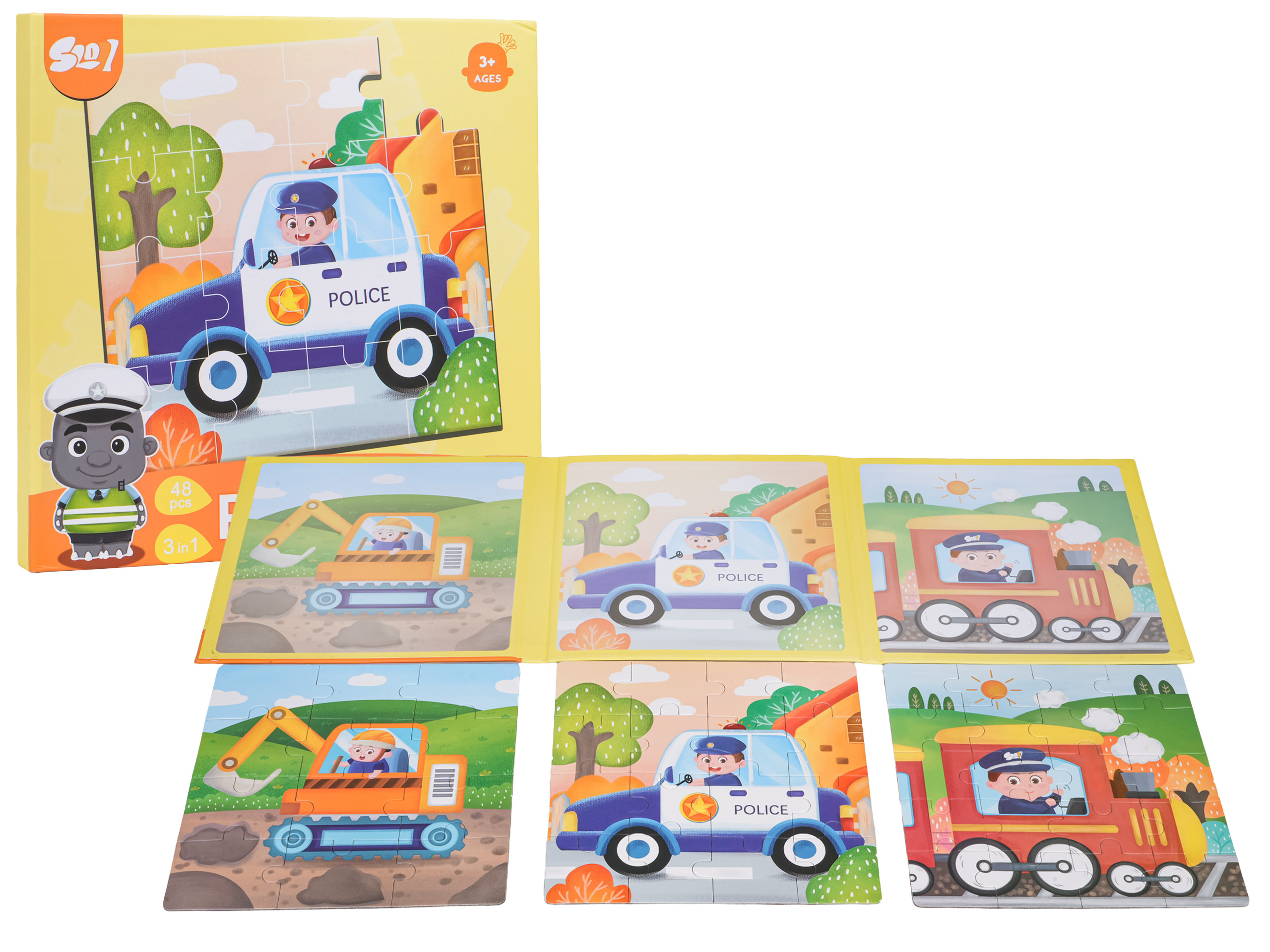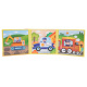 | Barevná knížka s magnetickými puzzly představujícími vozidla pro děti starší tří let. Knížka se skládá ze 3 desek, na každé z nich lze složit obrázek s vozidly. Skládačky mají různé stupně obtížnosti, skládačka s bagrem se skládá z 12 dílků, skládačka s policejním autem z 16 dílků a skládačka s lokomotivou z 20 dílků. Puzzle dobře drží a neodpadávají. Lze je skládat i v kočárku nebo autě. Sada je vyrobena v živých barvách, které dítě povzbuzují k skládání.