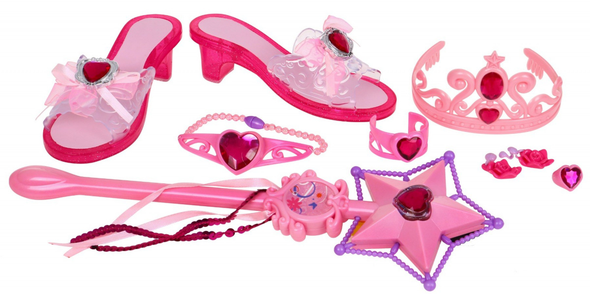| - 2 x pantofle (délka cca. 19 cm, šířka přibližně. 7 cm, výška podpatku přibližně. 4 cm), - interaktivní hůlka (cca. 15,5 cm x 11,5 cm), - diadém, - náhrdelník, - náramek, - 2 x náušnice, - prsten. | |