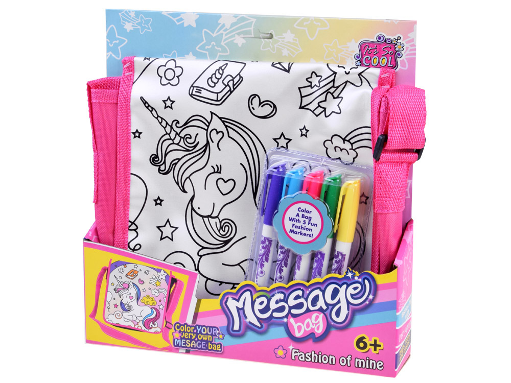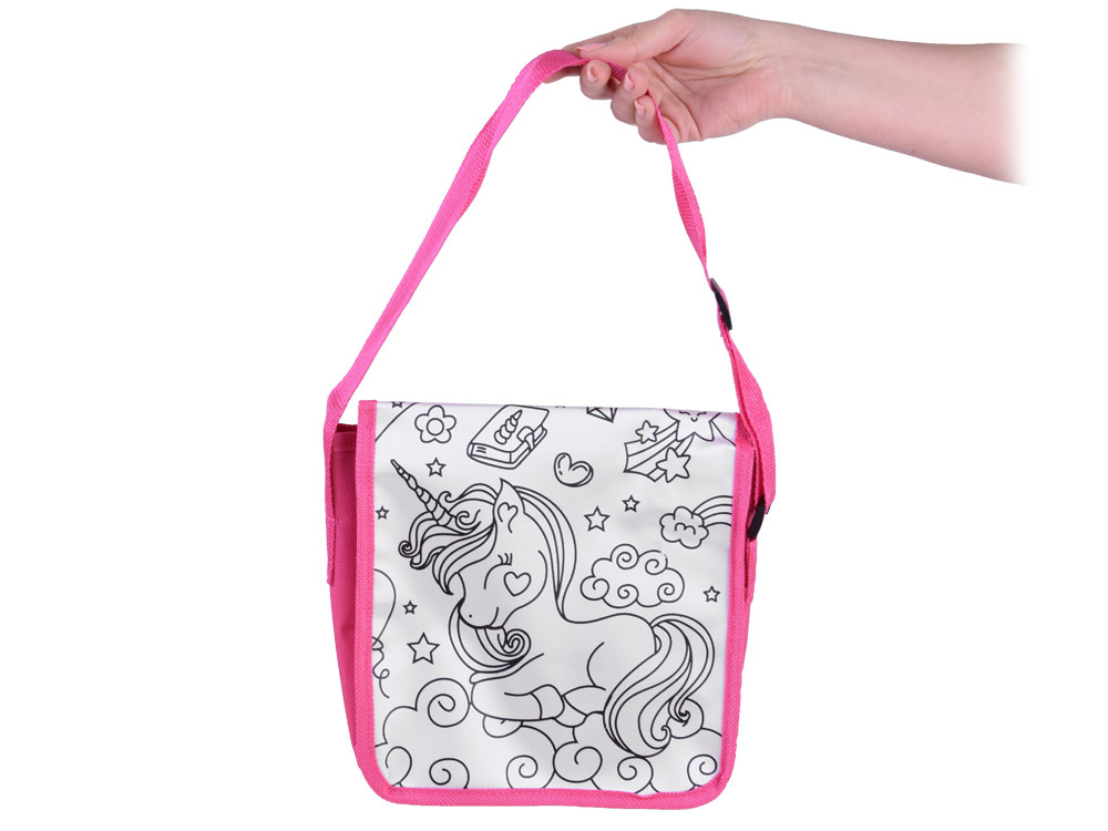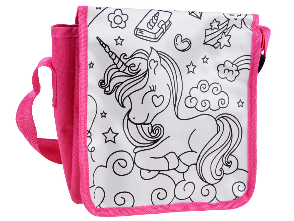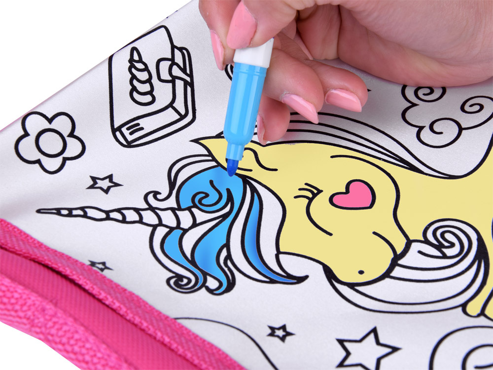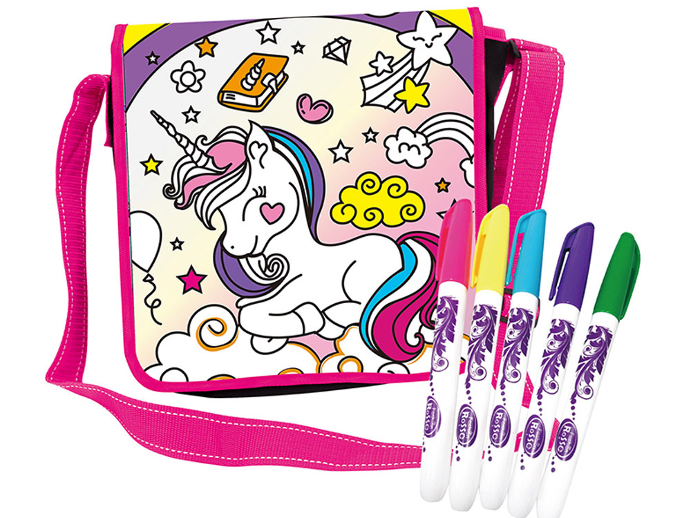 Taška na malování jednorožců je vhodná pro všechny malé umělce, kteří rádi tvoří. Tašku si musíte namalovat sami, vlastníma rukama, podle vlastní představy, konceptu. Černá grafika zobrazuje rozkošného jednorožce s hvězdami, mraky, květinami a dalšími pohádkovými prvky. Úkolem malého umělce je namalovat tašku tak, aby byla jedinečná a nenapodobitelná. K tomu slouží pera, která jsou součástí sady.