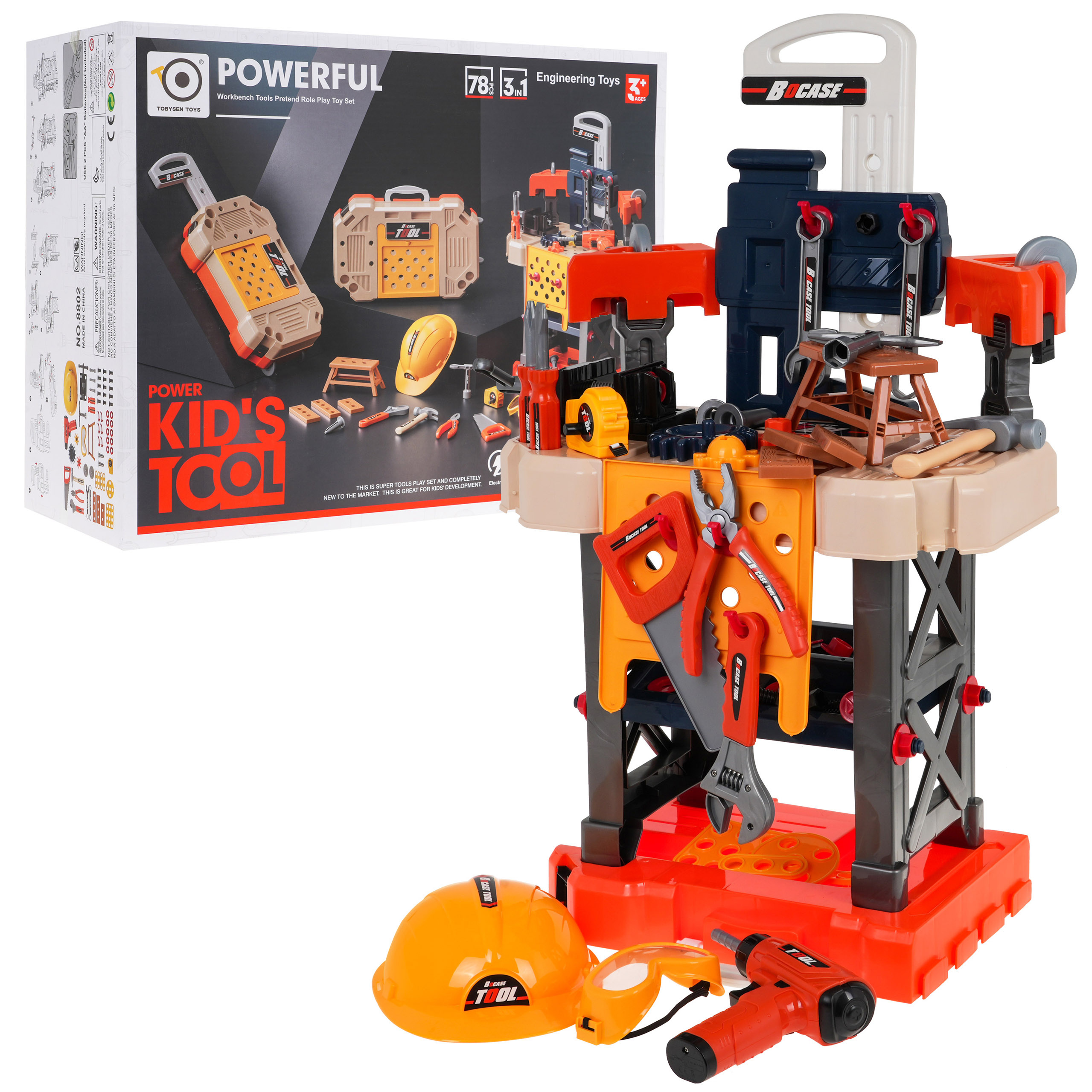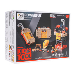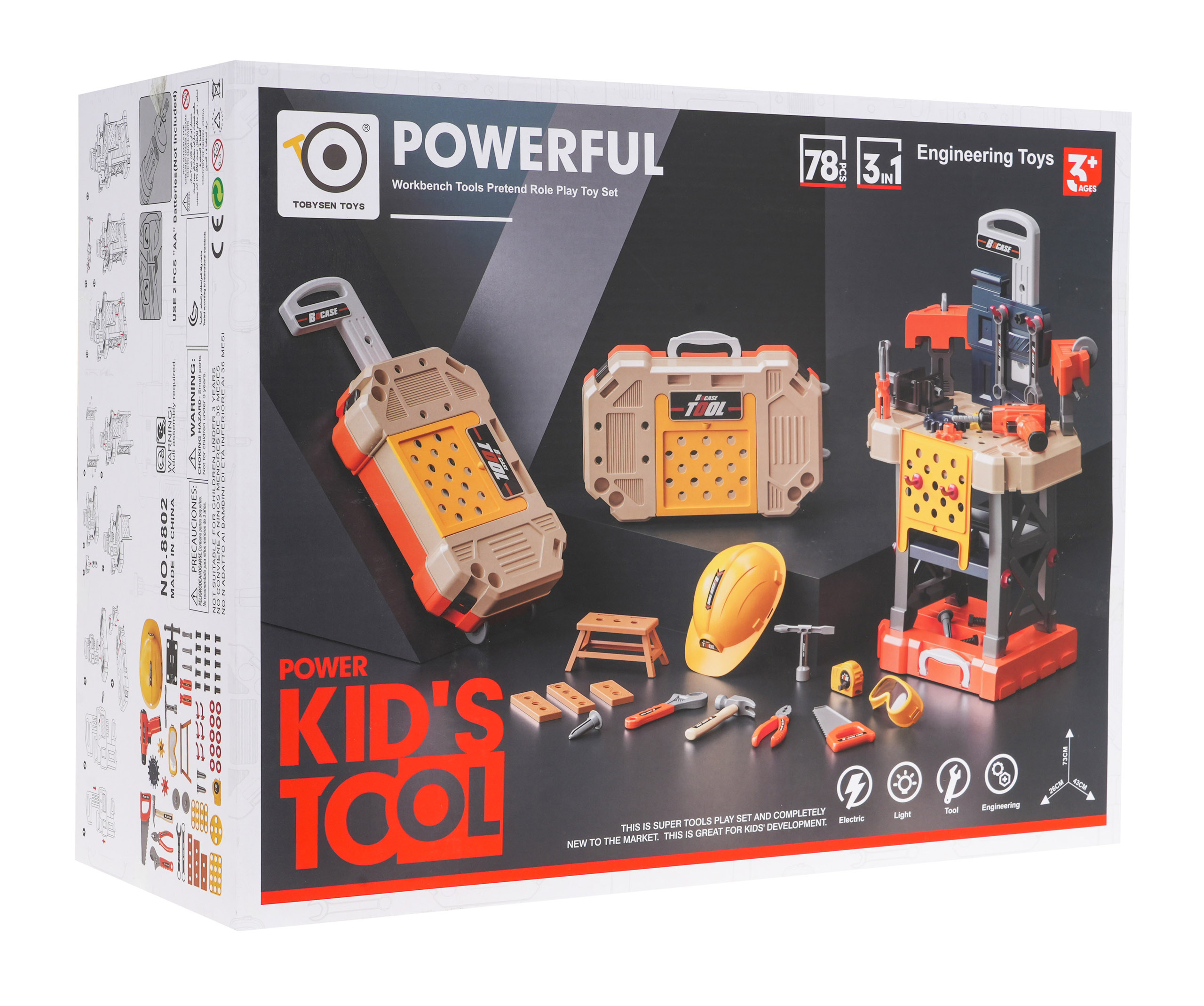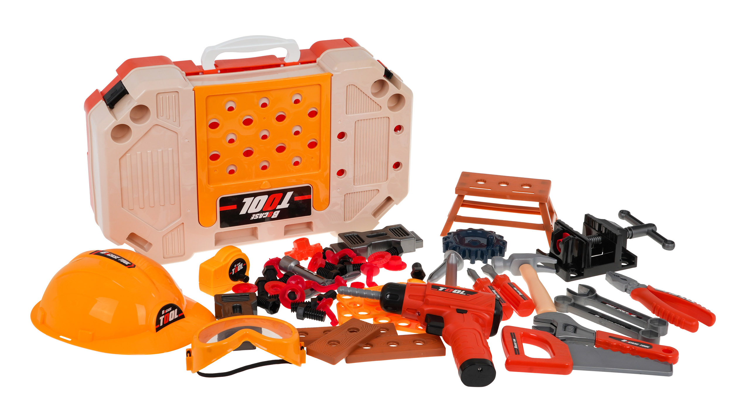 Dobře vybavená sada nářadí 3 v 1 pro malé kutily od 3 let. Ze sady si můžeme postavit pracovní stůl, a až si s ním přestaneme hrát, přeměnit ho na kufřík na nářadí, které je součástí sady. Můžeme vyrobit kufr s rukojetí pro přenášení nebo kufr na kolečkách pro tlačení. Sada obsahuje 78 položek, jako jsou dílenské komponenty, helma, pila, šroubováky, akumulátorová vrtačka/šroubovák, velké množství šroubů atd. Šroubovák je napájen bateriemi typu 2 x 1,5 V AA, baterie nejsou součástí dodávky. Šroubovák funguje stejně jako skutečný, šroubuje, odšroubovává a při práci svítí červená LED dioda na přední straně hračky.