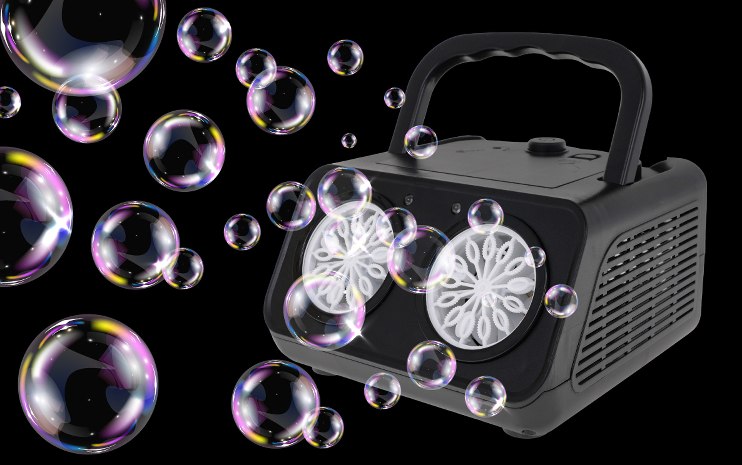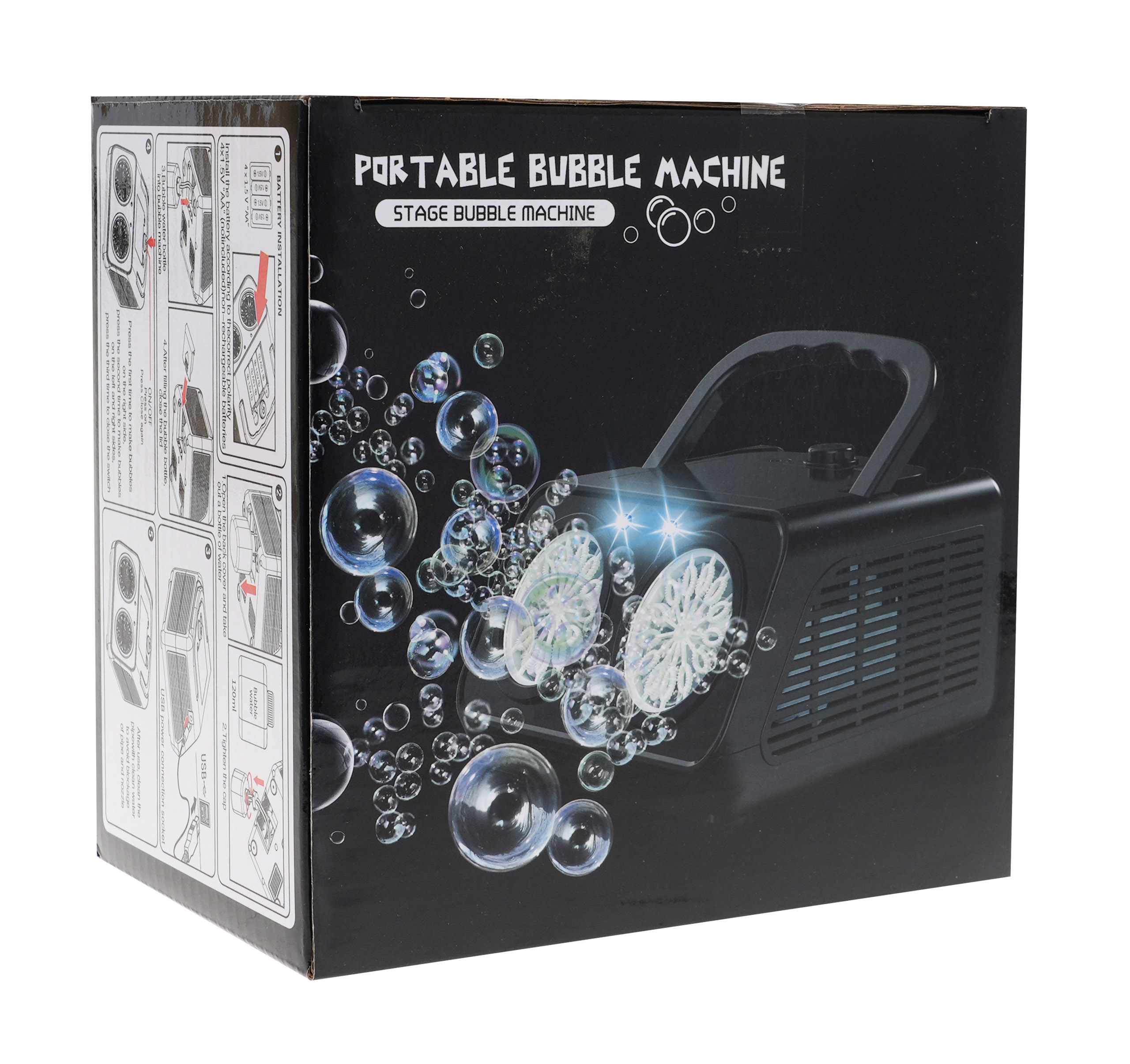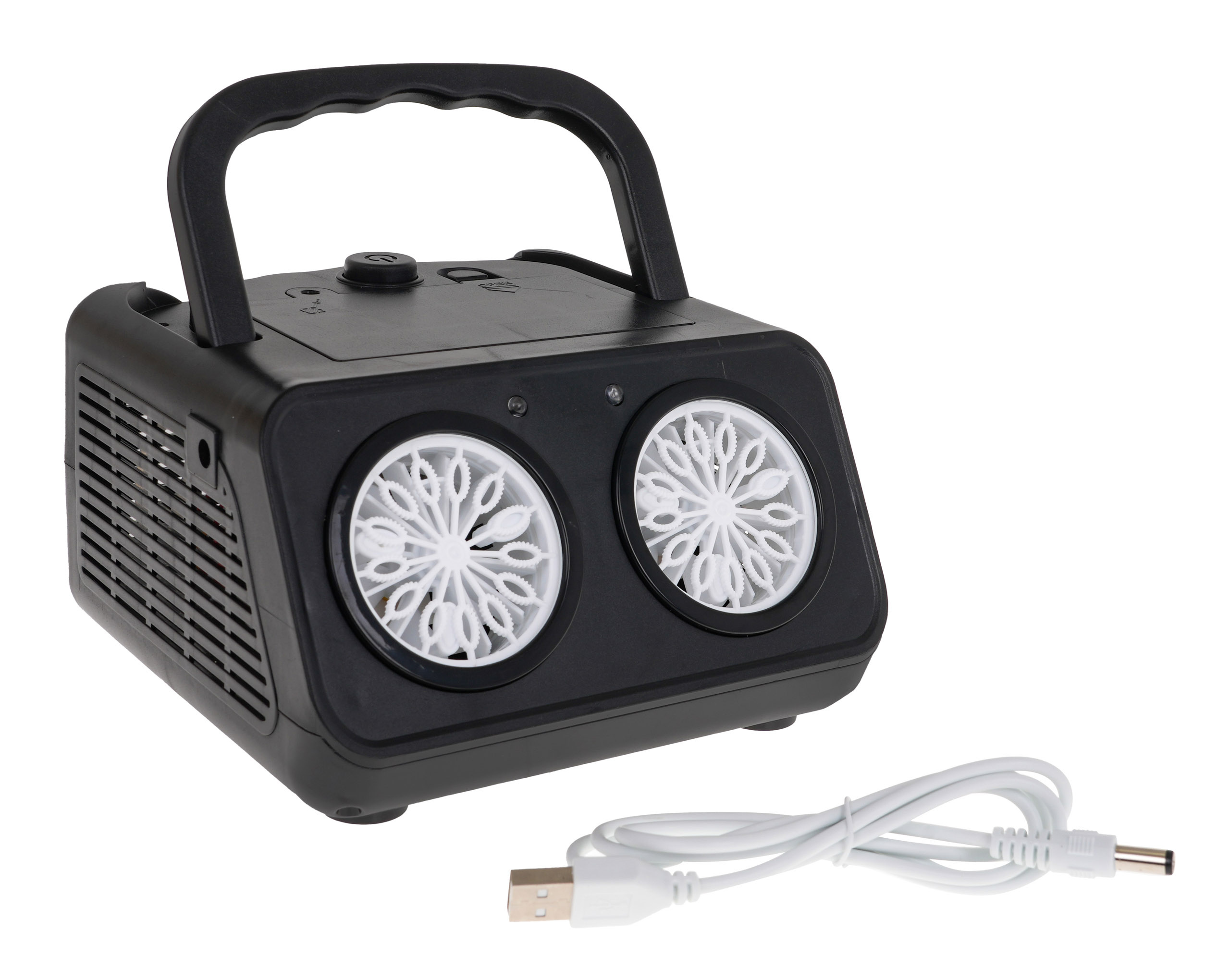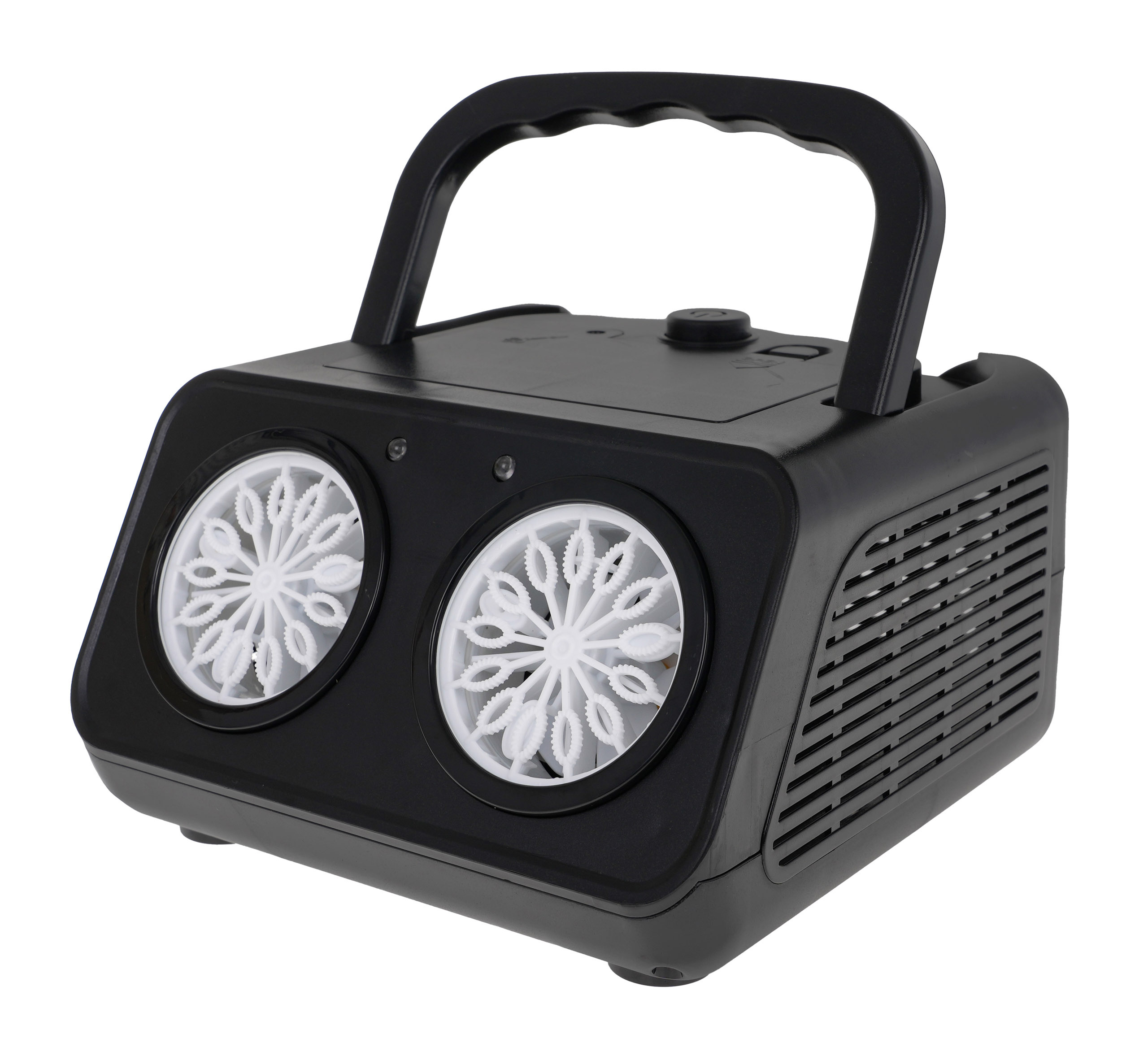Stroj na bubliny, výrobník bublin se dvěma tryskami pro děti od 3 let, teenagery a dospělé. Výkonný generátor zpestří každou párty. Po nadávkování speciální kapaliny nebo mýdlové vody se ze dvou trysek vynoří barevné mýdlové bubliny, které tichý ventilátor instalovaný ve stroji rozfoukává. Kromě toho jsou bubliny osvětleny dvěma LED diodami umístěnými na tryskách. Generátor je napájen 4 bateriemi AA 1,5 V, baterie nejsou součástí dodávky. Stroj je vybaven pohodlnou rukojetí pro přenášení.