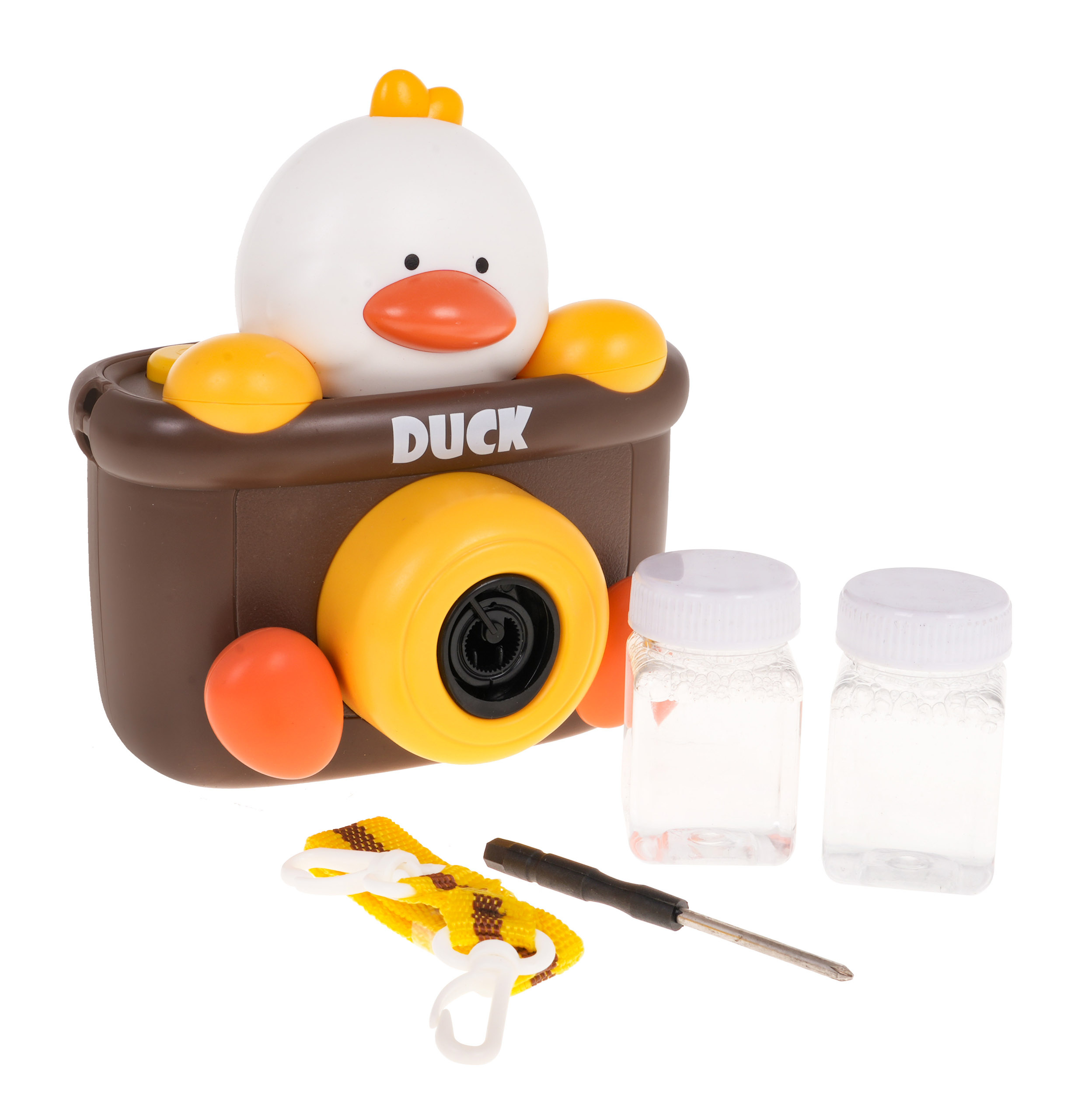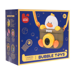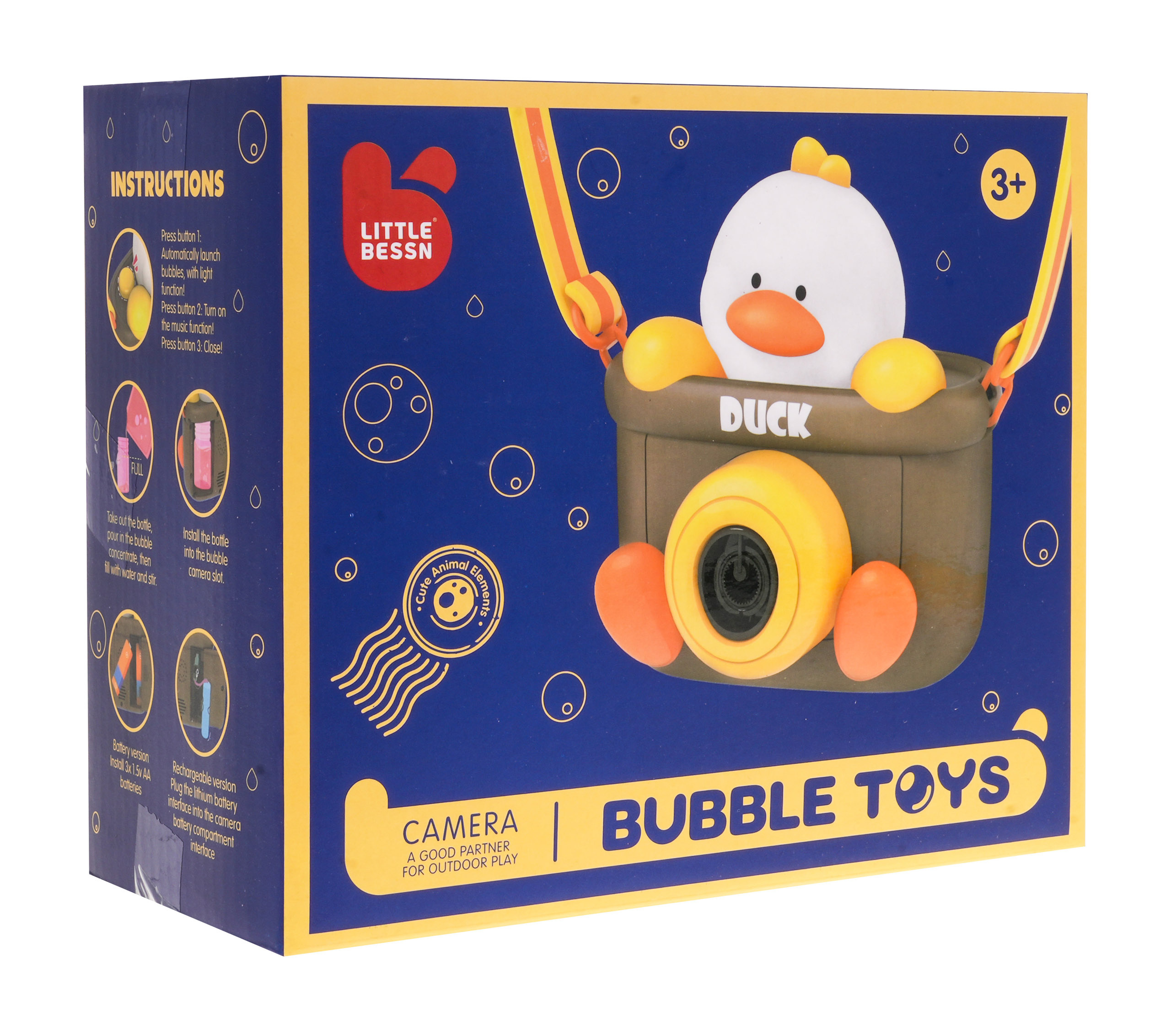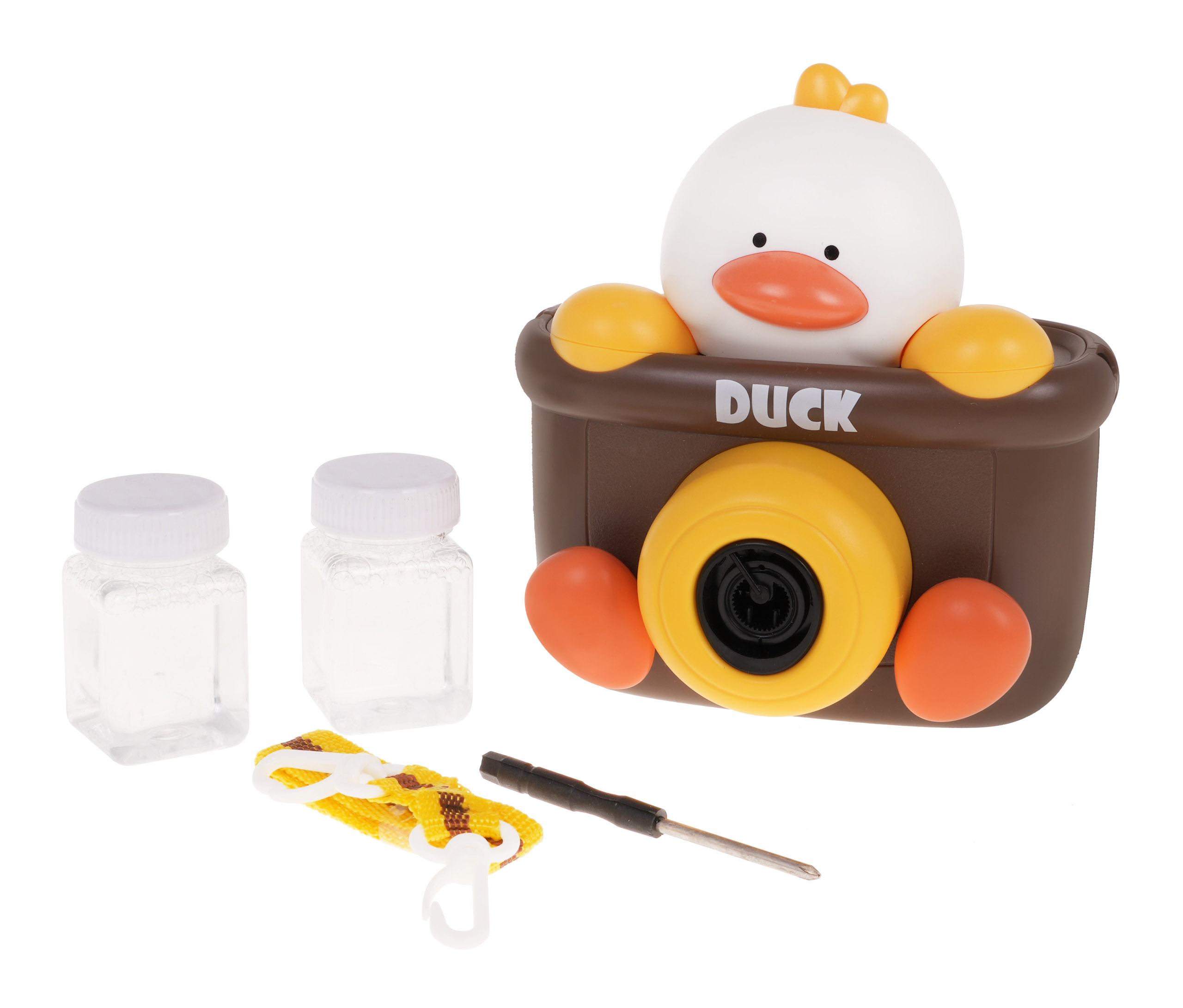 Interaktivní stroj na mýdlové bubliny připomínající fotoaparát ve tvaru kachny je vhodný pro děti od 3 let. Hračka se snadno používá, stačí doplnit tekutinu na mýdlové bubliny, která je součástí sady, a vložit baterie. Na bříšku kachničky je tryska, ze které se za doprovodu veselých melodií vypouštějí mýdlové bubliny. Hračka také napodobuje zvuk spouště skutečného fotoaparátu. Holicí strojek je vybaven pohodlným popruhem, který umožňuje nošení přes rameno. Hračka je napájena 3 bateriemi AA 1,5 V, které nejsou součástí balení.