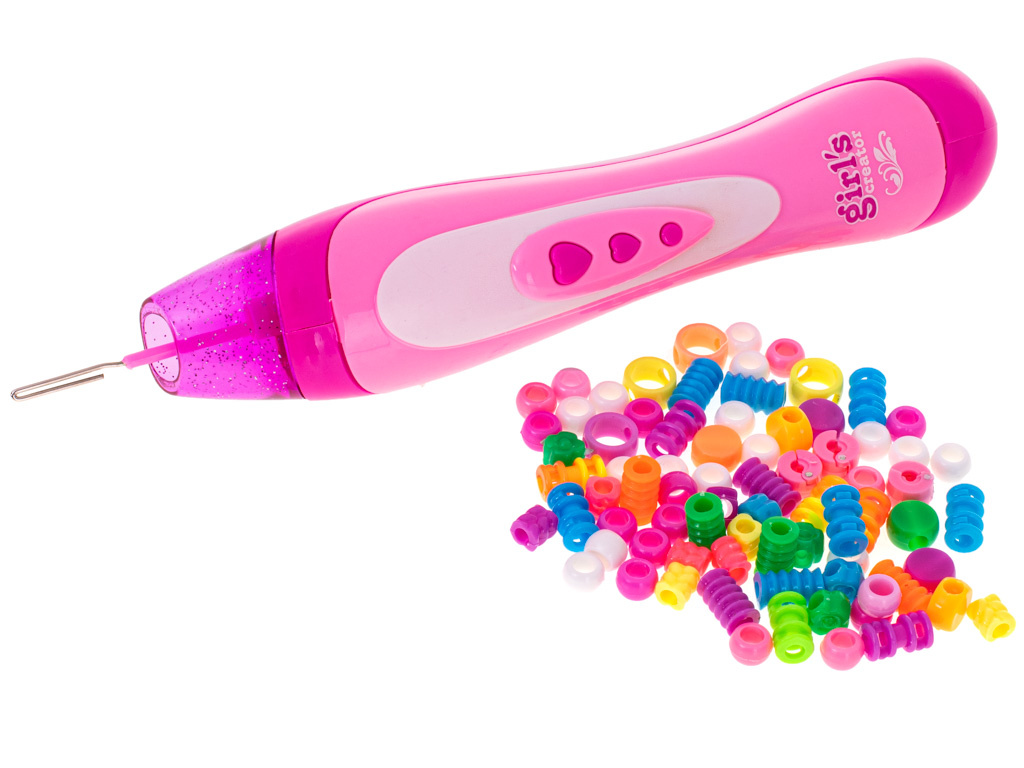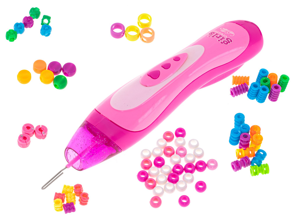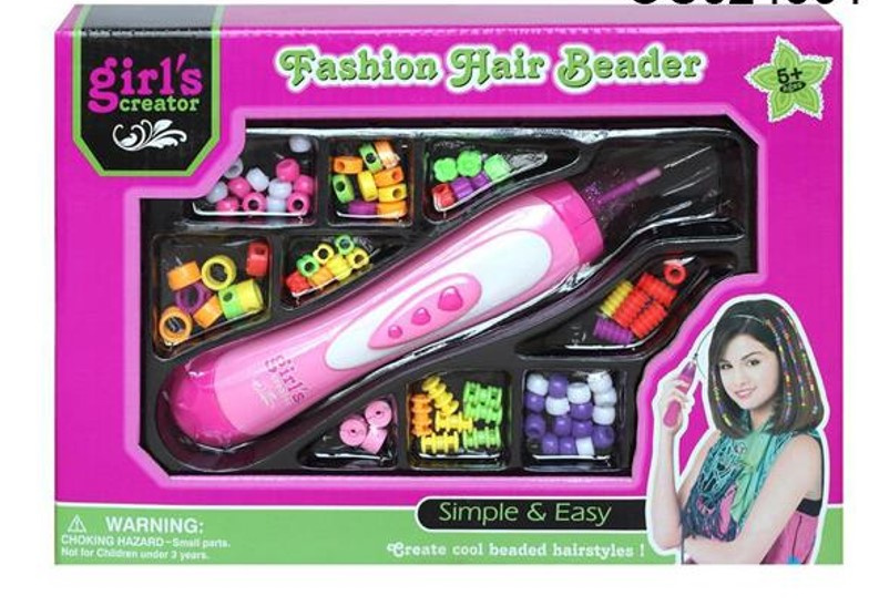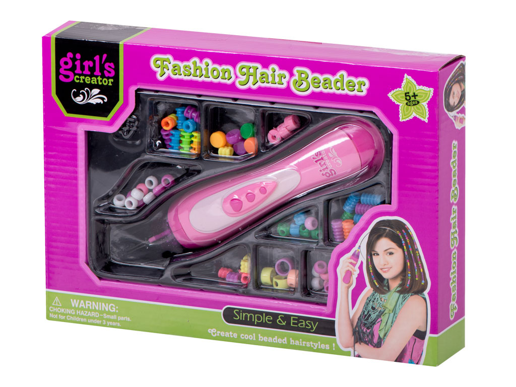 Růžový strojek na zaplétání korálků do vlasů. Díky barevným korálkům, které jsou součástí balení, si můžete vytvořit vlastní jedinečný účes. Vyjádřete se efektním účesem! Materiál: plast. Rozměry holicího strojku: přibližně.22cm. Počet korálků: 78ks.Celý popis