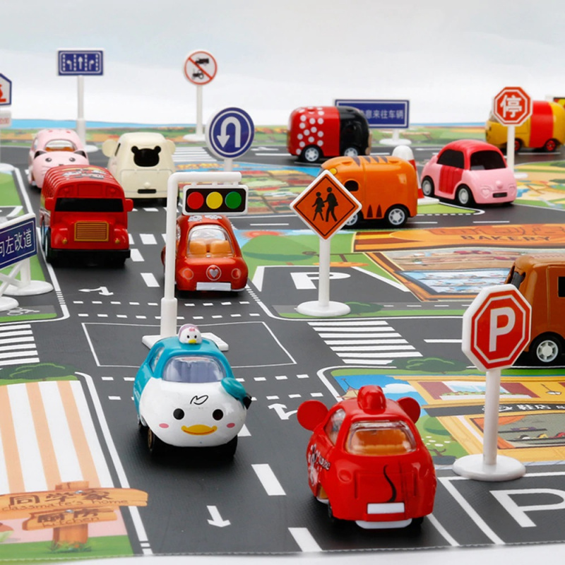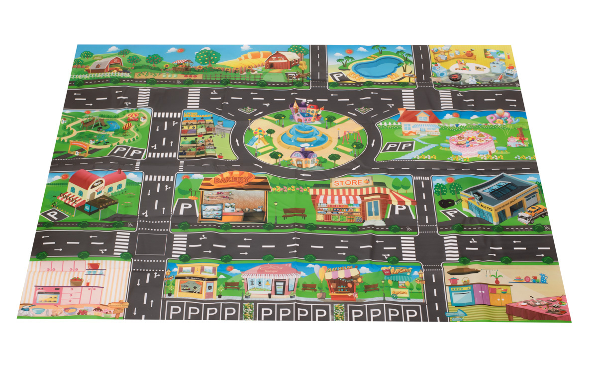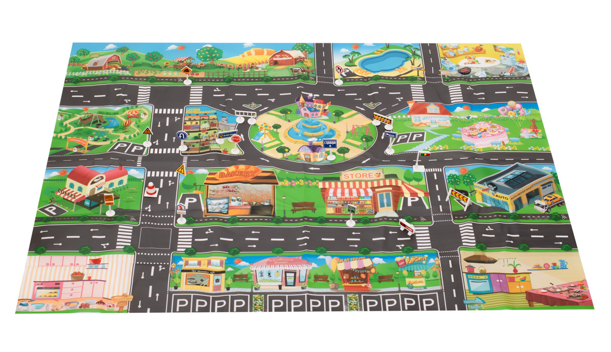 Velká voděodolná dětská podložka s městským designem a doplňky.Je vyroben z plastu podobného olejové tkanině, je velmi tenký a lehký. Sada obsahuje m.in. 18 různých dopravních značek a 18 samolepek. Rozměry: 130 x 100 cm