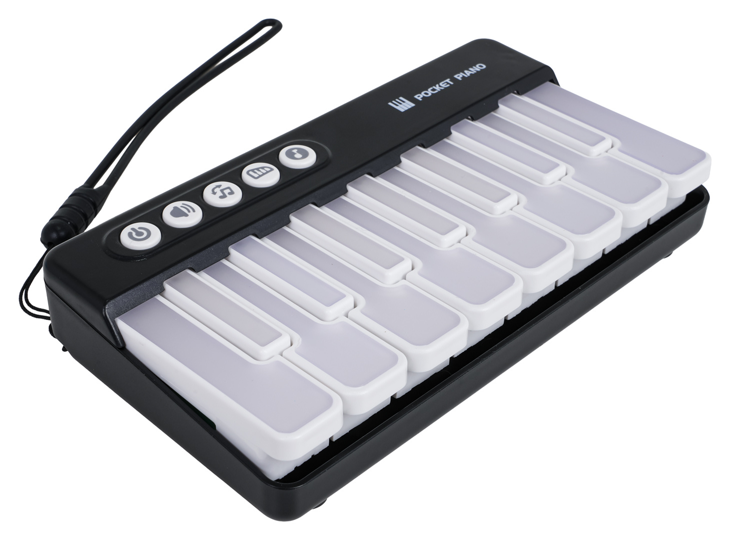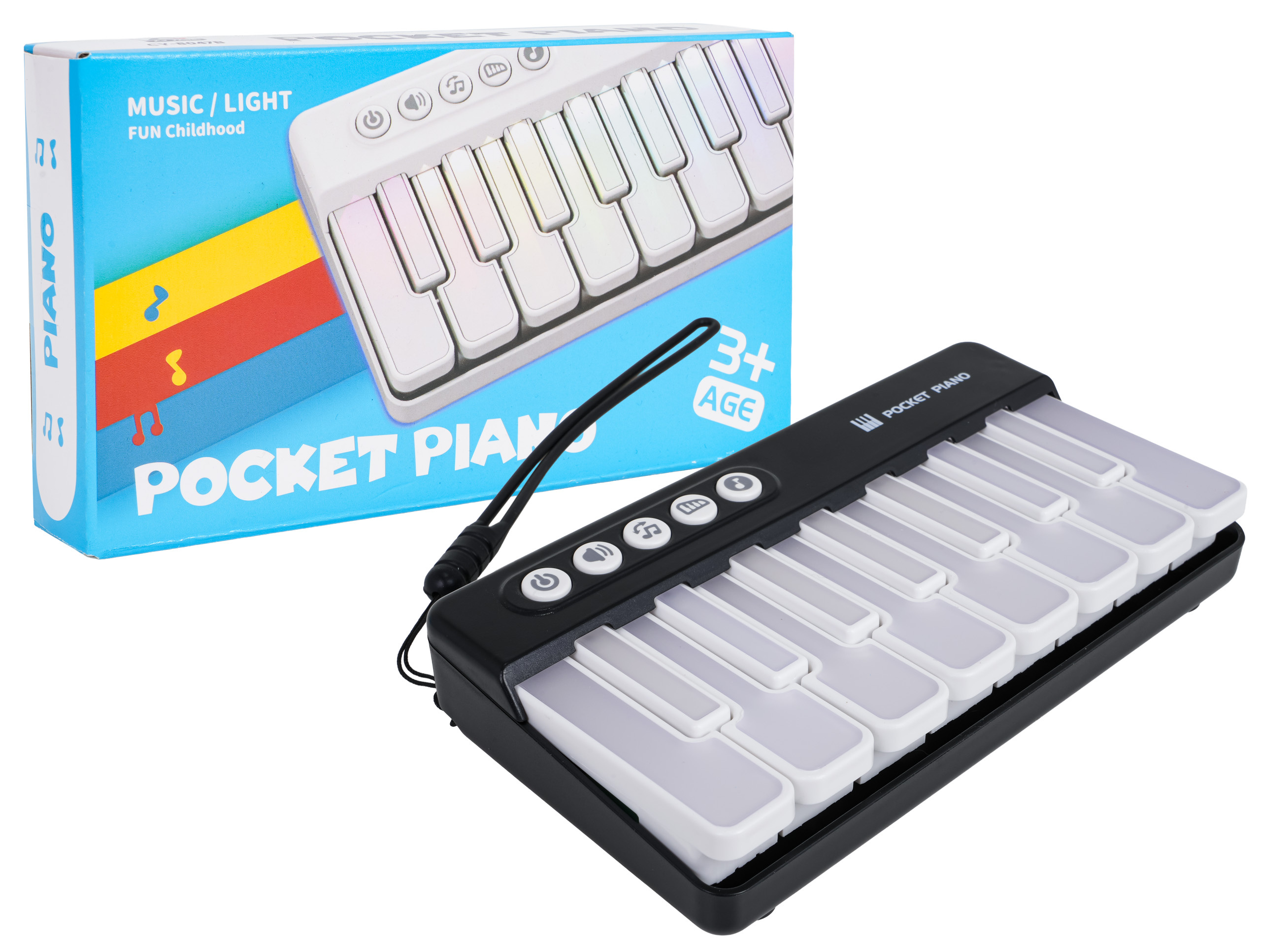 Přenosné černé pianko, pro děti od tří let. Pianinko bude užitečné při učení hry díky podsvíceným klávesám, které ukazují, jak hrát. Konstrukce pianina je lehká a kompaktní, což umožňuje vzít ho kamkoli s sebou. Hračka je napájena bateriemi typu 3 x AAA 1,5V (nejsou součástí balení).