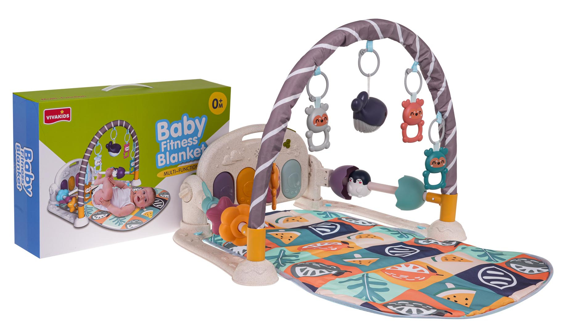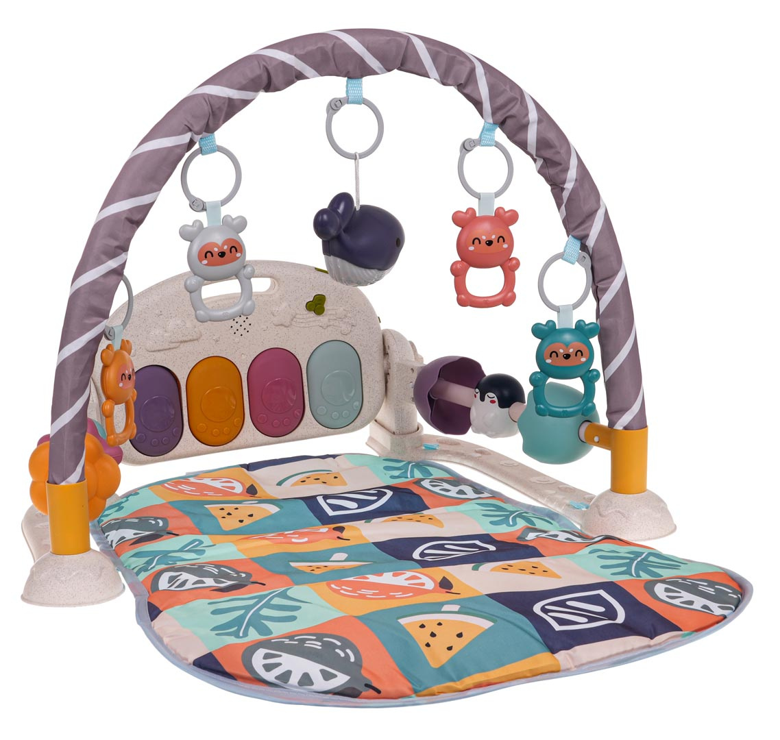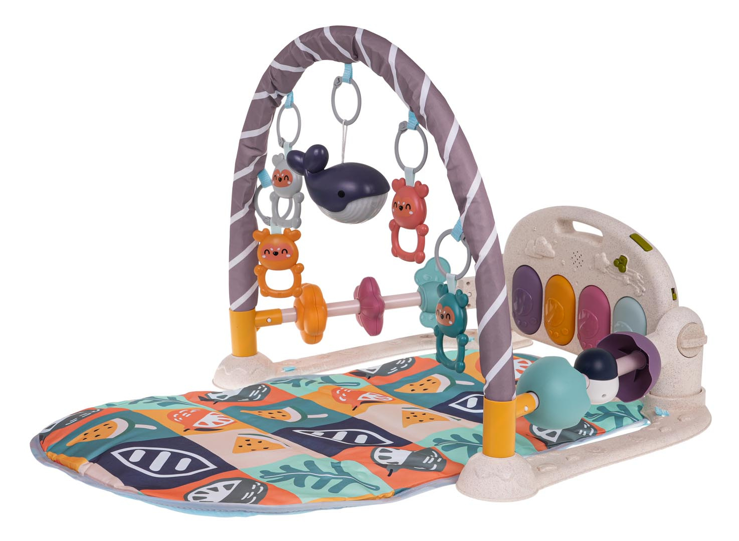 Interaktivní, multifunkční podložka pro nejmenší od prvních dnů života. Sada se skládá z pohodlné podložky pro miminko, oblouku se závěsy a piánka. Mata roste spolu s dítětem. V prvním období života, do šestého měsíce života, může miminko ležet na pohodlné podložce, kopat nožičkami do piánka a pohybovat ručičkami ve snaze dosáhnout na zavěšené hračky na oblouku. Mezi šestým a dvanáctým měsícem bude sada nesmírně užitečná při učení sezení. Starší dítě může hrát na piánko už samostatně. Pianinko lze velmi snadno přeměnit na hudební stolek pomocí regulačních knoflíků, které se nacházejí po stranách konstrukce. Můžeme naklánět piánko do několika poloh, nebo jej odpojit od sady a vzít na různá místa. Navíc má piánko pohodlnou rukojeť pro přenášení. Pianinko je vybaveno čtyřmi podsvícenými klávesami a tlačítkem s notou, které přehrává melodie. Je zde také vypínač a zapínač a regulace hlasitosti. Na oblouku se nacházejí 4 přívěsky s medvídky, které také jemně chrastí, a podsvícený delfínek. Po stranách základny se nacházejí překládky s korálky. Pianinko je napájeno bateriemi typu 3 x AA 1,5 V (nejsou součástí balení). Delfínek na baterie typu 2 x AAA 1,5 V (není součástí balení). Konstrukce sady a piánka je vyrobena z bioplastu, materiálu, který je zcela bezpečný pro nejmenší i pro životní prostředí.