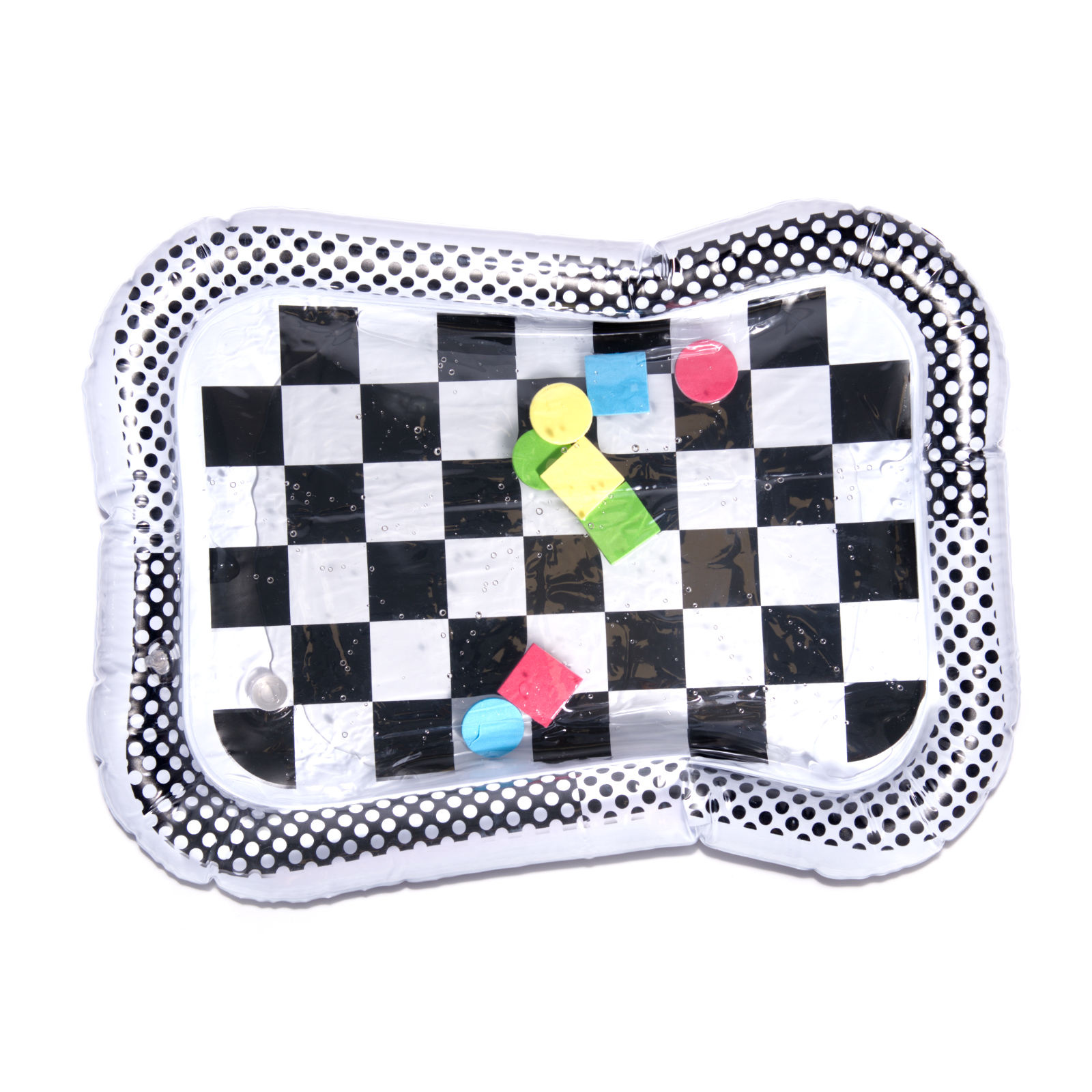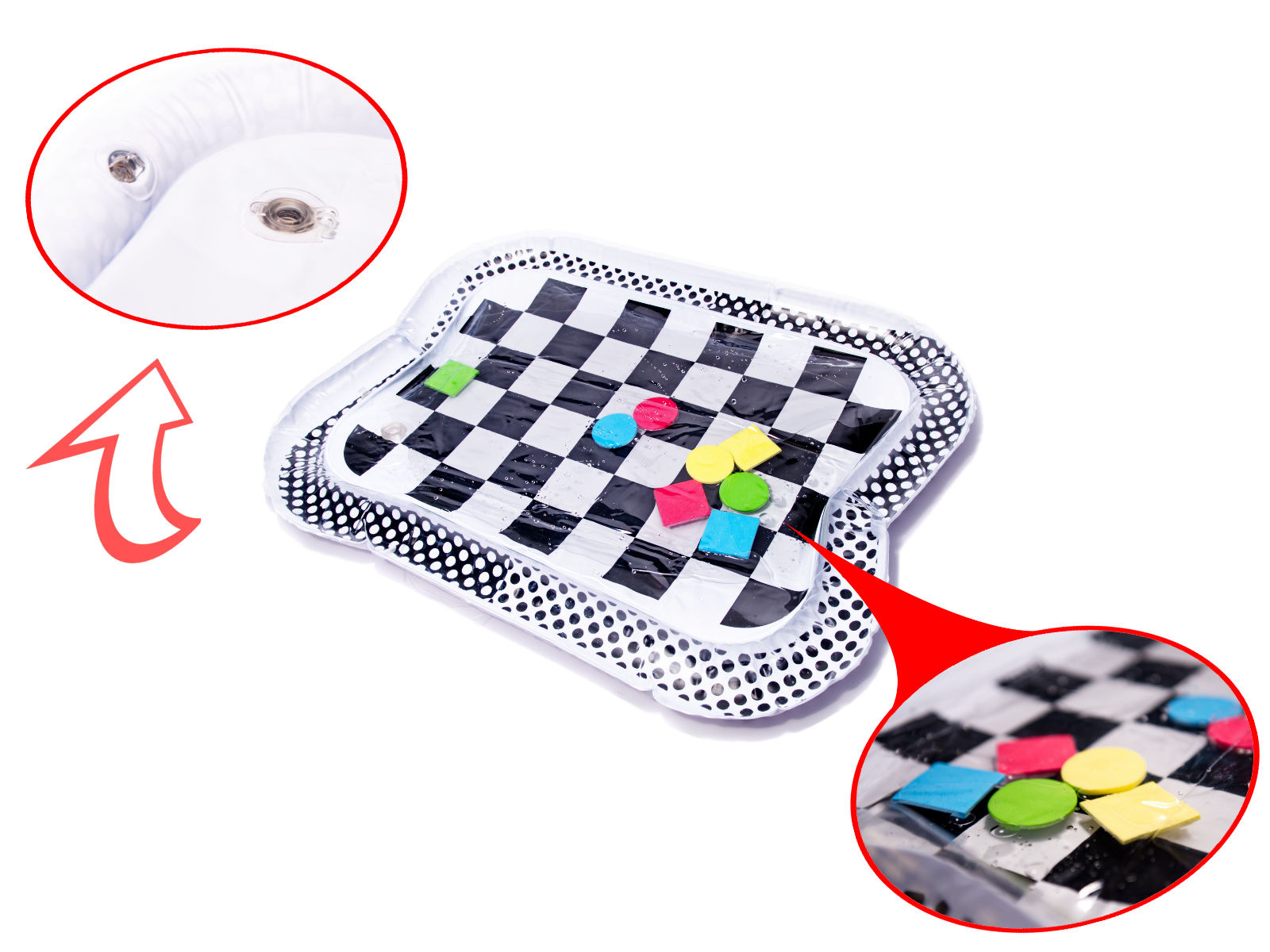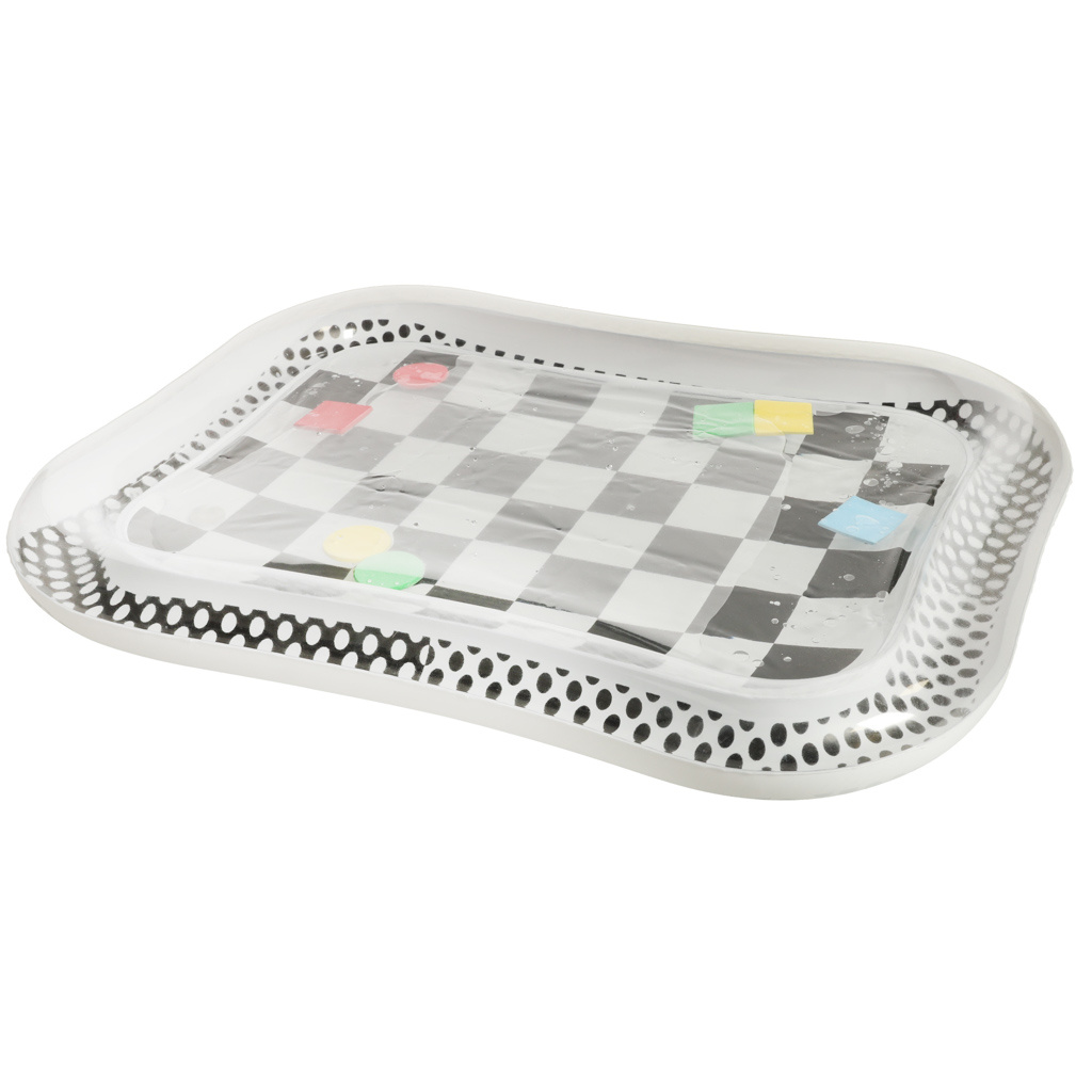 Úžasná senzorická podložka pro děti s kontrastním černobílým vzorem. Uvnitř podložky jsou umístěny barevné geometrické obrazce, které se při pohybu dítěte pohybují. Plovoucí prvky dítě zaujmou a upoutají jeho pozornost. Okraj podložky by měl být nafouknutý vzduchem, zatímco střed je naplněný vodou. Pro dosažení lepších výsledků lze střed naplnit částečně vodou a částečně vzduchem.