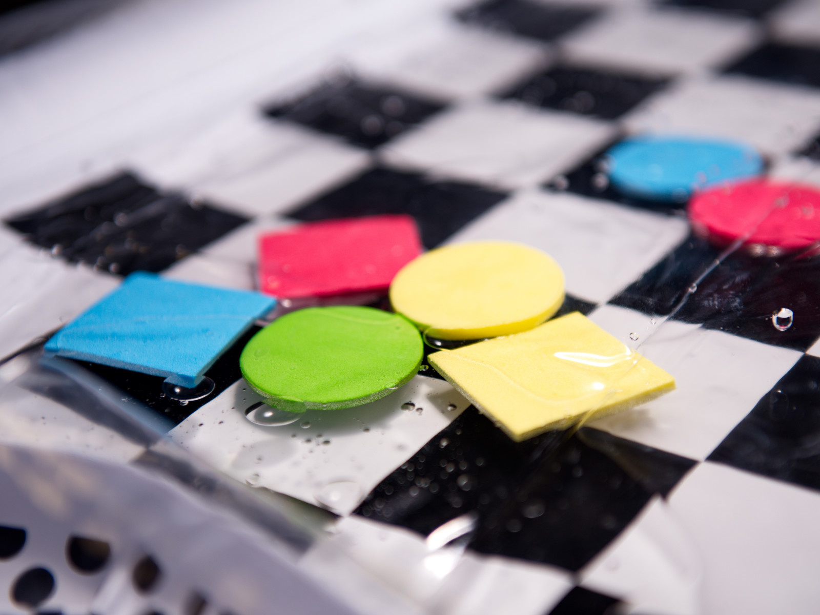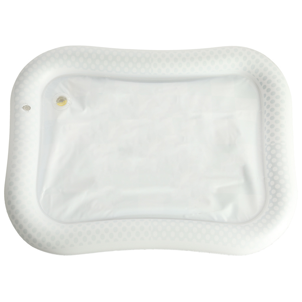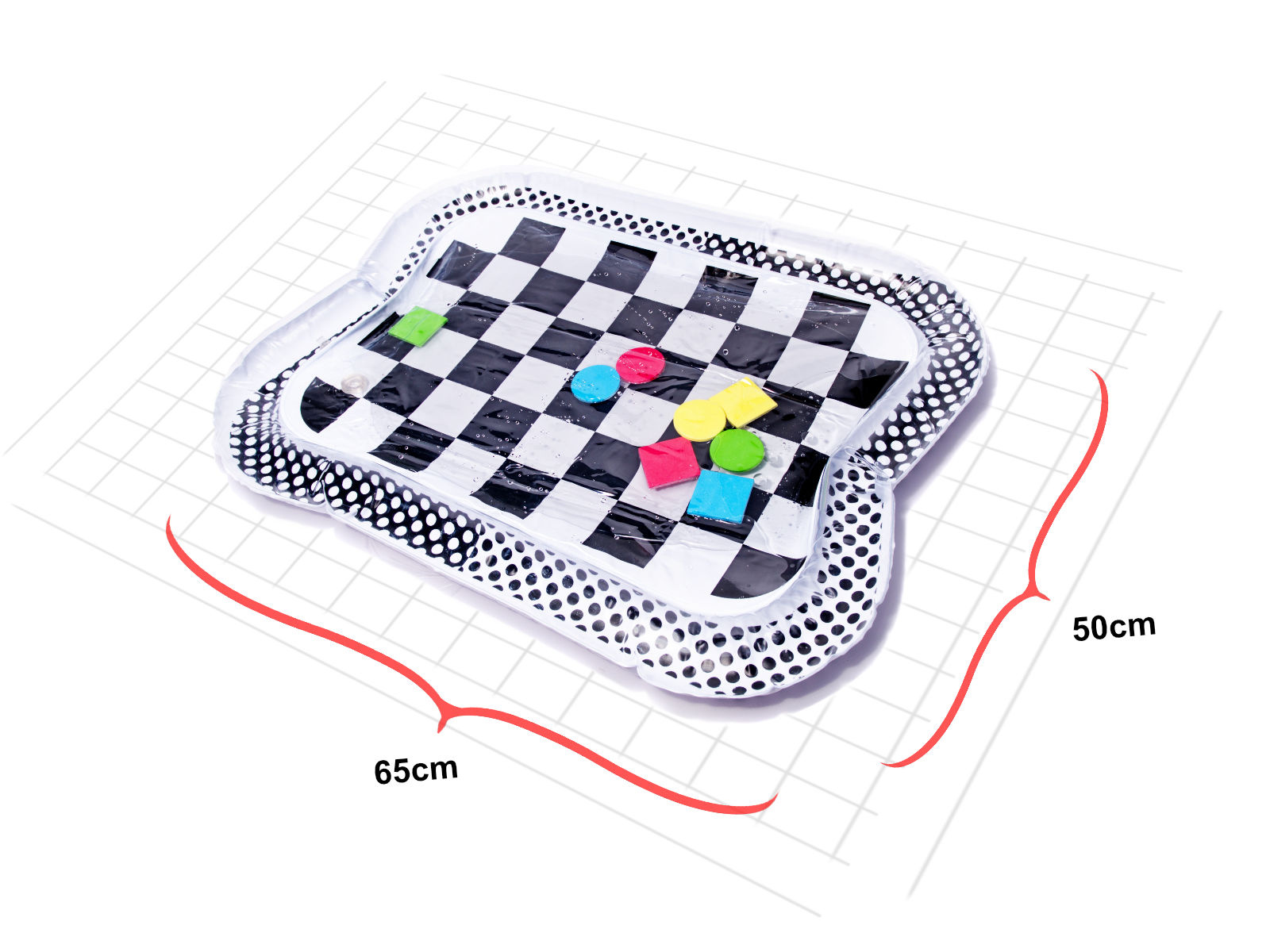 Úžasná senzorická podložka pro děti s kontrastním černobílým vzorem. Uvnitř podložky jsou umístěny barevné geometrické obrazce, které se při pohybu dítěte pohybují. Plovoucí prvky dítě zaujmou a upoutají jeho pozornost. Okraj podložky by měl být nafouknutý vzduchem, zatímco střed je naplněný vodou. Pro dosažení lepších výsledků lze střed naplnit částečně vodou a částečně vzduchem.