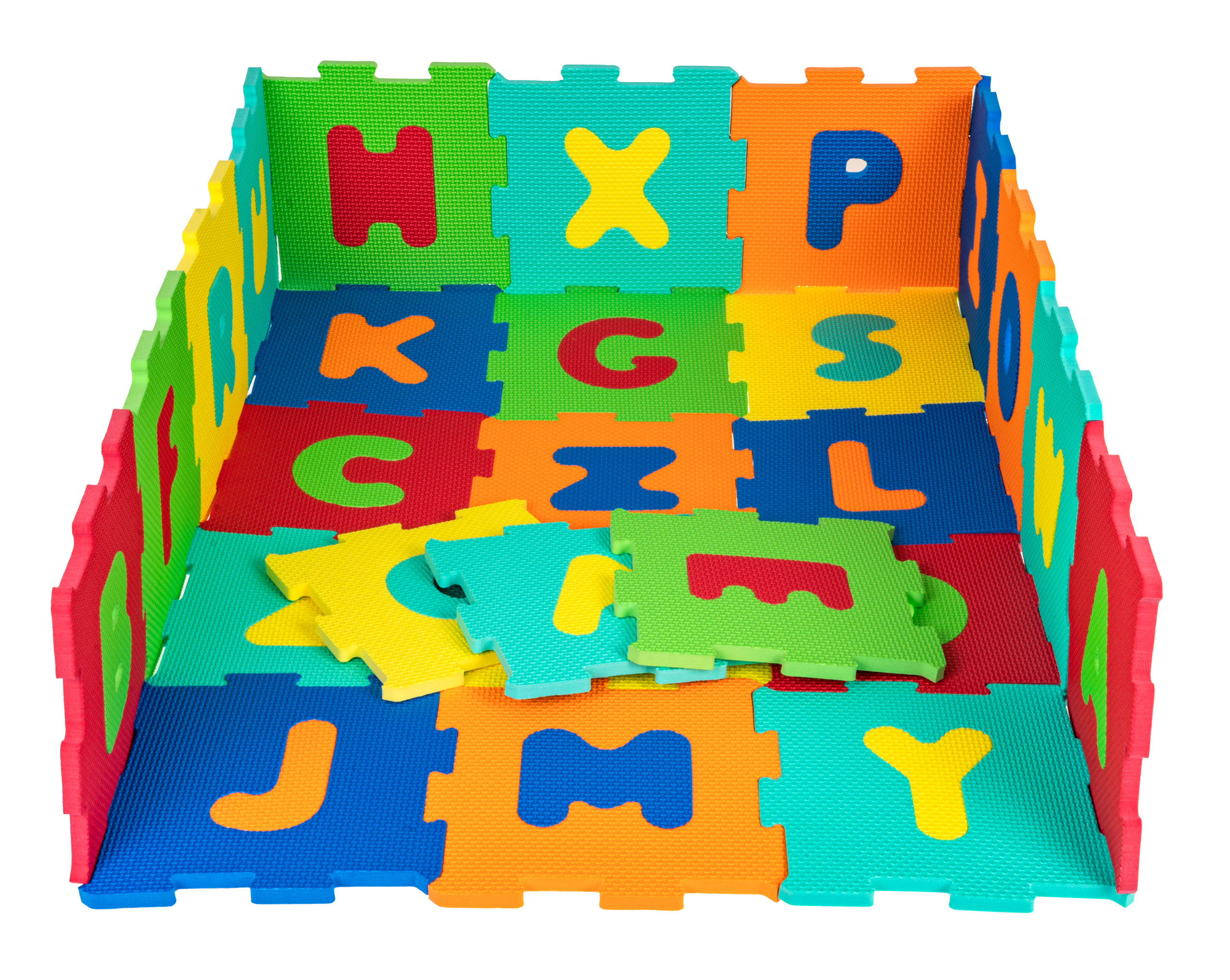 - 26 měkkých pěnových puzzle s vyjímatelnými písmeny abecedy od A do Z,