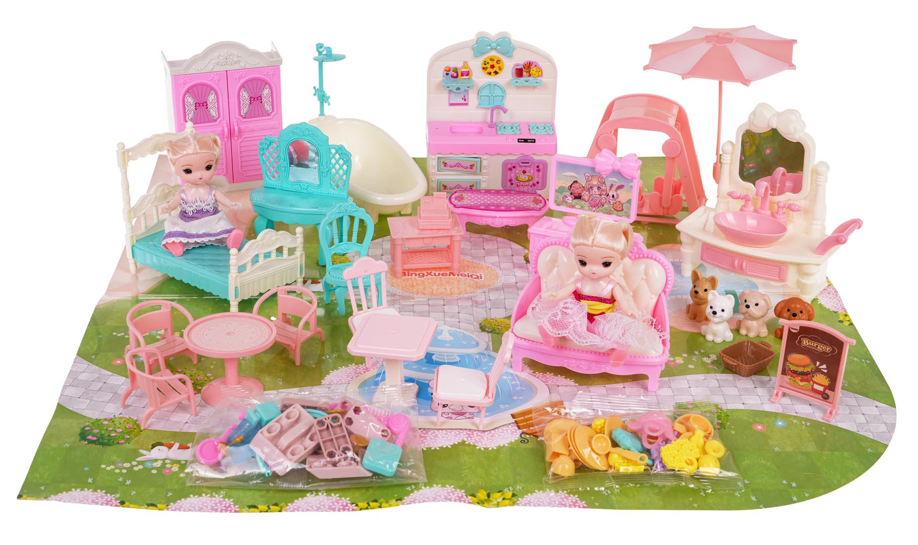 Domeček pro panenky obsahuje řadu doplňků , které umožňují realistické hraní a přehrávání rolí z každodenních scén. Sada obsahuje dvě panenky , čtyři psy a řadu nábytku a doplňků , jako je umyvadlo, vana, šatní skříň, pohovka, konferenční stolek, houpačka a mnoho dalšího. Dále jsou k dispozici pohyblivé části , jako je kuchyň s otevíracími skříňkami a troubou a velká otevírací šatní skříň v ložnici.