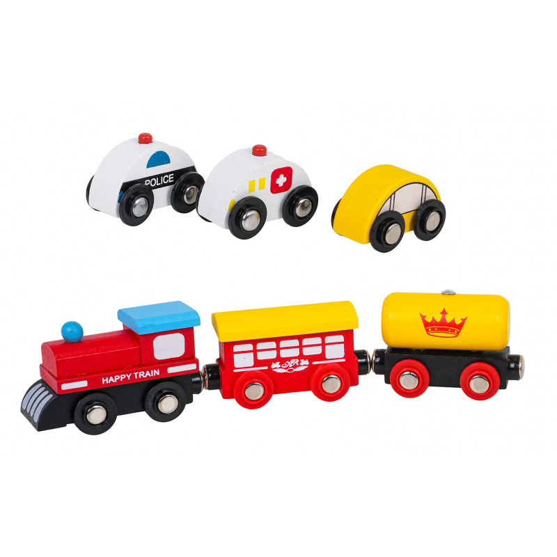 - dřevěná lokomotiva se 3 vagóny spojenými magnety,