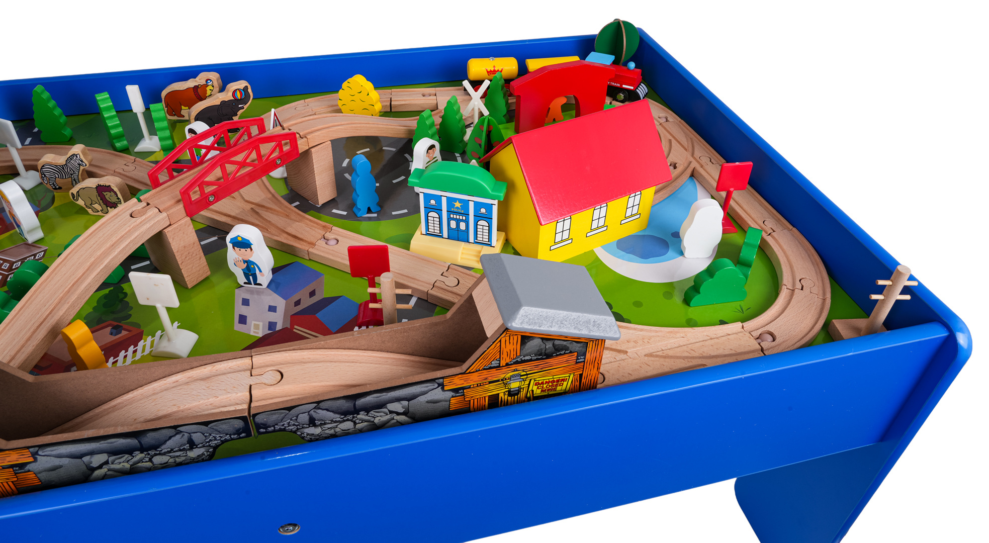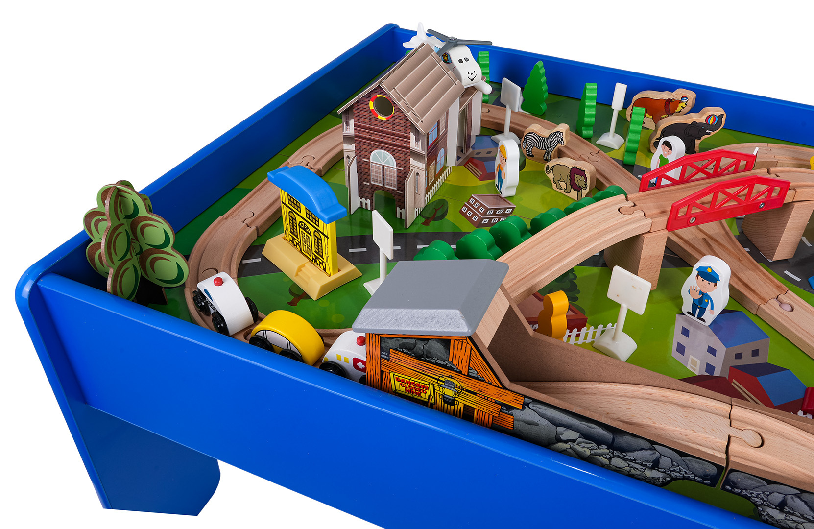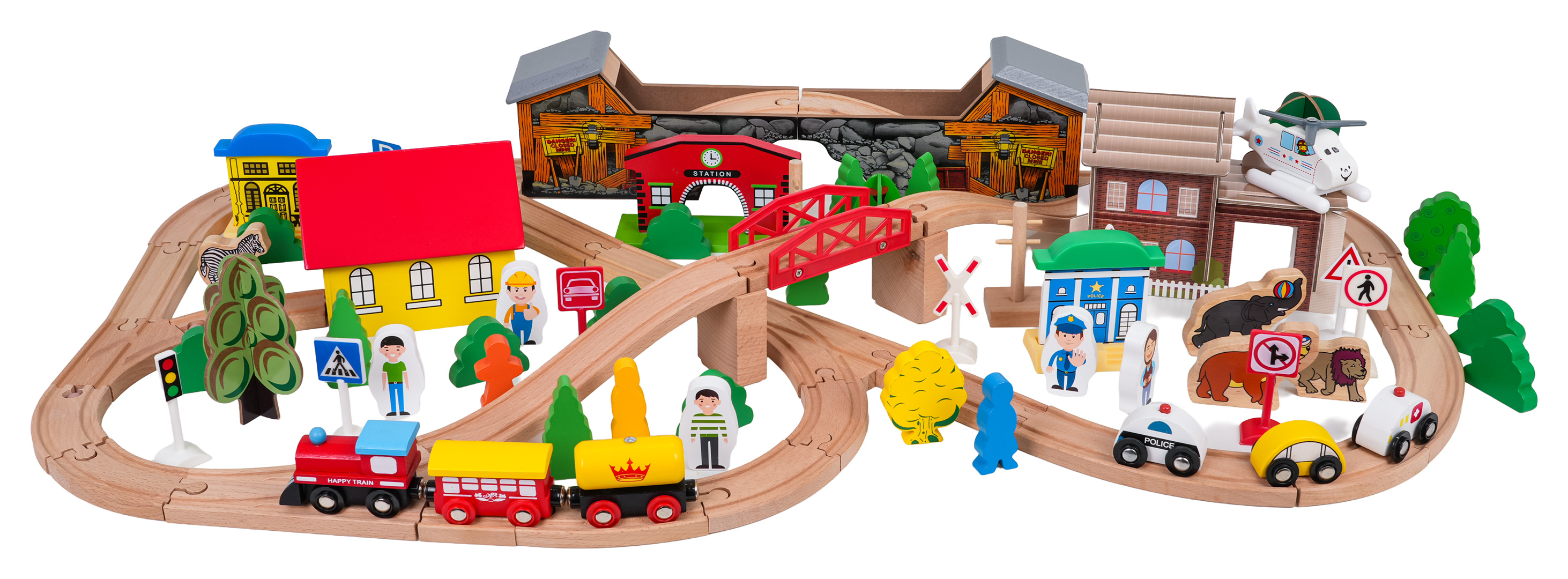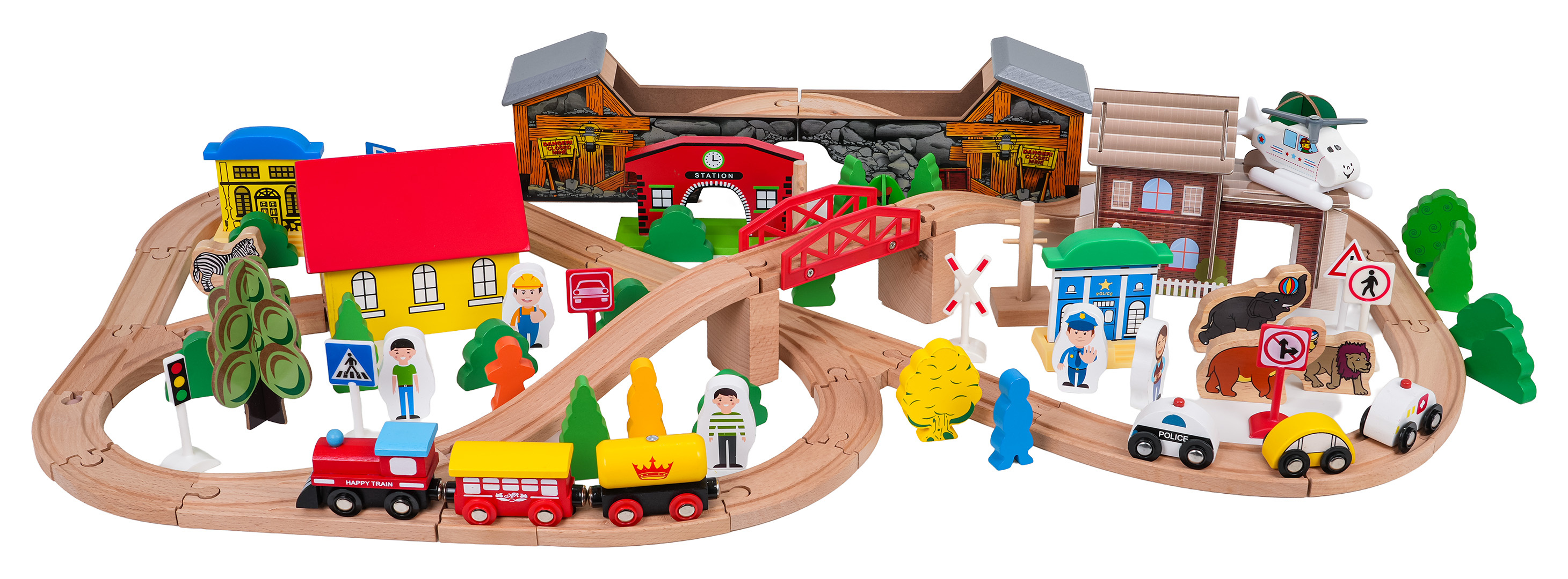 Dřevěná vláčkodráha se stolečkem a spoustou doplňků, pro děti od tří let. Součástí sady jsou dřevěné koleje s vlakem a lanovkou, umístěné na dřevěném, stabilním stole s kresbou cesty na desce. Navíc má stolek okraje vystupující nad úroveň desky, což zabraňuje pádu prvků sady.