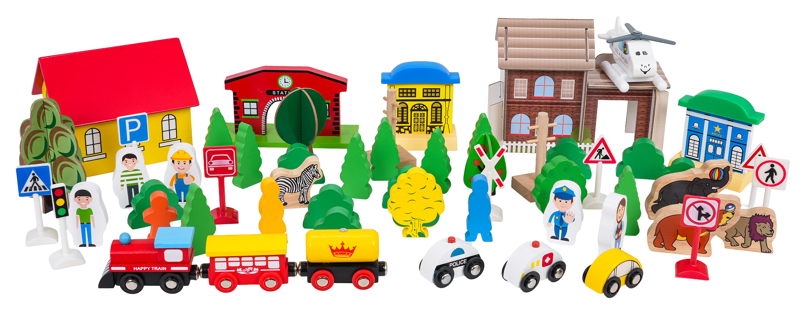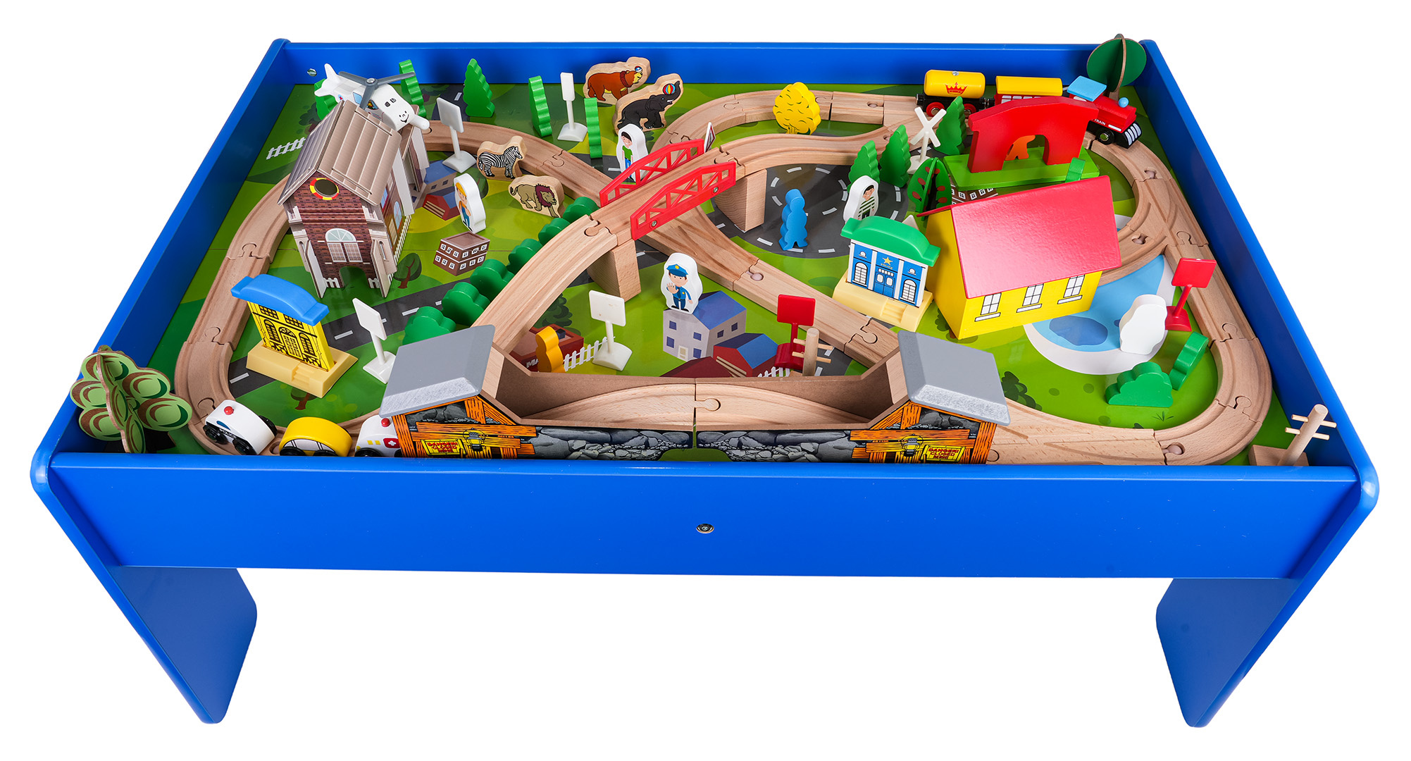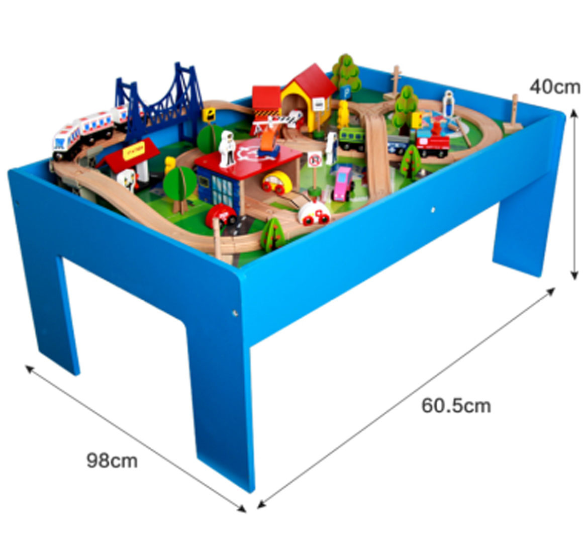 Dřevěná vláčkodráha se stolečkem a spoustou doplňků, pro děti od tří let. Součástí sady jsou dřevěné koleje s vlakem a lanovkou, umístěné na dřevěném, stabilním stole s kresbou cesty na desce. Navíc má stolek okraje vystupující nad úroveň desky, což zabraňuje pádu prvků sady.