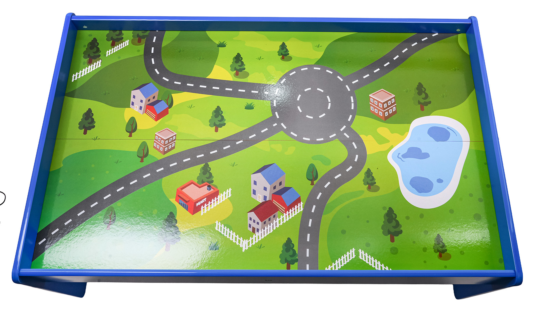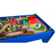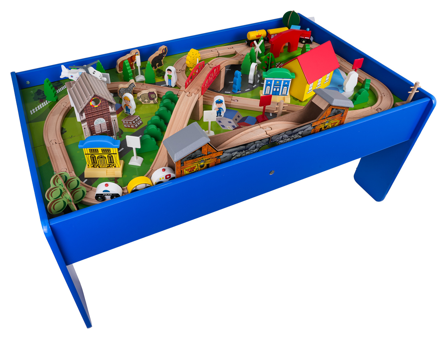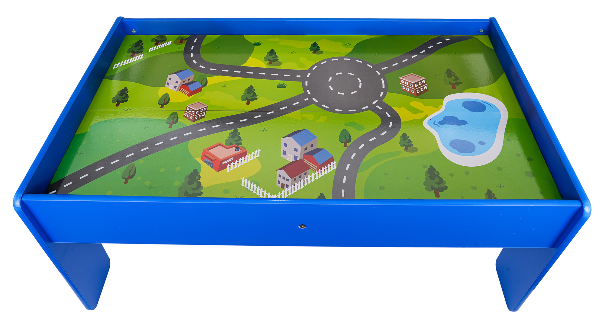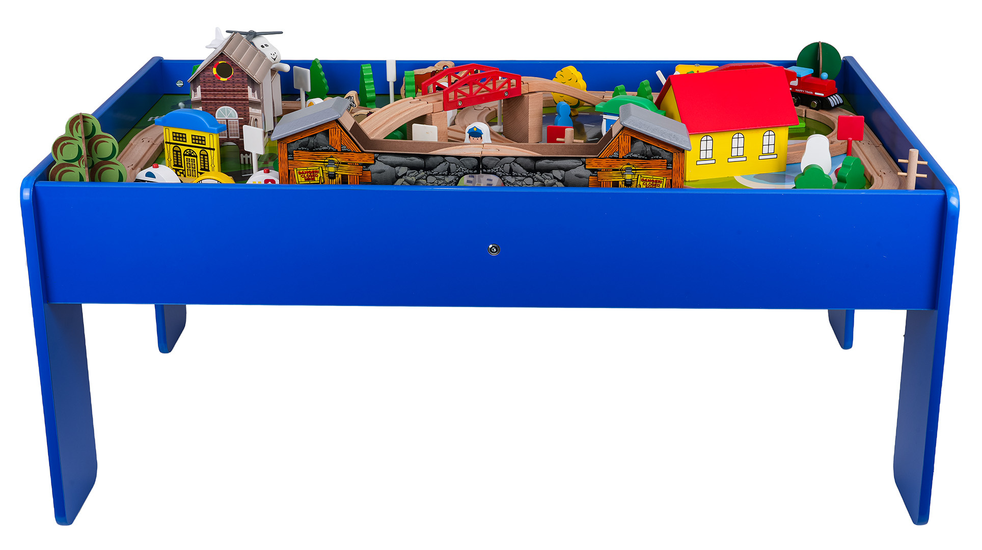 Dřevěná vláčkodráha se stolečkem a spoustou doplňků, pro děti od tří let. Součástí sady jsou dřevěné koleje s vlakem a lanovkou, umístěné na dřevěném, stabilním stole s kresbou cesty na desce. Navíc má stolek okraje vystupující nad úroveň desky, což zabraňuje pádu prvků sady.