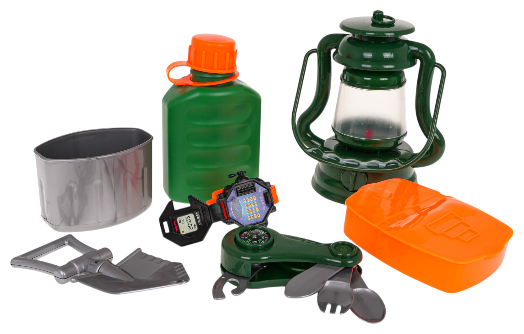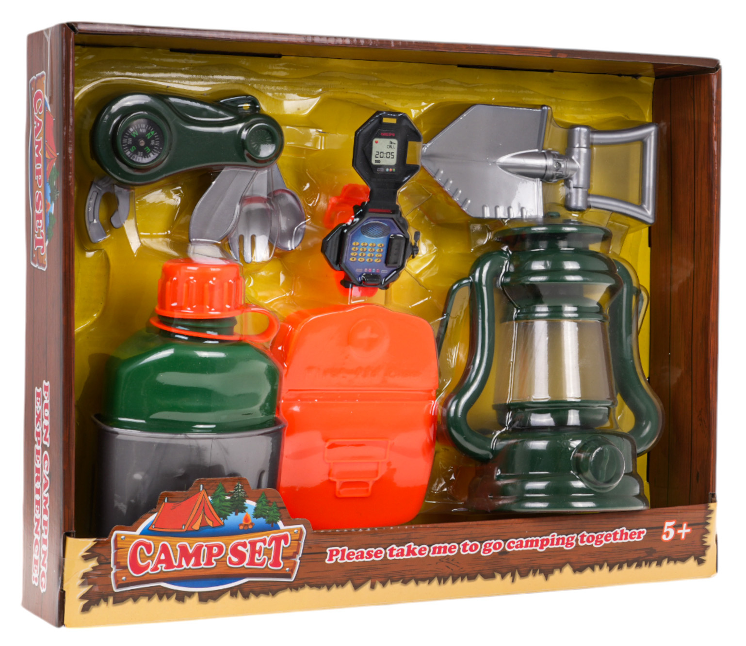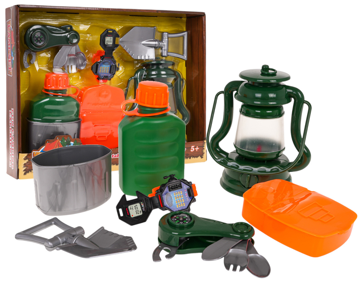 Kempingová sada pro děti od 3 let. Součástí sady je: lampa, polní láhev, příbor, hodinky, nádoba na potraviny a lopatka. S touto sadou se dítě bude cítit jako skutečný objevitel. Lampa je napájena bateriemi typu 3 x AG13 (v balení).