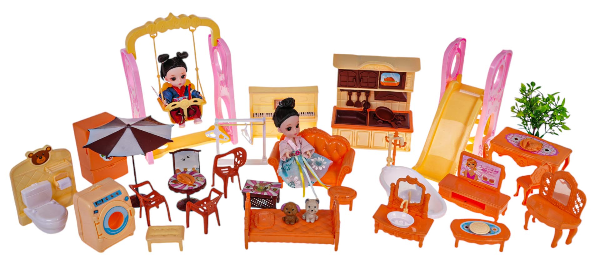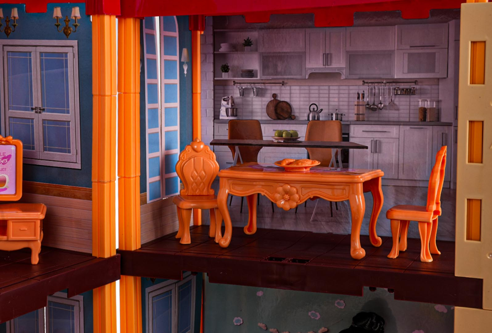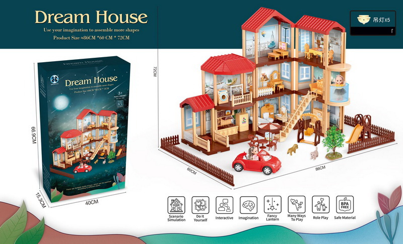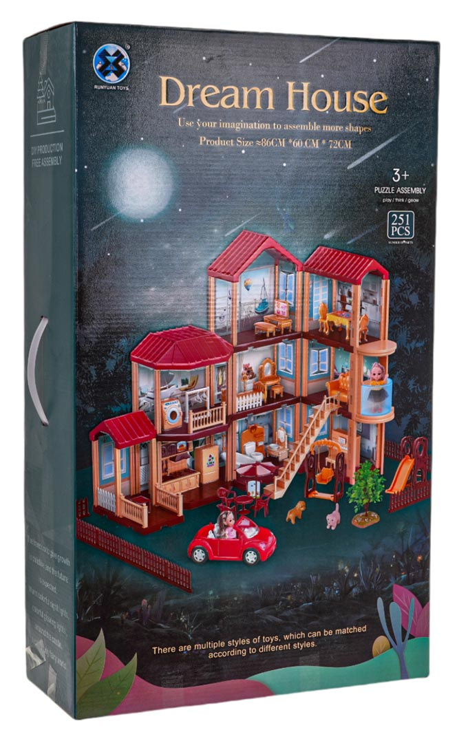 Kouzelný domeček pro panenky je určen pro děti od 3 let. Sada obsahuje až 251 prvků: domeček, nábytek, auto, doplňky a dvě panenky. Prvky sady jsou vyrobeny z nejkvalitnějšího plastu v živých barvách, které přitahují pozornost dítěte a povzbuzují ke hře. V domě najdeme takové místnosti jako: kuchyň, koupelna, hudební pokoj, obývací pokoj, ložnice, šatna, denní pokoj. Domek je oplocen plůtkem, před domkem se nachází dětská zóna s klouzačkou a houpačkou a odpočinková zóna se stolečkem, židličkami a slunečníkem. Domek má osvětlení, v sadě je 5 lamp napájených bateriemi typu AG13, celkem 15 kusů.