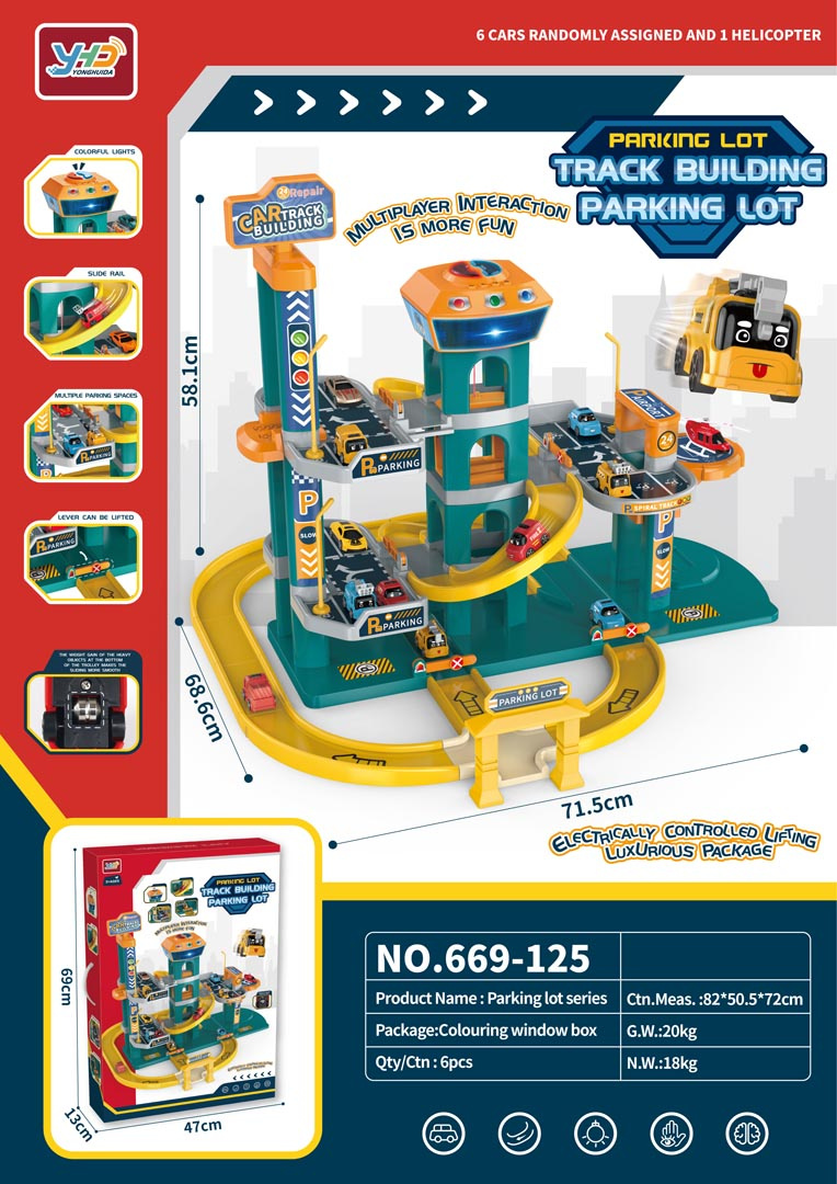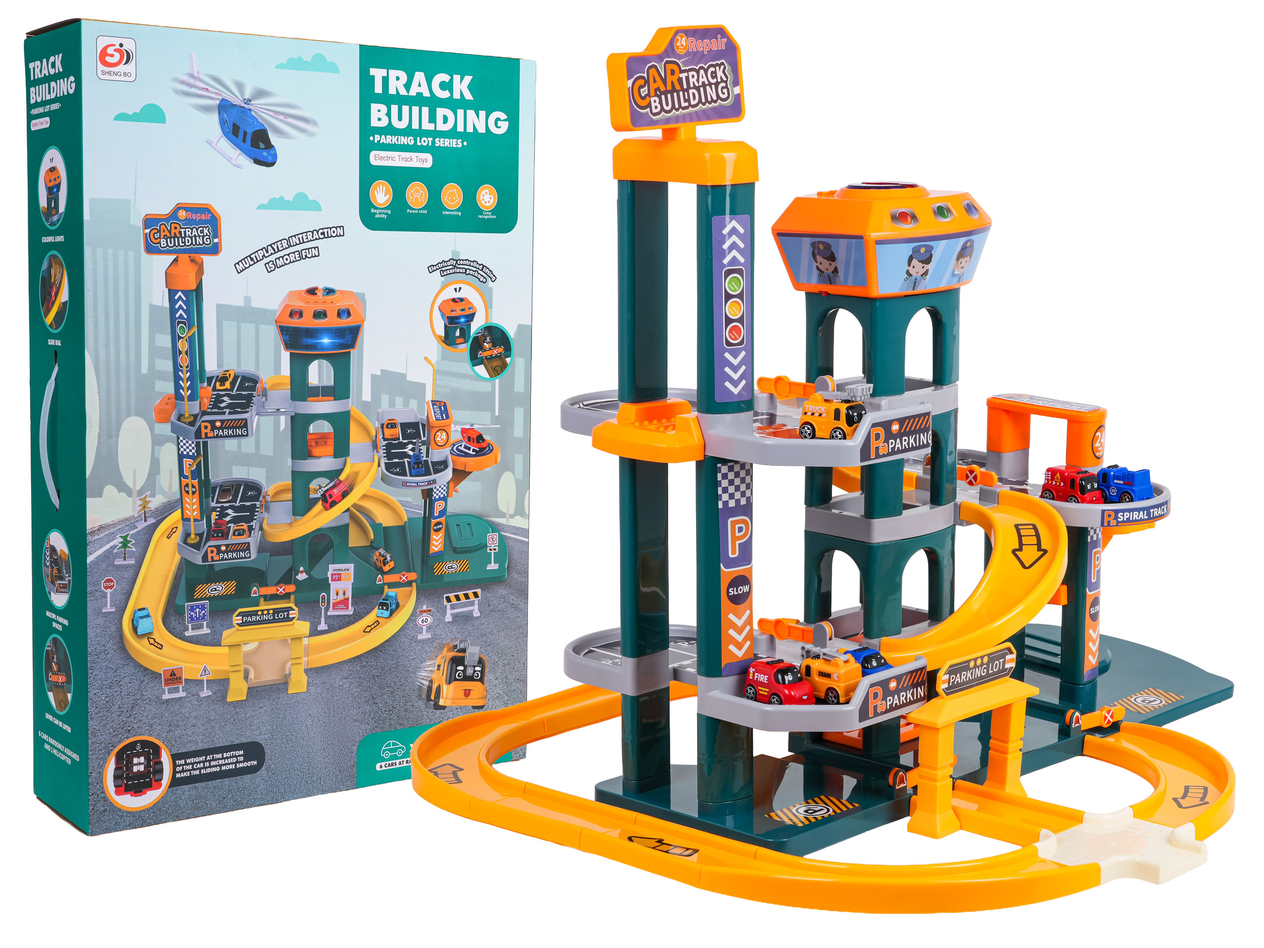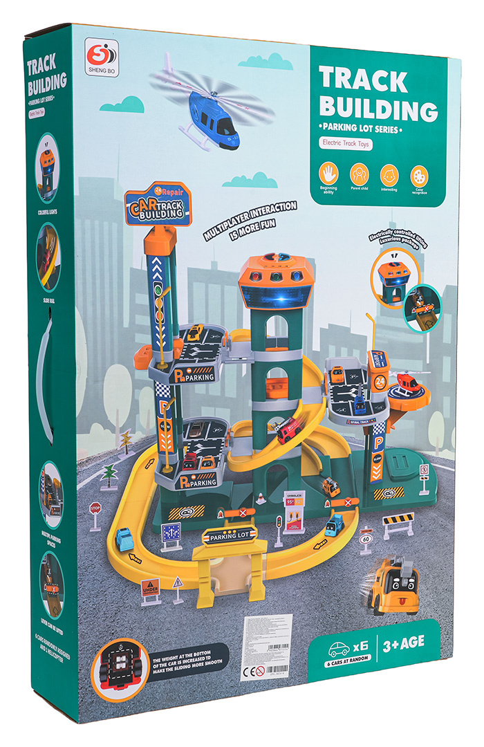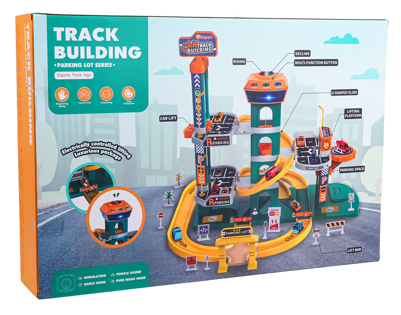 Skvěle provedené parkoviště s efektem zvuku a světla pro děti od tří let. Sada byla vyrobena z nejkvalitnějších materiálů bezpečných pro děti v živých barvách. Parkoviště má 2 úrovně, na kterých se nacházejí parkovací místa. Dostat se k nim můžeme pomocí elektrického výtahu napájeného bateriemi typu 3 x AA 1,5V (nejsou součástí balení). Na vrcholu výtahu se nachází panel zodpovědný za sjezd a výjezd a zvukové efekty ve formě veselých melodií, zvuků vozidel, sirény a světelné efekty jako blikající tlačítka vjezdu a sjezdu. Autíčka mohou sjíždět z kopce výtahem nebo skluzavkami. V sadě se nachází šest autíček a helikoptéra. Máme také četné lampy, dopravní značky a závory.