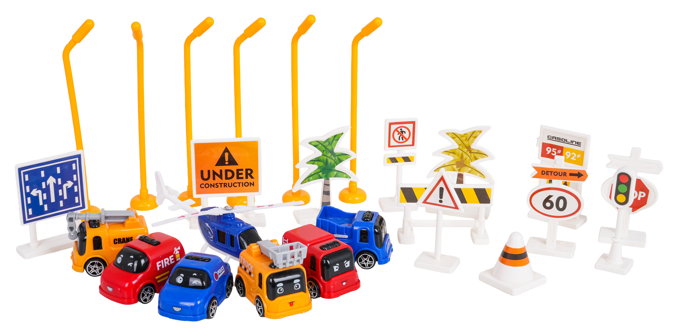- zvukové efekty: veselé melodie, zvuky, které vydávají vozidla,