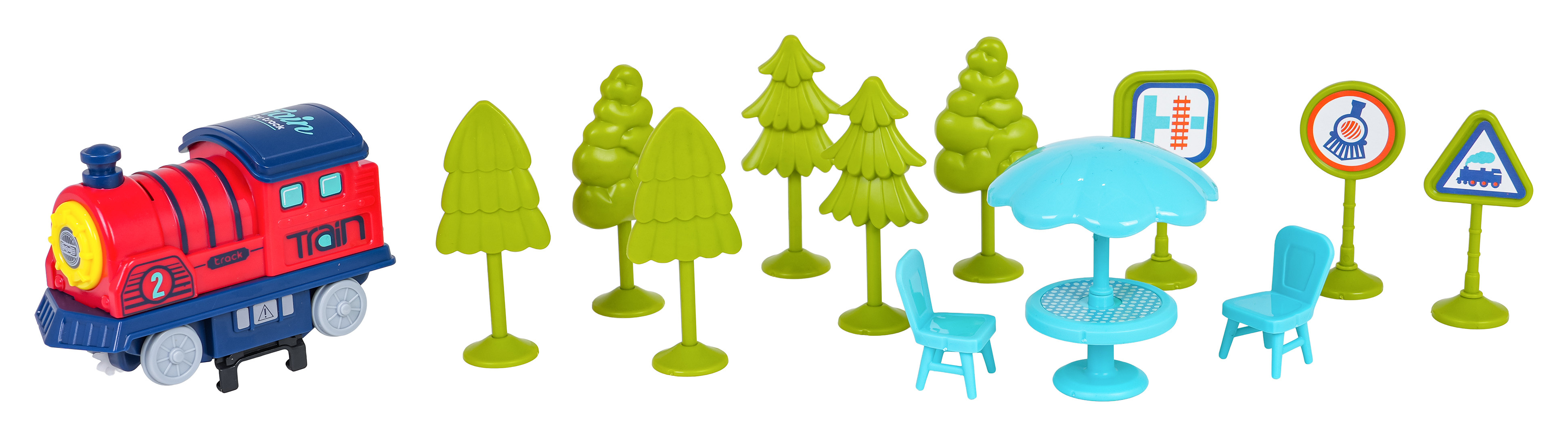 | | - konstrukční prvky dráhy, - most, - tunel, - stromky, značky, - dekorativní nálepky, - mašinka, - instrukce.