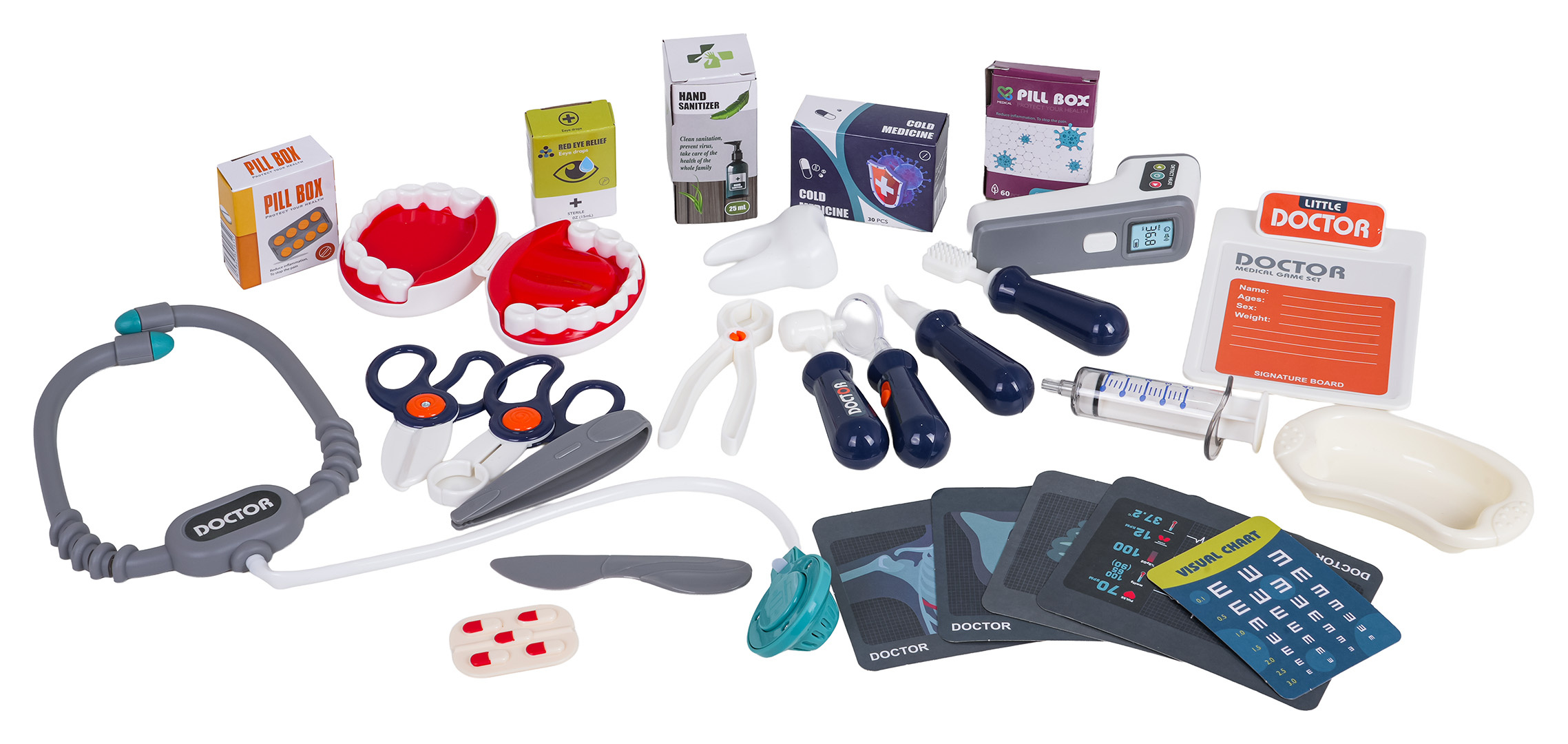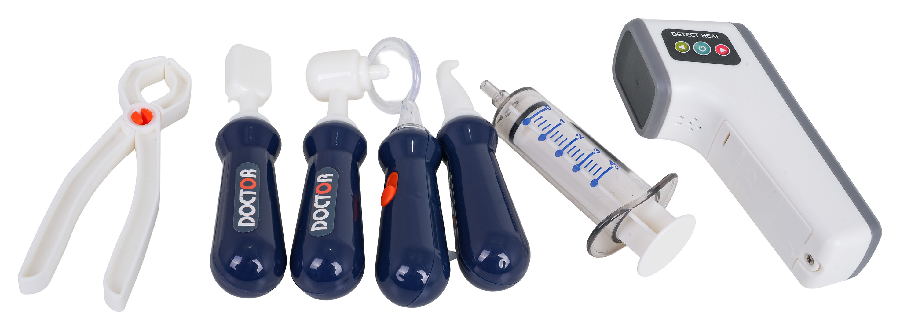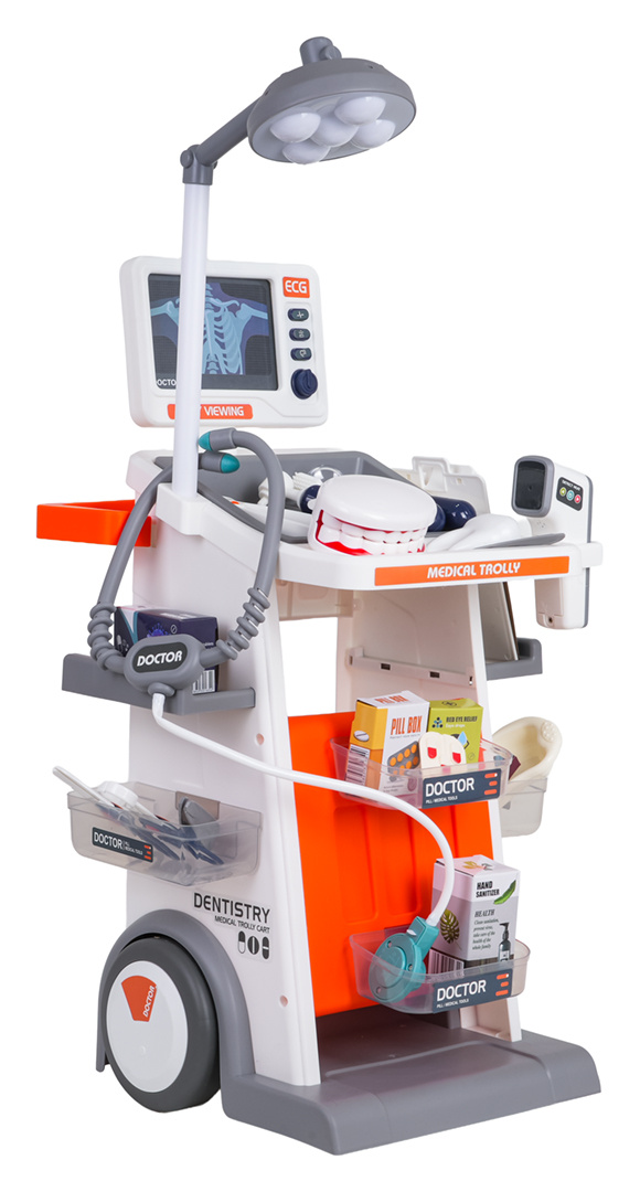Bohatě vybavená lékařsko-zubní sada s vozíkem, zvukovými a světelnými efekty pro děti od tří let. Všechny prvky sady jsou vyrobeny z plastu nejvyšší kvality. Lékařský vozík má velká kola, je snadno ovladatelný. Umístí na poličky všechny lékařské a zubní doplňky. Na vrchu vozíku je umístěn panel se zvukovými a světelnými efekty a vyměnitelnými nástavci pro fotografie s prosvětlením. Zubní zrcátko a teploměr mají podsvícení, a stetoskop zvuky tlukotu srdce. Lampička umístěná na vozíku je také podsvícená. Sada se skvěle prezentuje, vaše ratolest se může vžít do role lékaře. Lampa je napájena bateriemi typu 2 x AA 1,5V (nejsou součástí balení), teploměr bateriemi typu 2 x AAA 1,5 V (nejsou součástí balení), zubní zrcátko bateriemi typu 2 x AG10 (v balení), stetoskop bateriemi typu 2 x AG13 (v balení), panel ECG bateriemi typu 2 x AAA 1,5V (nejsou součástí balení).